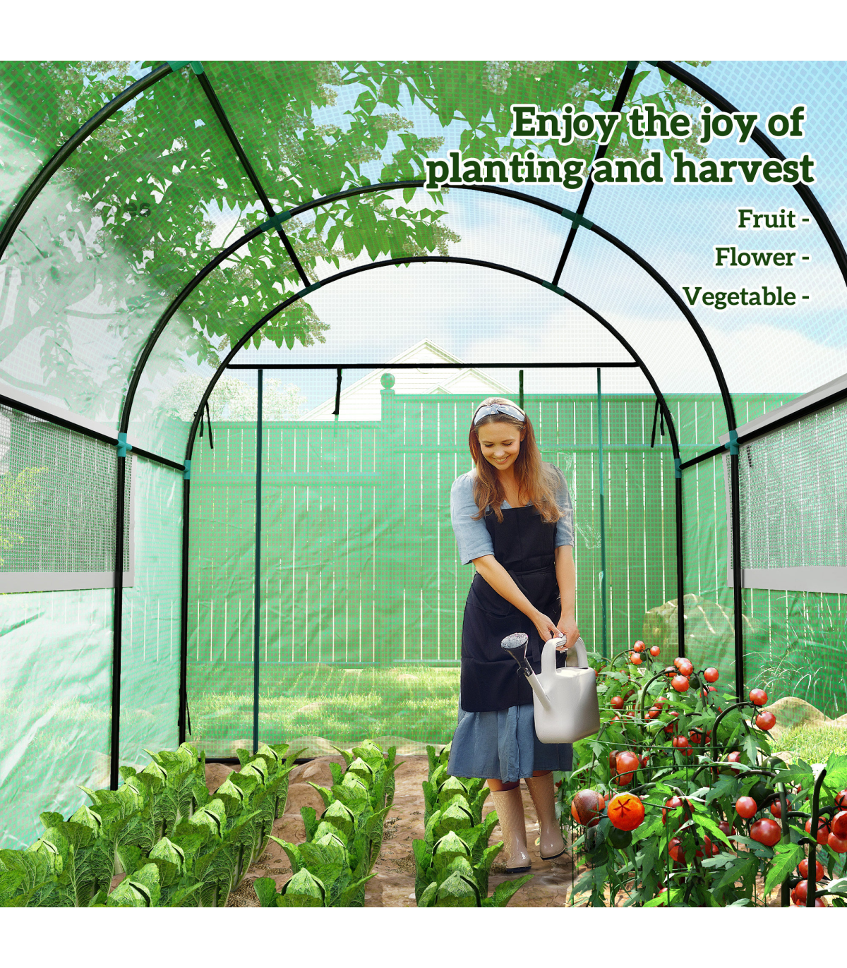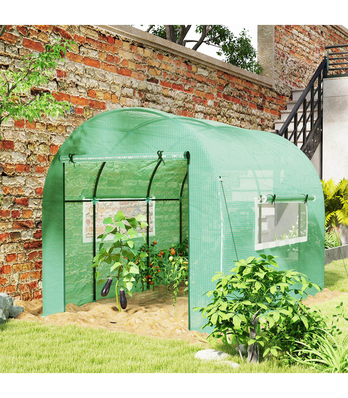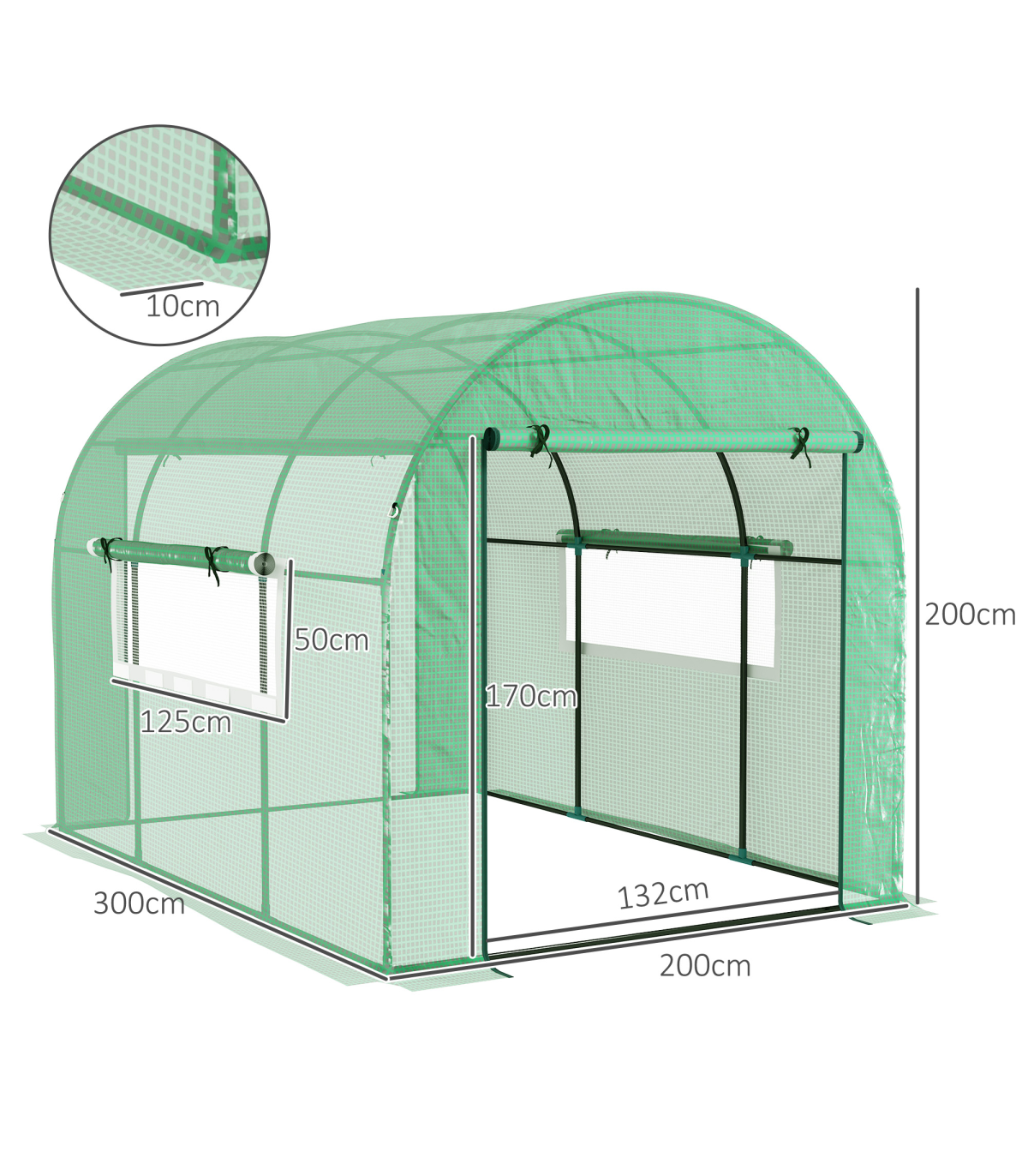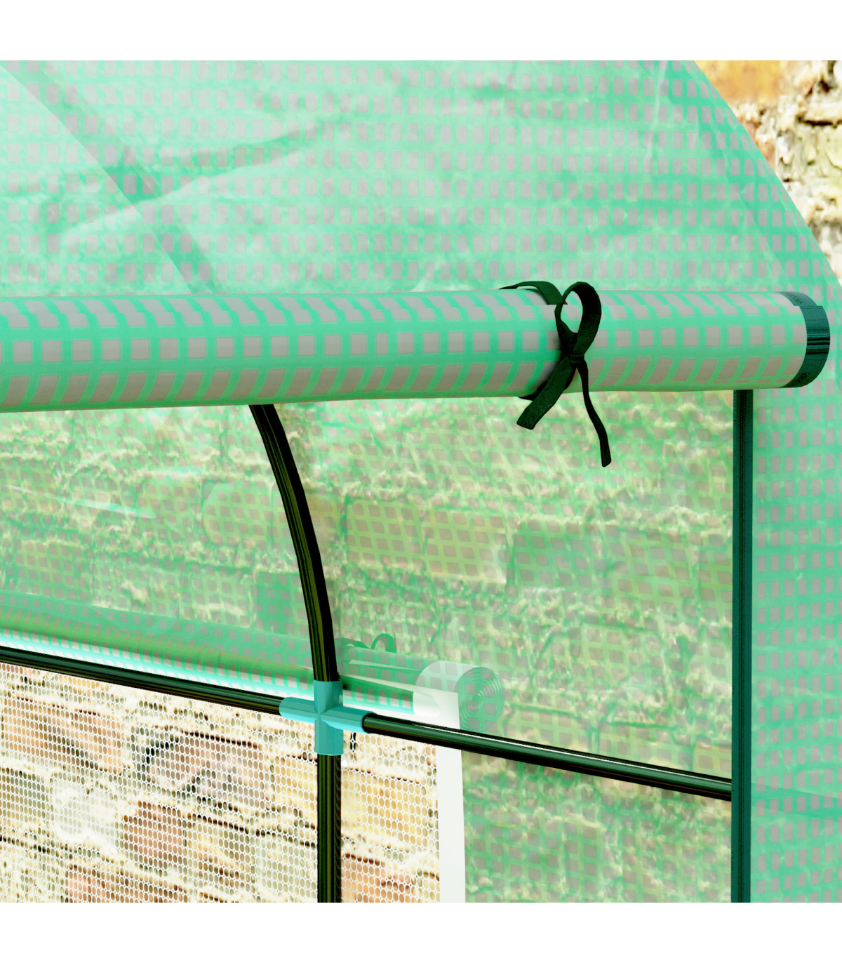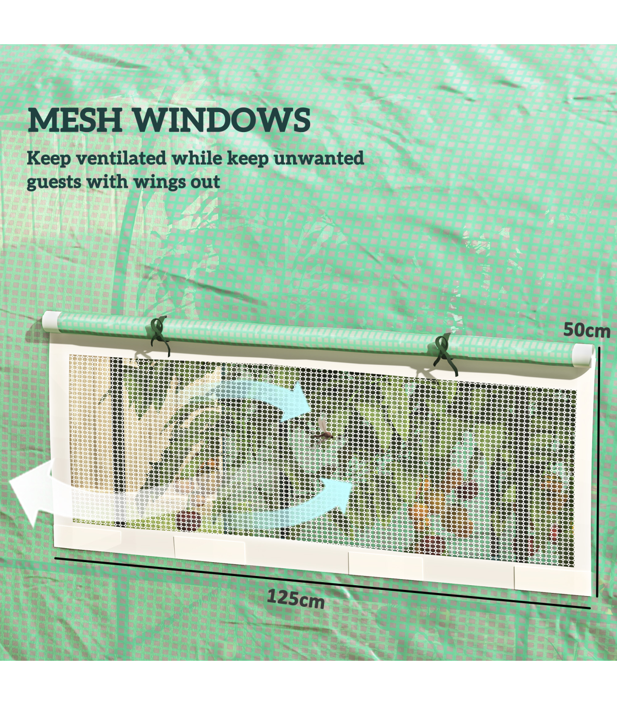 it rolls up and stays in place. Mesh windows allow fresh air inside whenever you want. A steel frame for a strong core, fitted with a protective plastic cover to create a safe shield from outside weather. Comes with ground stakes and guy ropes to secure to ground.