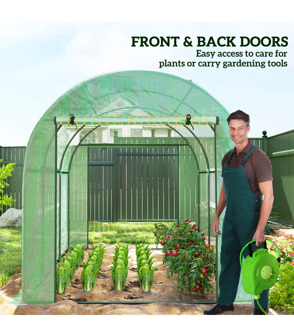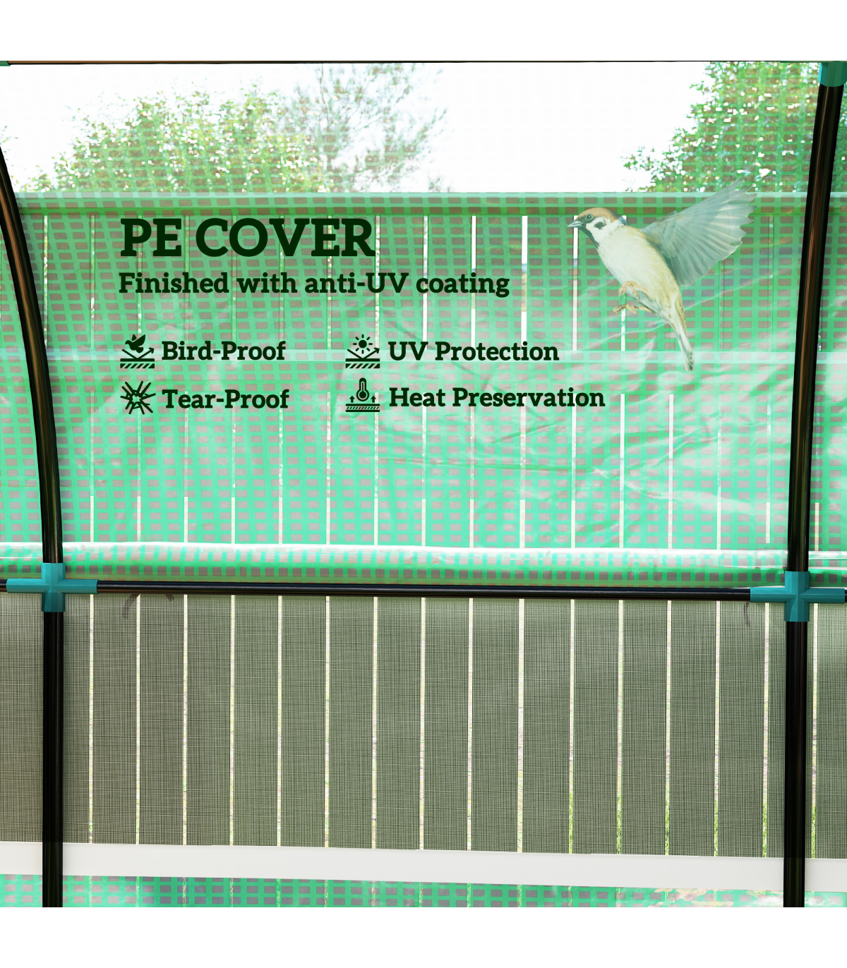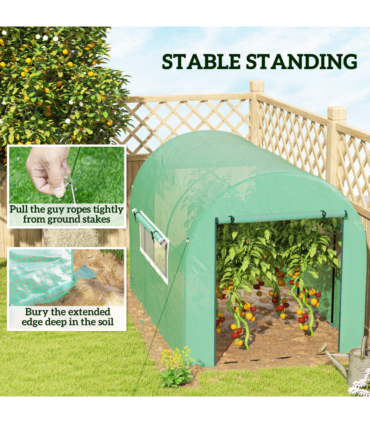 ● Extended cover edges to bury into soil. Ground stakes and guy ropes for extra stability