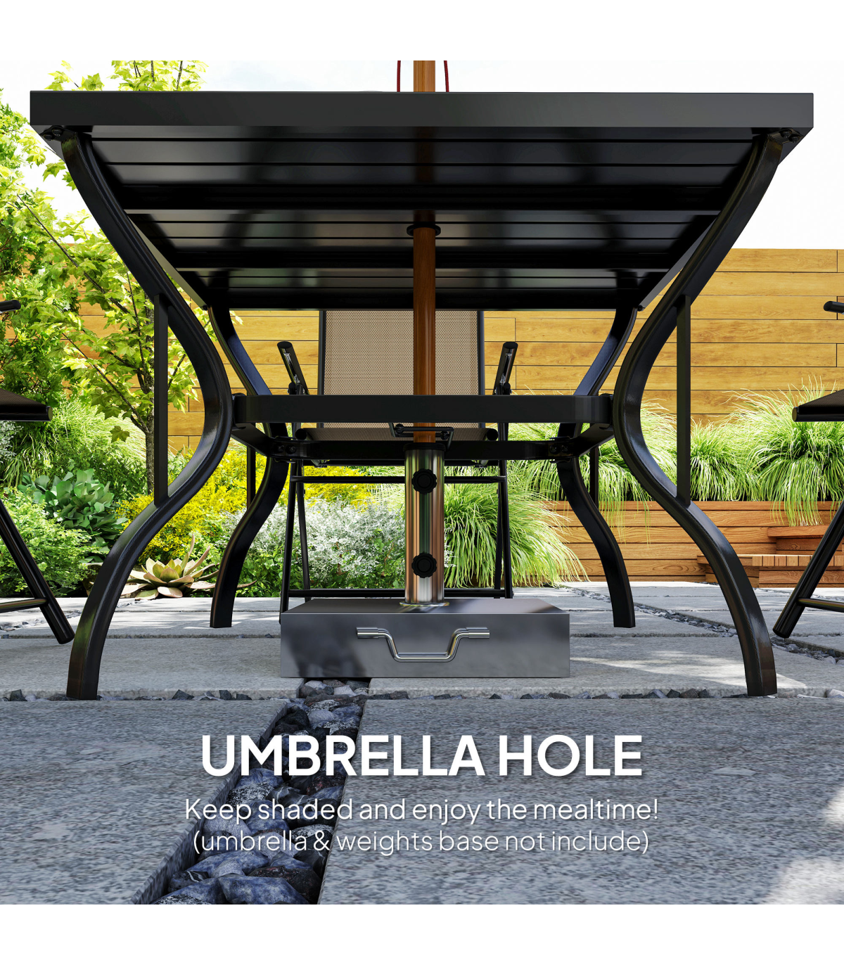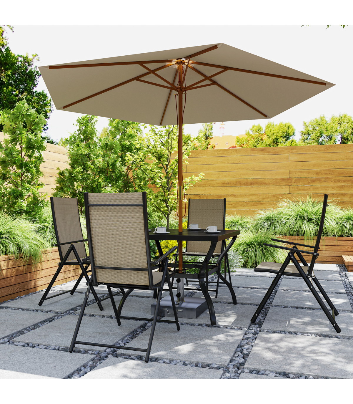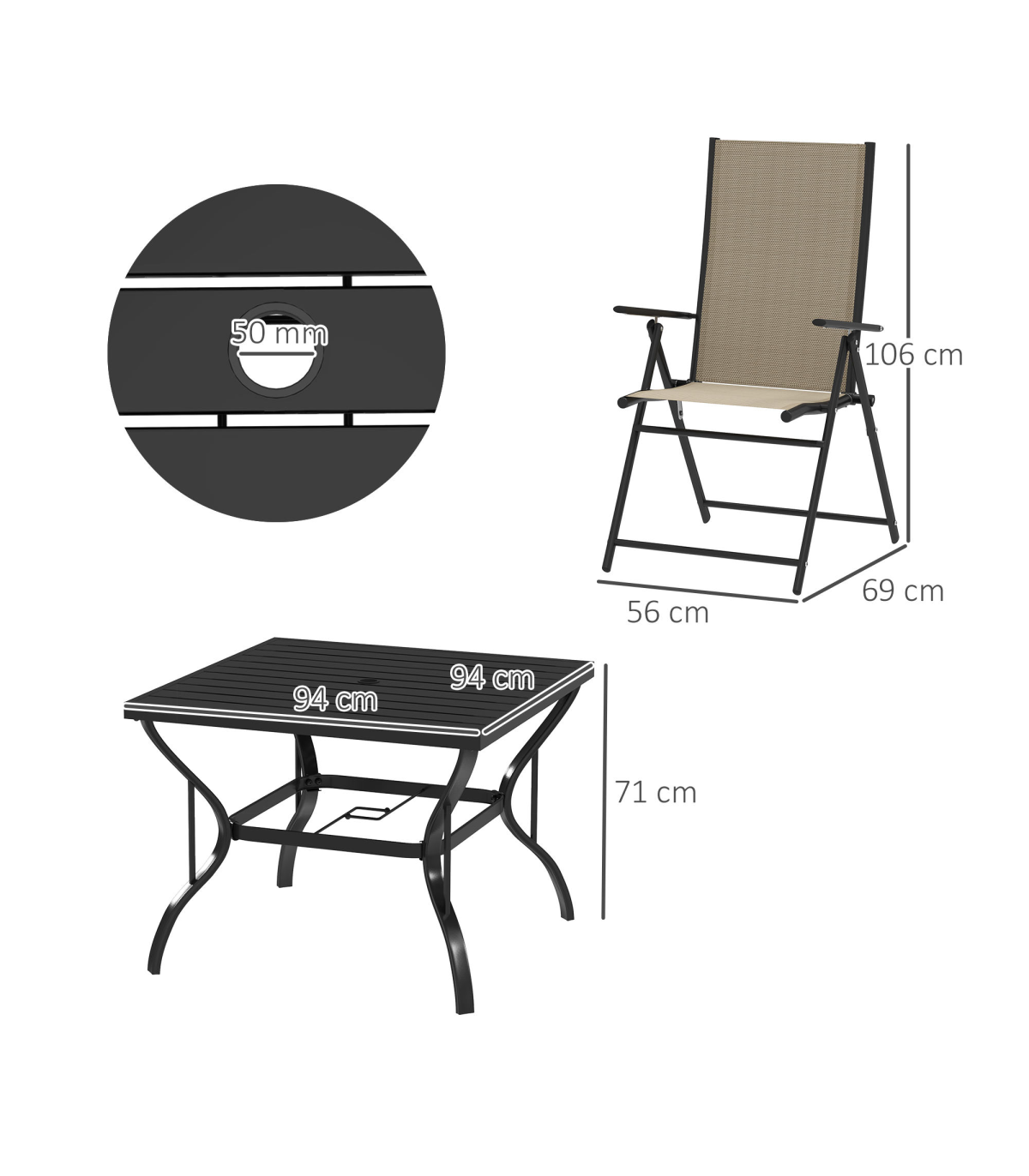 Simple, stylish outdoor dining with this Outsunny outdoor dining table and chairs set. It comes with a square dining table and four matching folding chairs: plenty of room for you and company. The powder coated galvanised steel frames mean the patio table and chairs are strong. The folding chairs save space and come with breathable texteline seats for comfort. This outdoor garden furniture set is complete with Φ50mm hole in the table to hold a parasol umbrella in place.