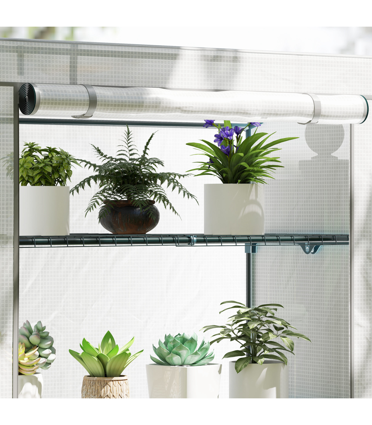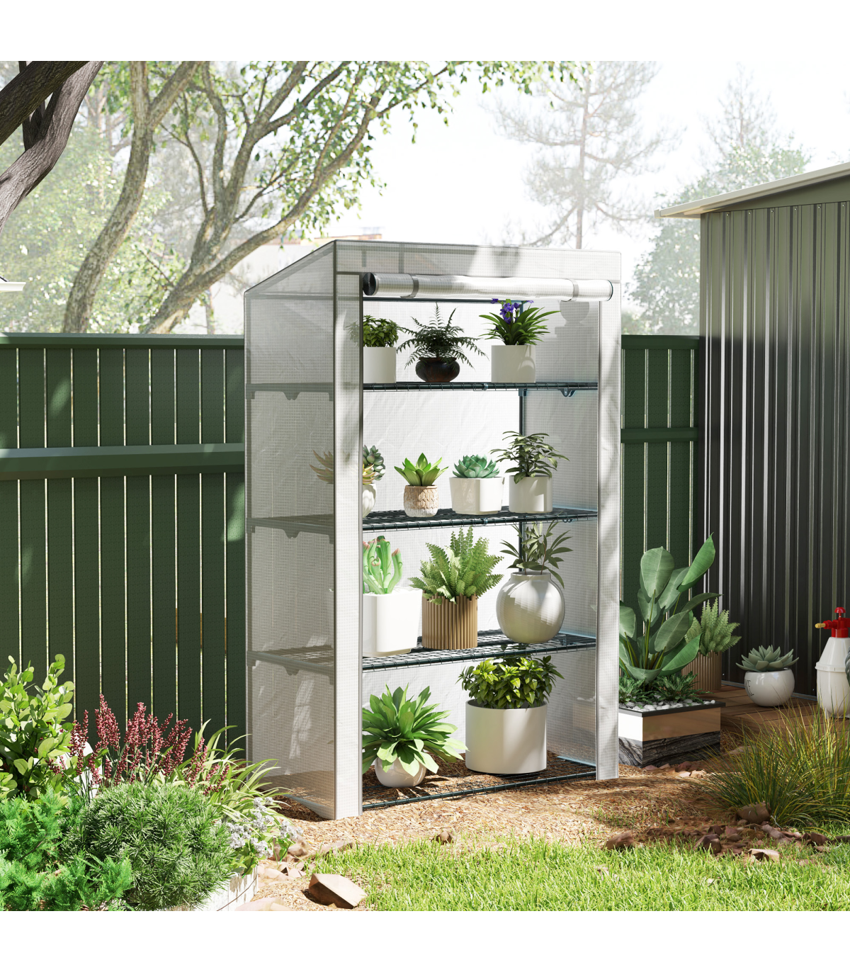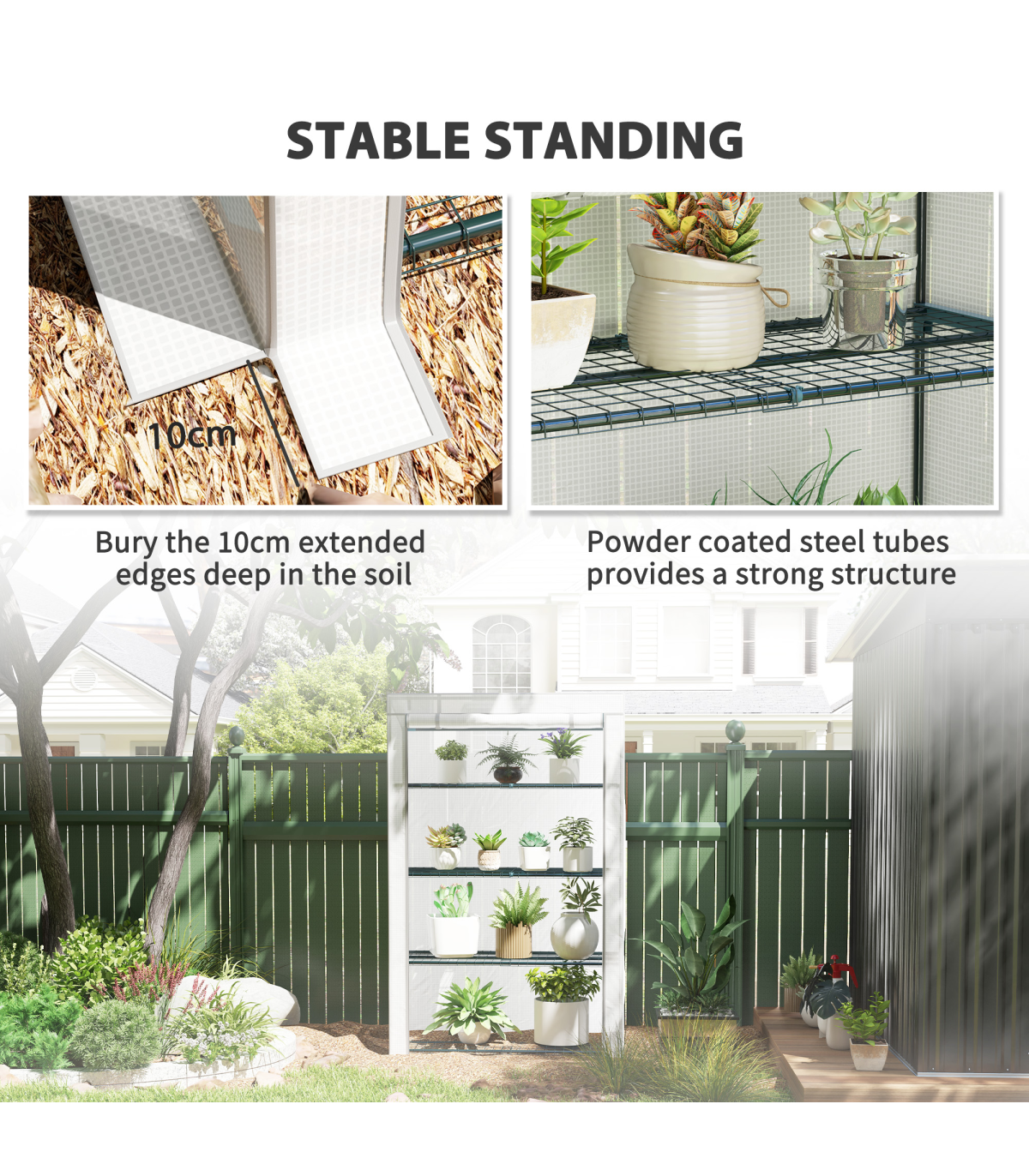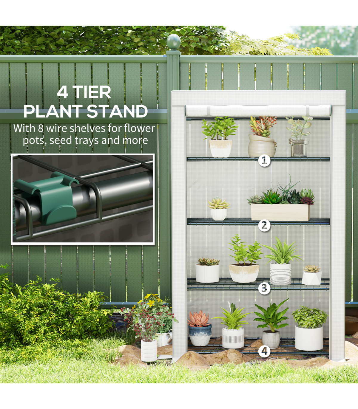 Transform your gardening with the Outsunny Garden Greenhouse! This four-tiered lean-to greenhouse with shelves offers lots of space for flower pots and seed trays, enveloped by a 140g/m² PE cover that shields plants from UV damage while bathing them in sunlight. Plus, the roll-up zipped door ensures easy access and optimal ventilation. Great for any small greenhouse enthusiast looking to create a lush portable garden oasis!