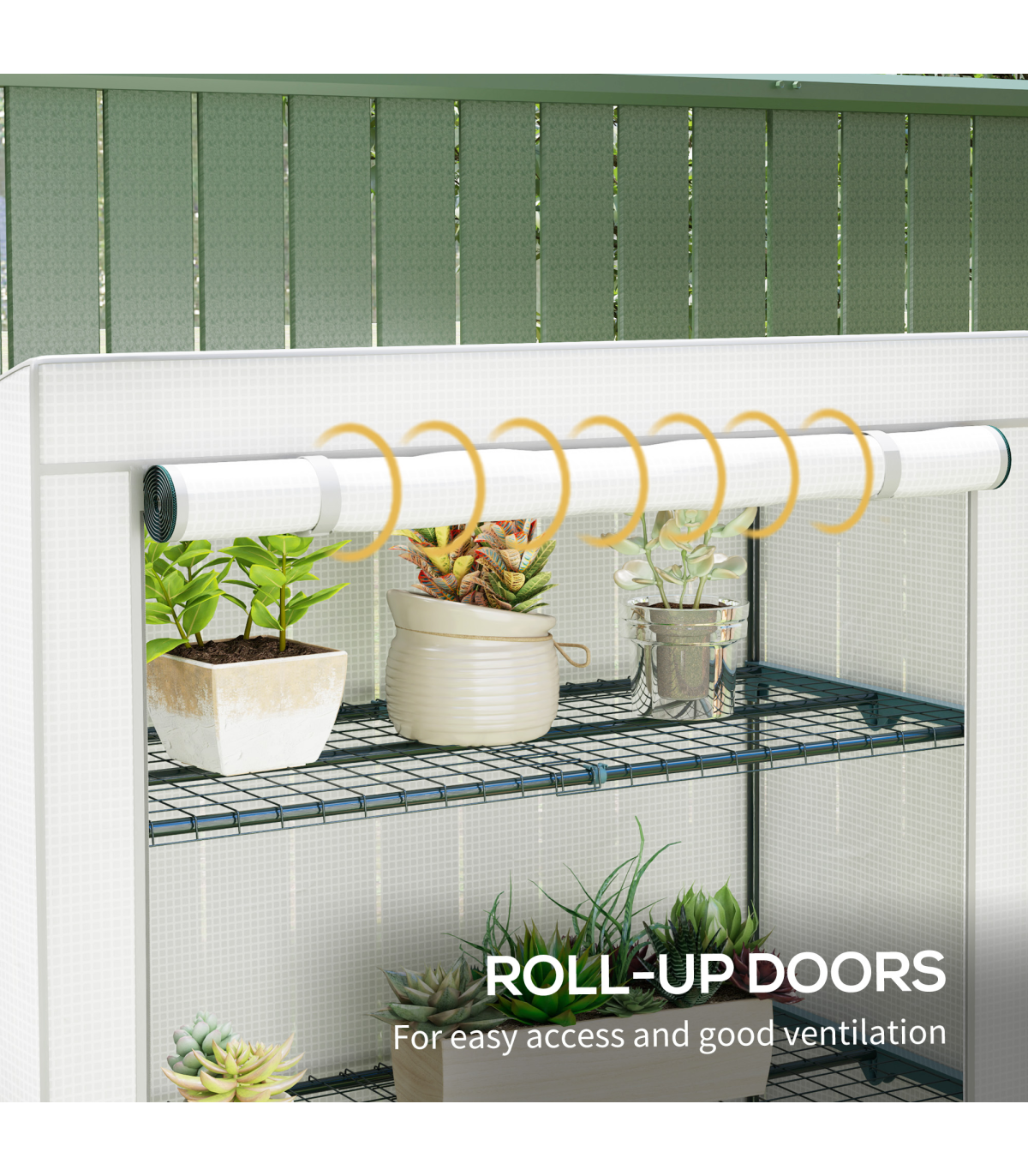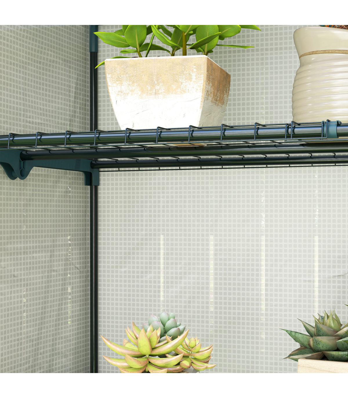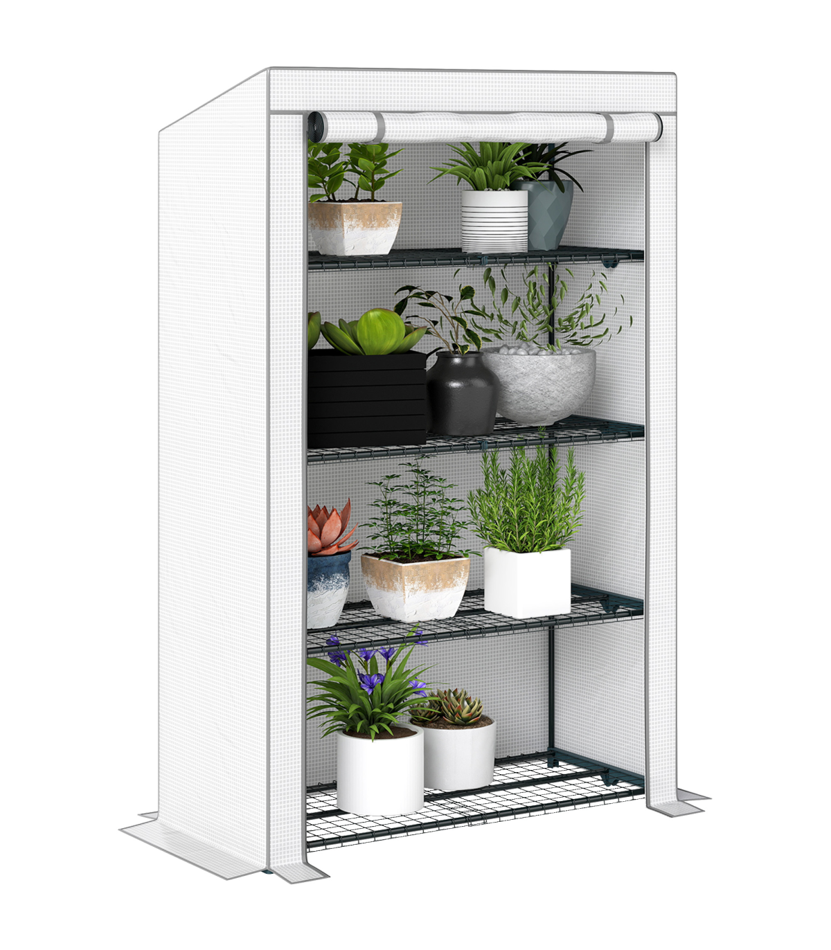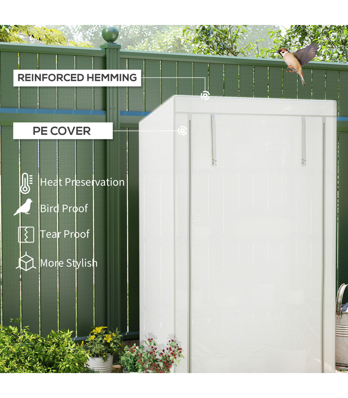 Transform your gardening with the Outsunny Garden Greenhouse! This four-tiered lean-to greenhouse with shelves offers lots of space for flower pots and seed trays, enveloped by a 140g/m² PE cover that shields plants from UV damage while bathing them in sunlight. Plus, the roll-up zipped door ensures easy access and optimal ventilation. Great for any small greenhouse enthusiast looking to create a lush portable garden oasis!