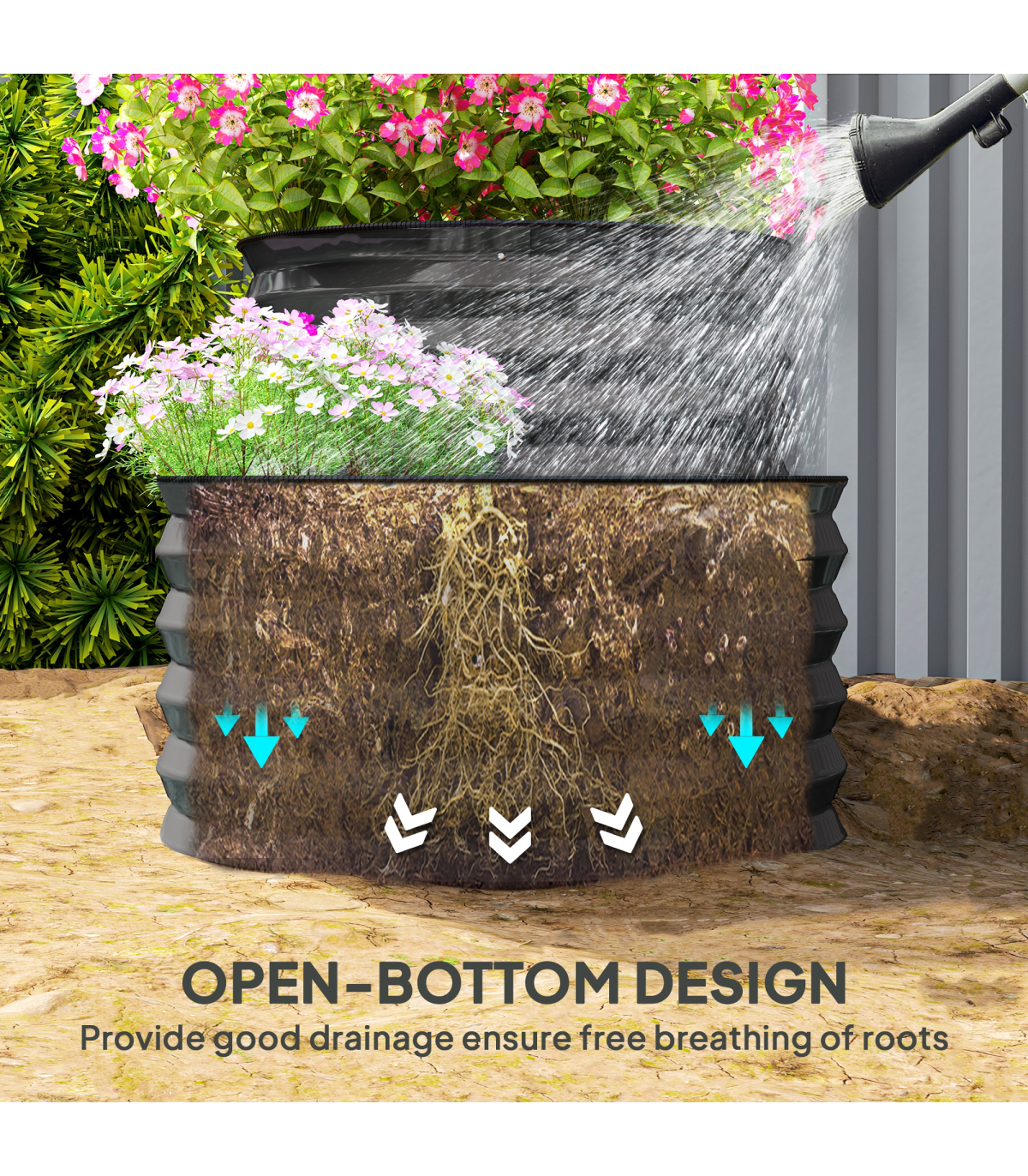 ● Open bottom: direct contact with soil for great growth. No water build-up