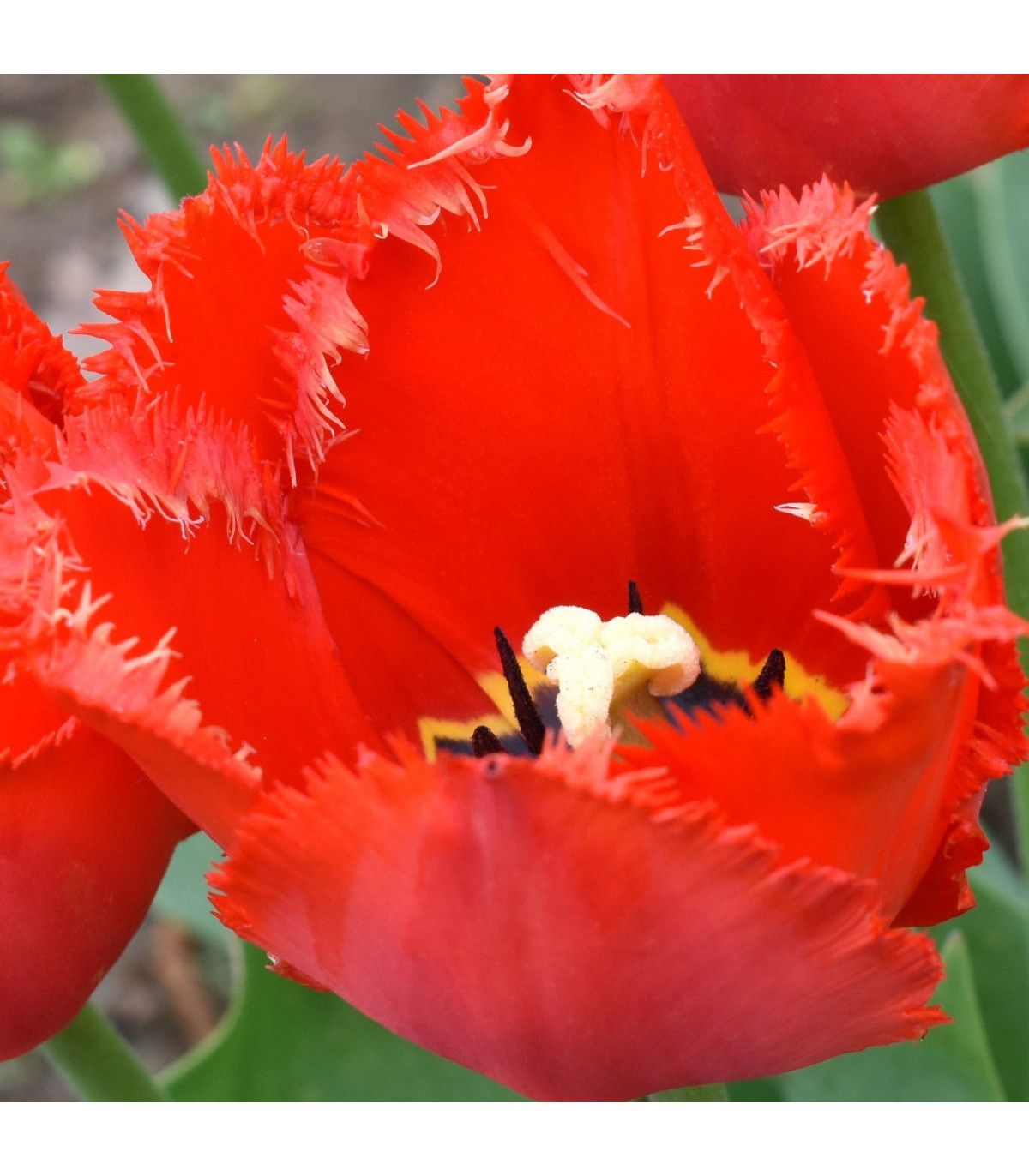 A crimson red tulip with a frilly fringe appearance making it almost look like it sparkles in the sun