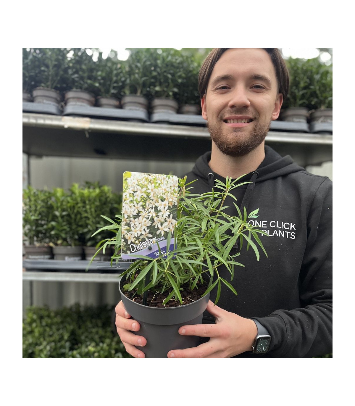 Choisya ternata ‘Aztec Pearl’ is a compact evergreen shrub known for its delicate, glossy foliage and abundant clusters of fragrant white flowers that bloom in late spring to early summer. The feathery, silver-green leaves provide a striking contrast to the pure white blooms, which attract pollinators and add year-round interest to the garden. This variety is perfect for smaller gardens, containers, or mixed borders, offering both ornamental value and a sweet citrus scent.