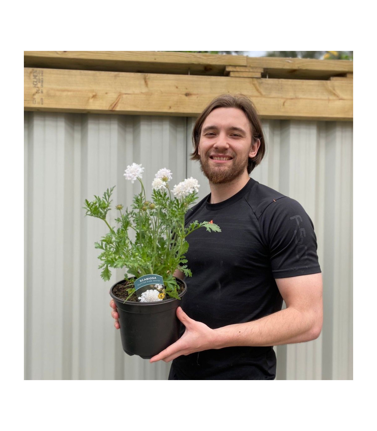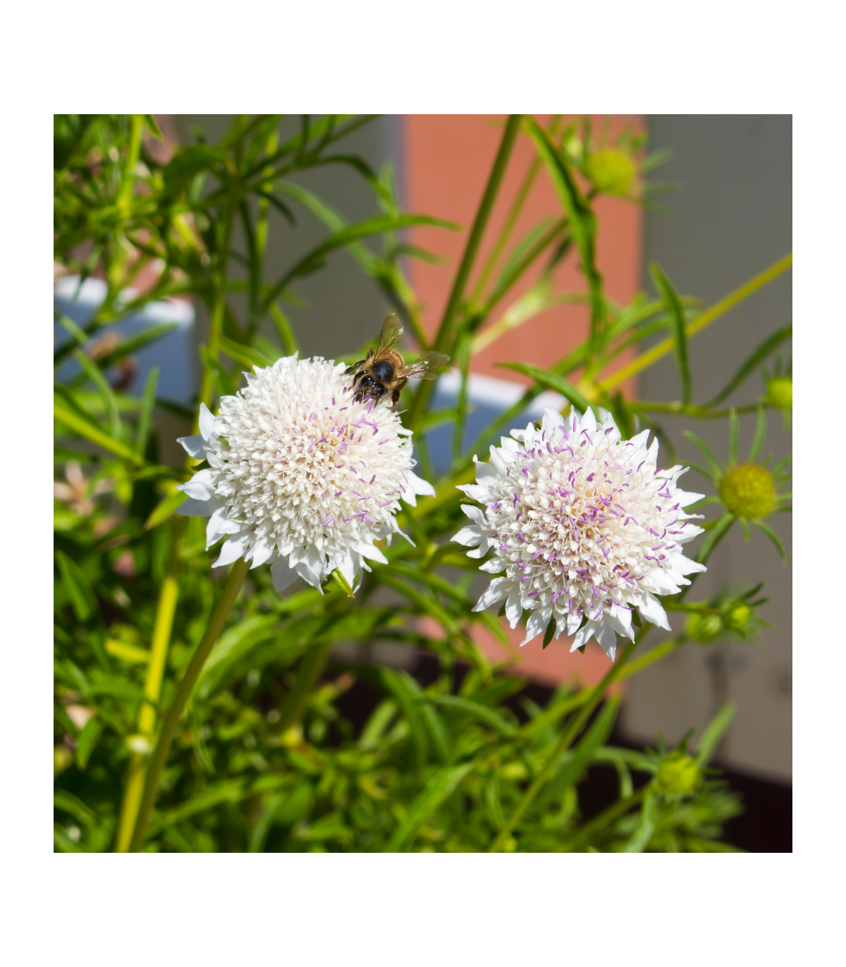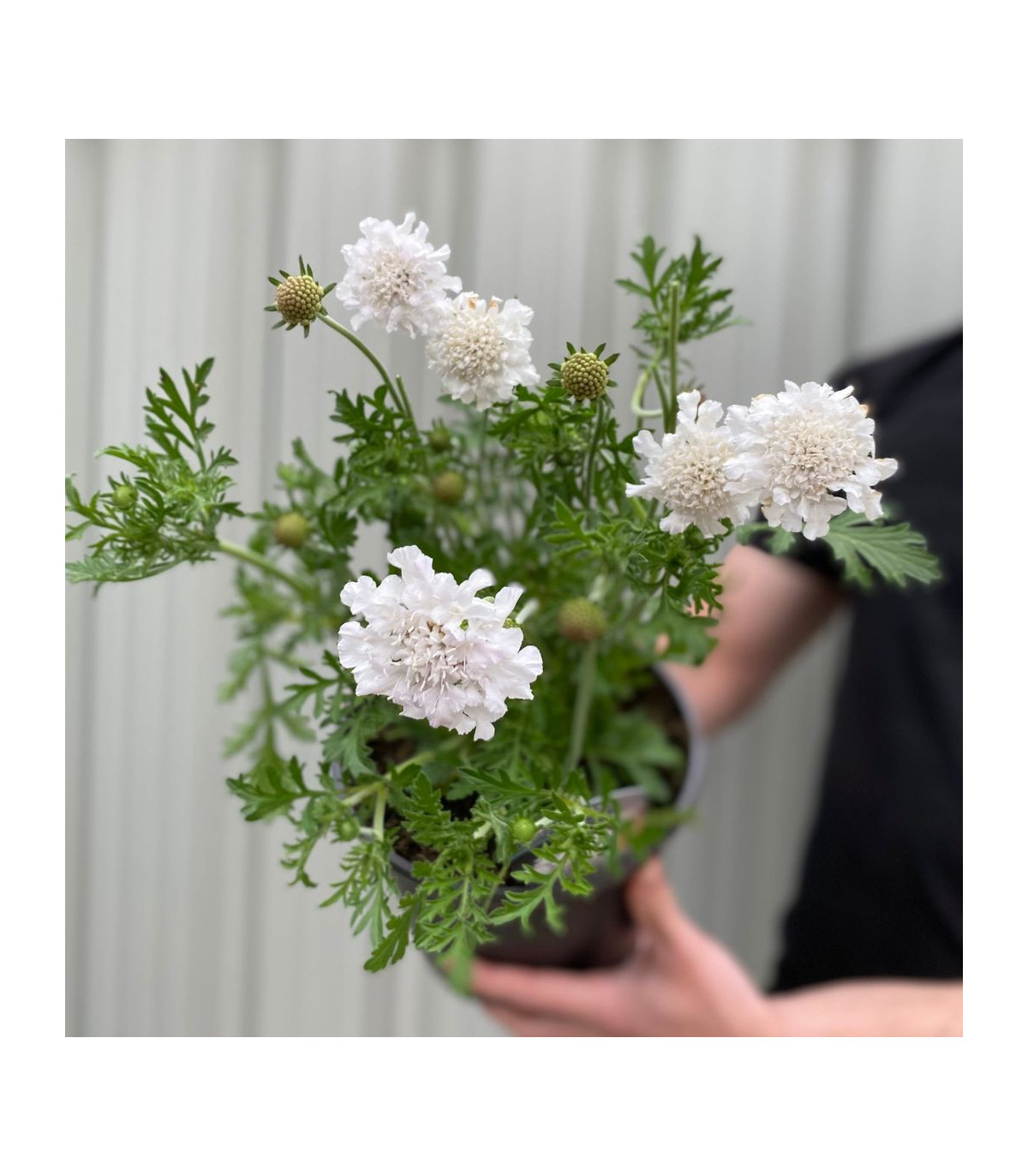 Scabious is a graceful perennial that showcases pristine white, pincushion-like flowers on slender, airy stems from late spring to autumn. Its compact, mound-forming habit and delicate green foliage make it an excellent choice for borders, cottage gardens, or containers. Thriving in full sun and well-drained soil, this variety is low-maintenance and highly attractive to pollinators, bringing bees and butterflies into your garden. Perfect for adding a touch of elegance and softness, 'Flutter Pure White' blooms continuously with regular deadheading, making it a standout in any planting scheme.