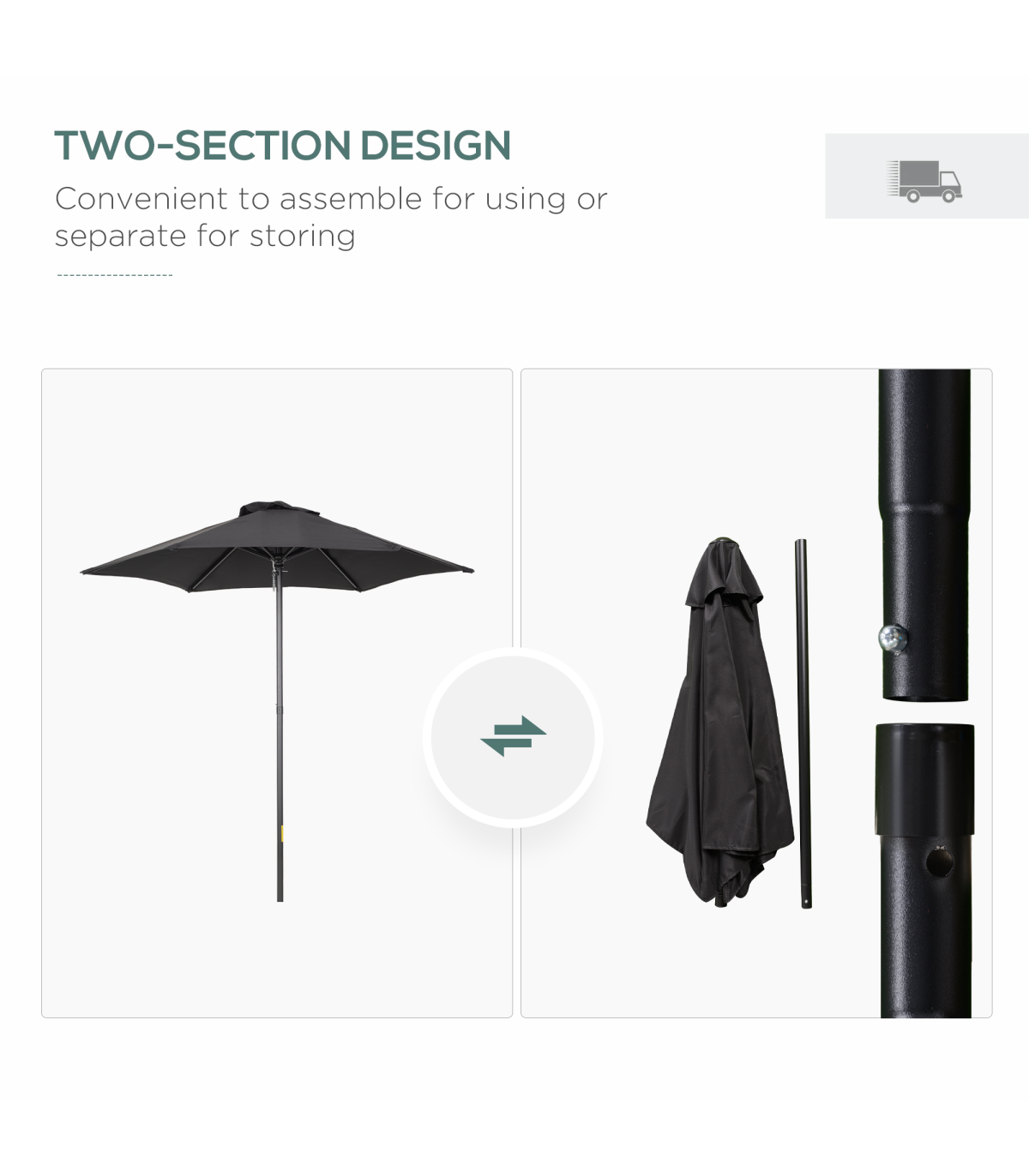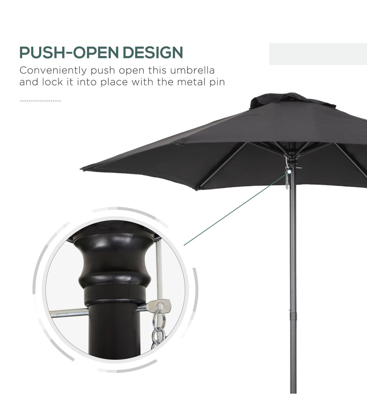 ?1.96m outdoor parasol is large, provide plenty of shelter from the sun Aluminium frame to keep parasol upright, connected to the canopy with six steel ribs Perfect for every garden, patio and outdoor area Conveniently opens with the push button, locks into place with the metal pin Portable, foldable and lightweight Base is not included, do not leave open in extreme weather