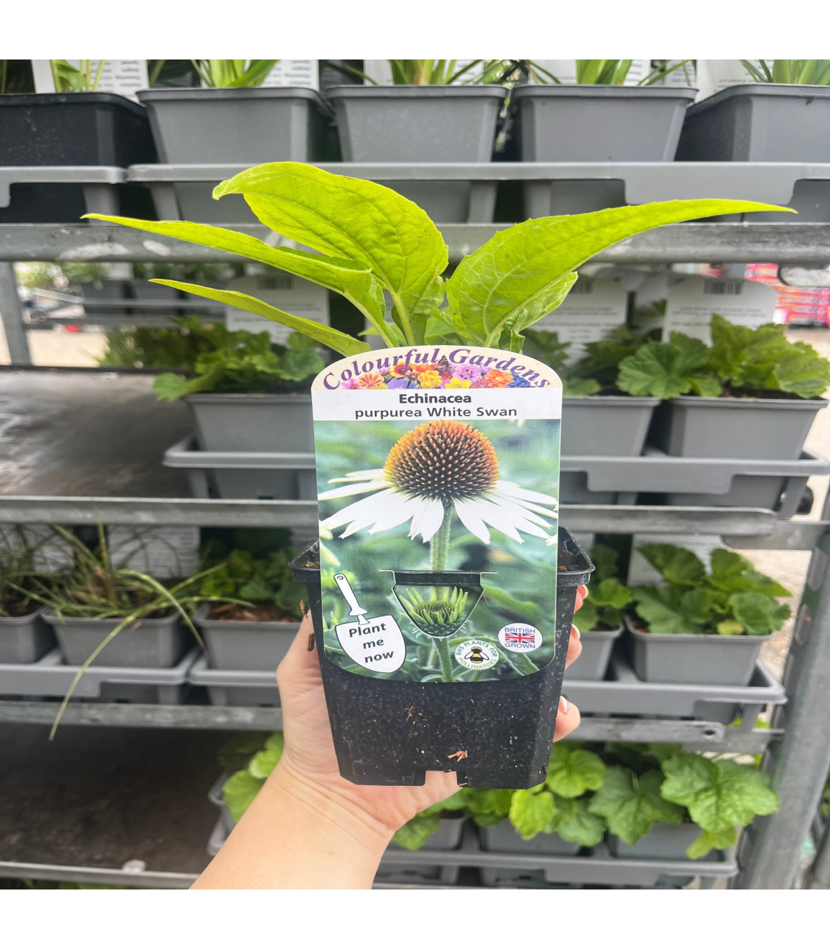 Echinacea purpurea 'White Swan' is a striking perennial that features elegant, pure white daisy-like flowers with a prominent, green central cone. The petals are broad and graceful, creating a soft, serene display that contrasts beautifully with the dark green foliage. Flowering from mid-summer to autumn, 'White Swan' thrives in full sun and well-drained soil, making it ideal for borders, cottage gardens, or naturalized landscapes. This variety attracts pollinators such as bees and butterflies, adding both beauty and ecological value to your garden. With its graceful blooms and long-lasting presence, Echinacea 'White Swan' is perfect for creating a refined, tranquil focal point in your garden.