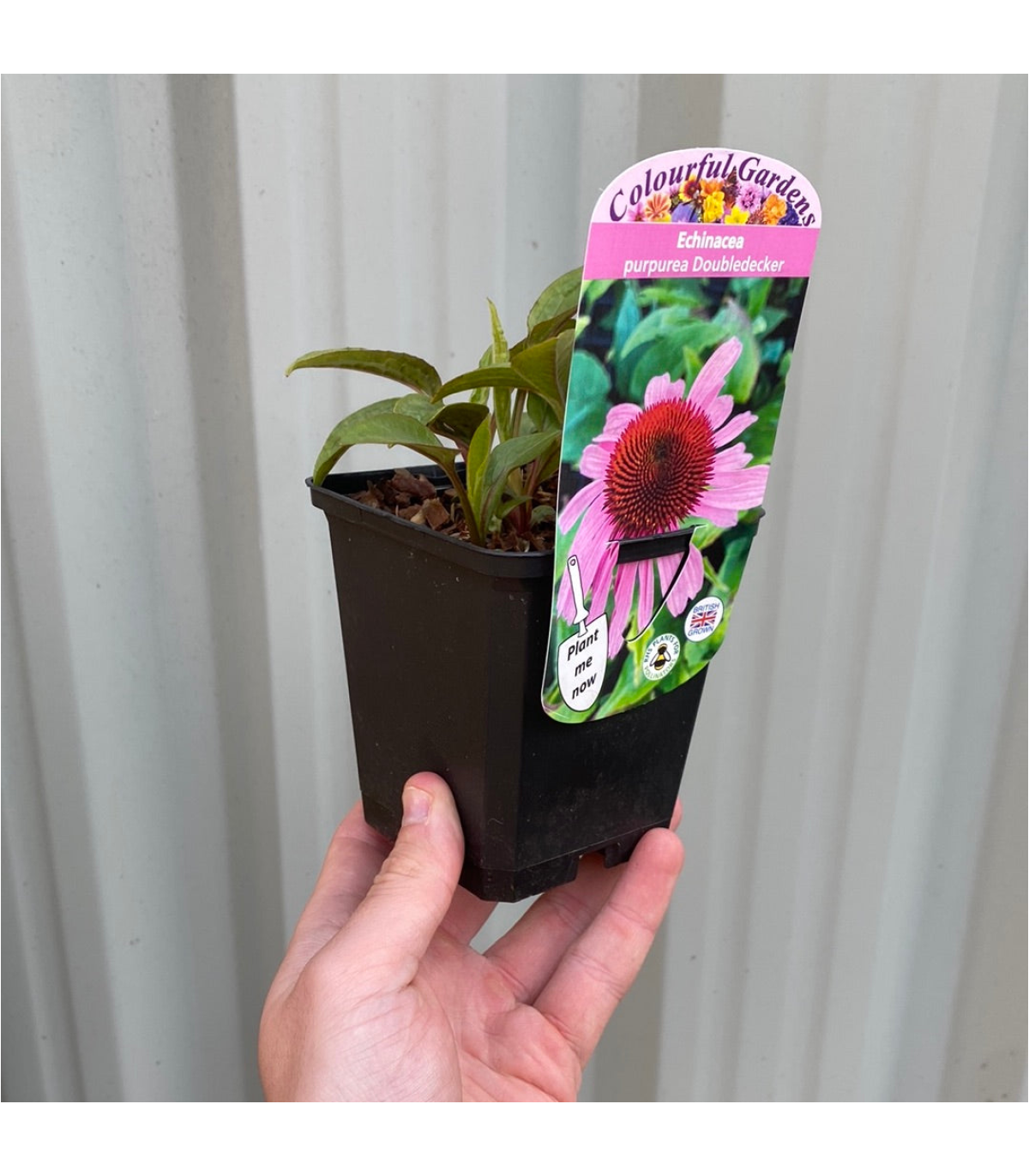 Echinacea purpurea 'Double Decker' distinguished by its unique double-layered blooms. This perennial beauty showcases large, daisy-like flowers with striking, fully double petals in vibrant shades of pink and purple. The distinctive "double decker" appearance creates a dramatic and eye-catching display in the garden, adding a touch of charm and whimsy to borders, cottage gardens, and wildflower meadows. 'Double Decker' blooms prolifically from mid-summer to early autumn, attracting pollinators like bees and butterflies with its abundant nectar-rich blossoms. With its resilience to various growing conditions and its long-lasting flowers, this variety is a beloved choice among gardeners seeking to create a vibrant and dynamic floral tapestry in their outdoor spaces.