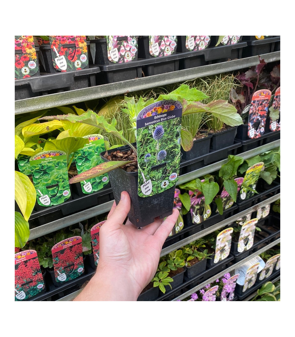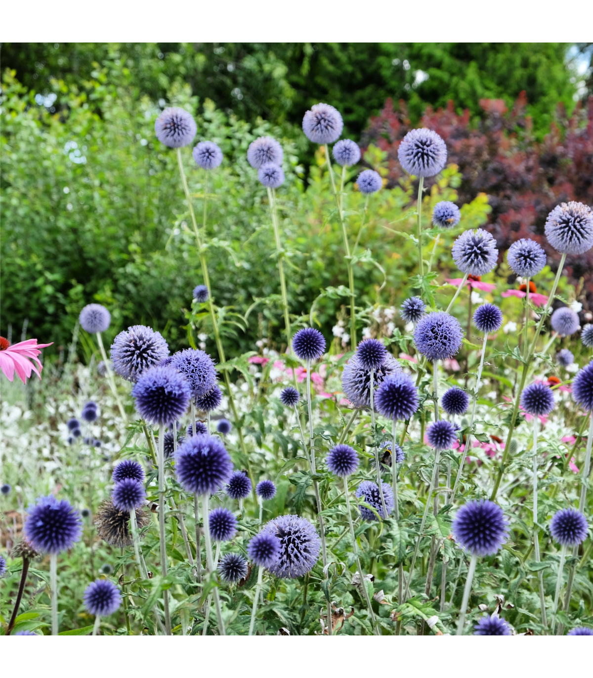 Echinops bannaticus 'Blue Globe' is an eye-catching perennial, known for its striking, spherical blue flower heads and bold, architectural form. This thistle-like plant adds a distinctive, textured element to the garden with its unique globes of steel-blue flowers held above silvery-green, deeply lobed foliage. Perfect for sunny borders, 'Blue Globe' attracts pollinators and adds visual interest throughout the summer months.
