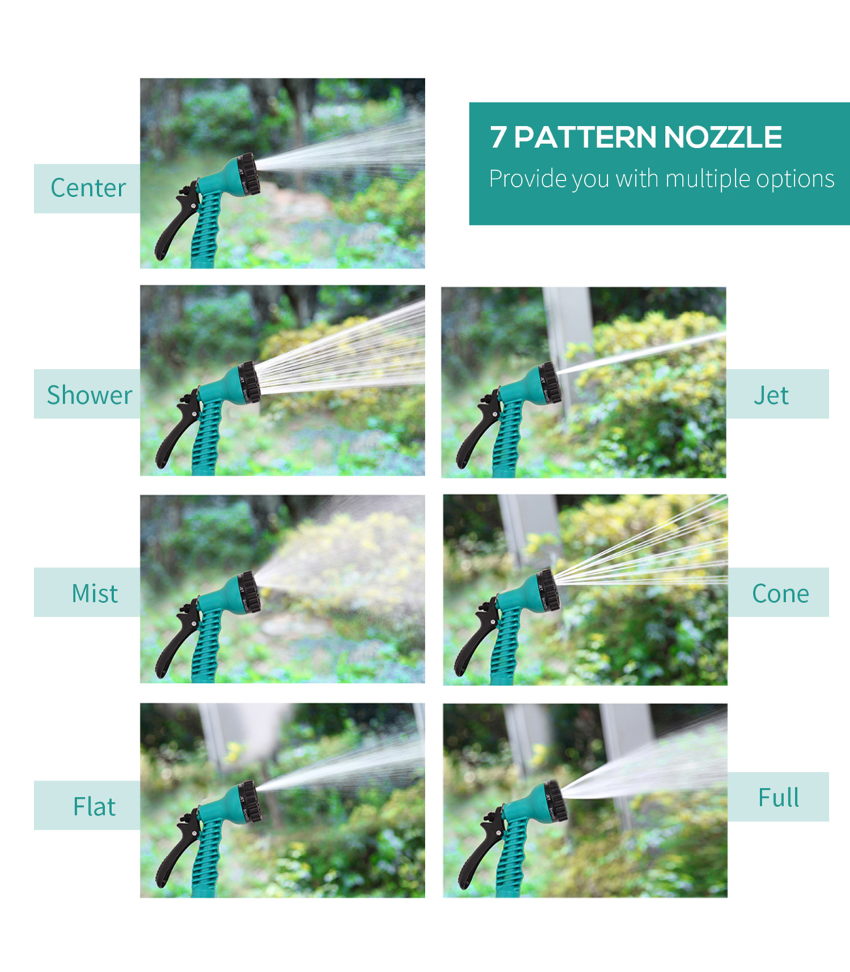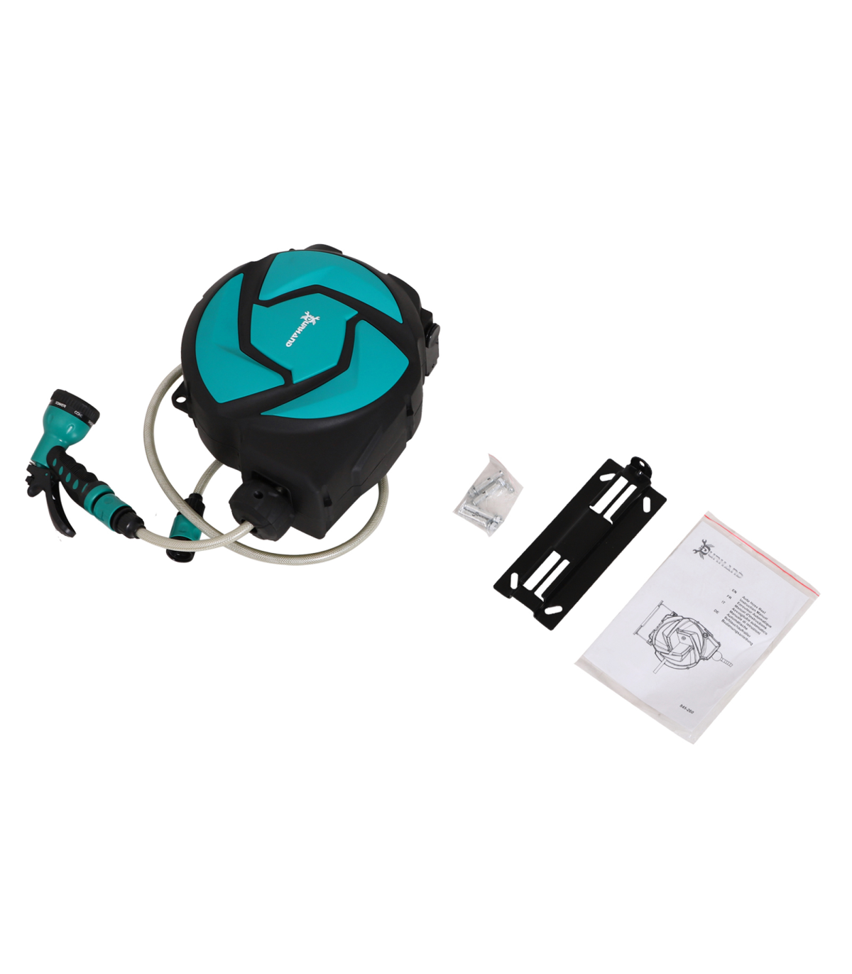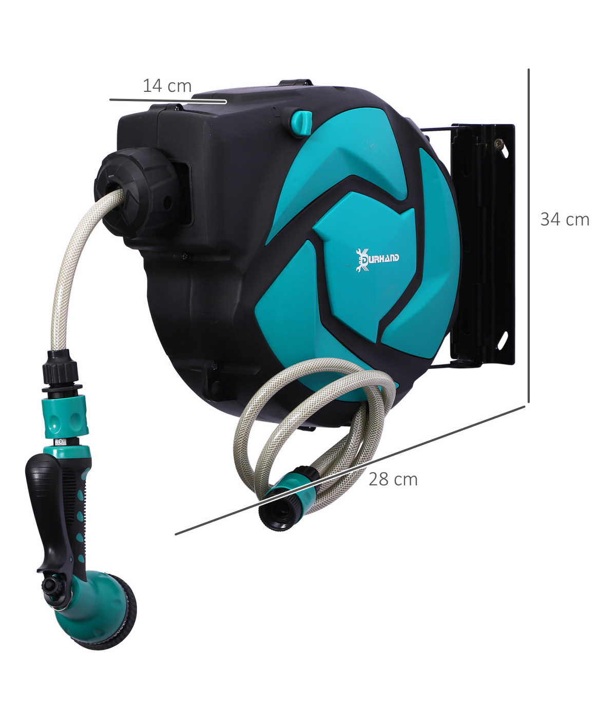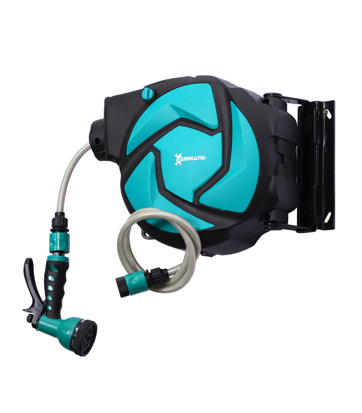 For a practical, lightweight and space-saving solution to your watering needs, look to this 10m hose reel from DURHAND. Made from high quality and impact resistant plastic, it is hard wearing and durable and its auto guide rewind system allows the hose to retract easily and smoothly, saving you time winding it back in. With seven different watering patterns and a locking mechanism, you are in complete control. It��s ideal for watering your garden, front lawn and washing down patios, cars, balconies and more.