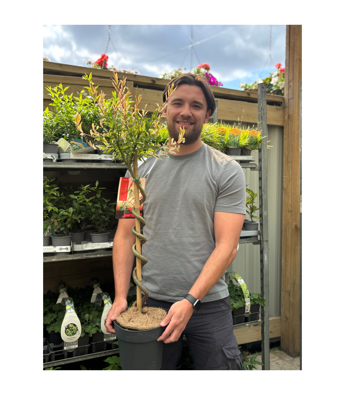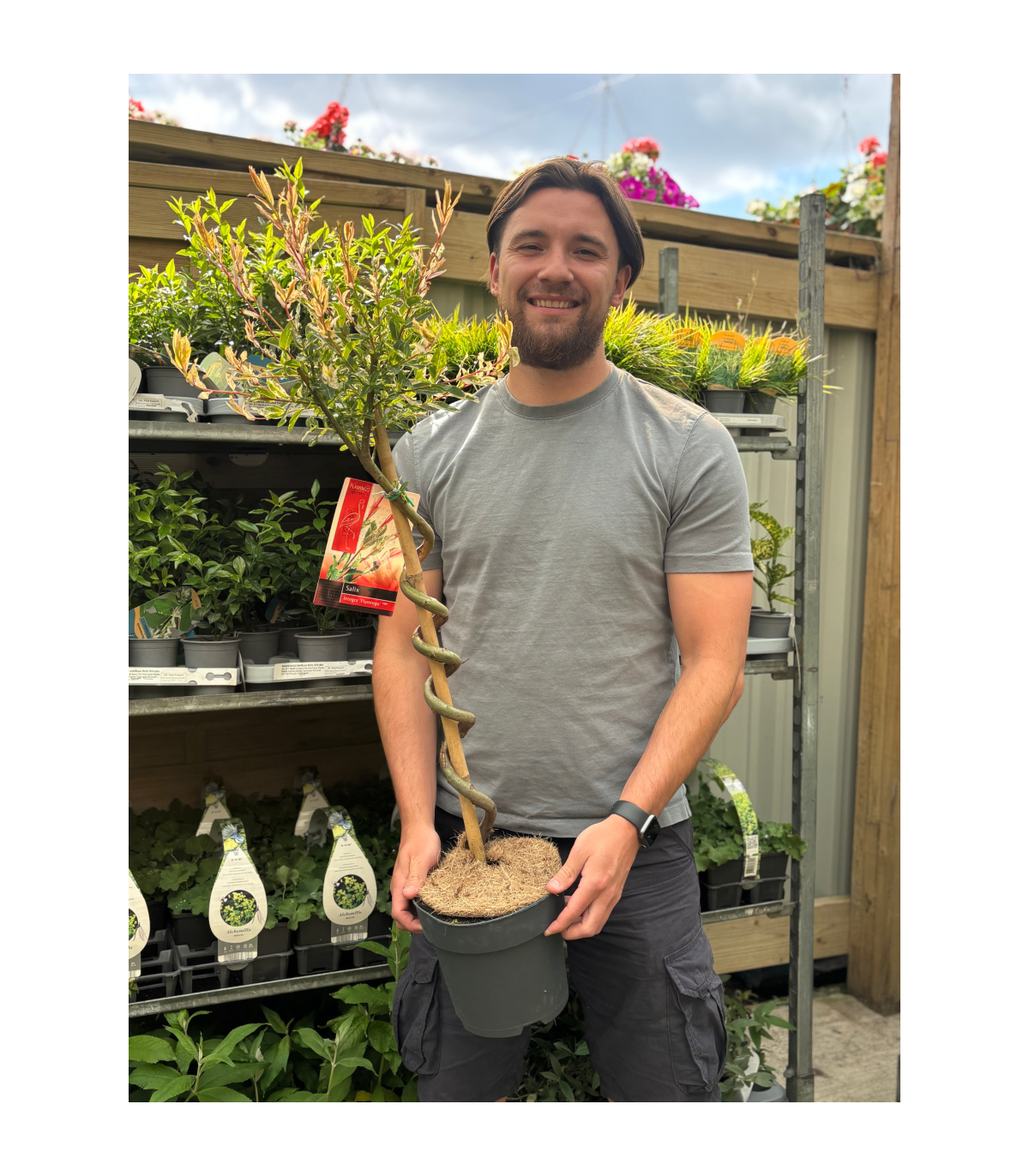 Grafted onto a standard stem with a carefully trained spiral trunk, it brings an elegant architectural twist to patios, borders, and smaller outdoor spaces. The tree’s compact, rounded head is easy to maintain and responds well to regular pruning, keeping its shape neat and vibrant year after year.