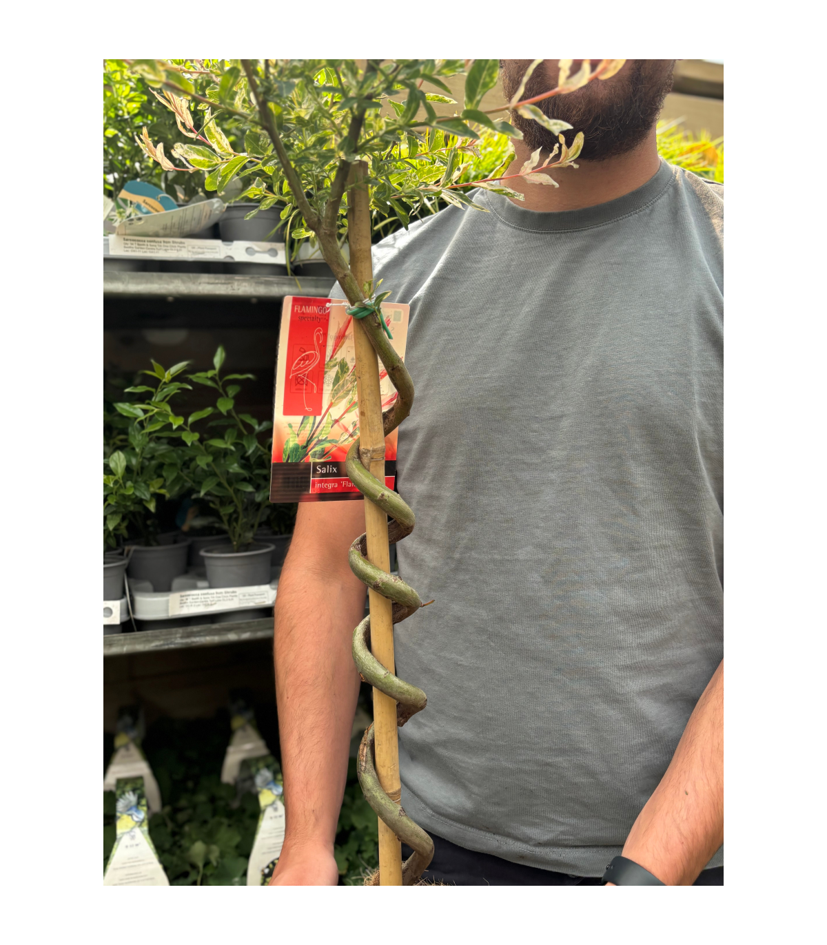 Add a striking focal point to your garden with the Salix integra 'Hakuro-Nishiki' Spiral, also known as the Flamingo Willow Tree. This eye-catching dwarf tree features beautifully variegated foliage in shades of soft pink, white and green, which emerge in spring and gradually mature through the seasons.