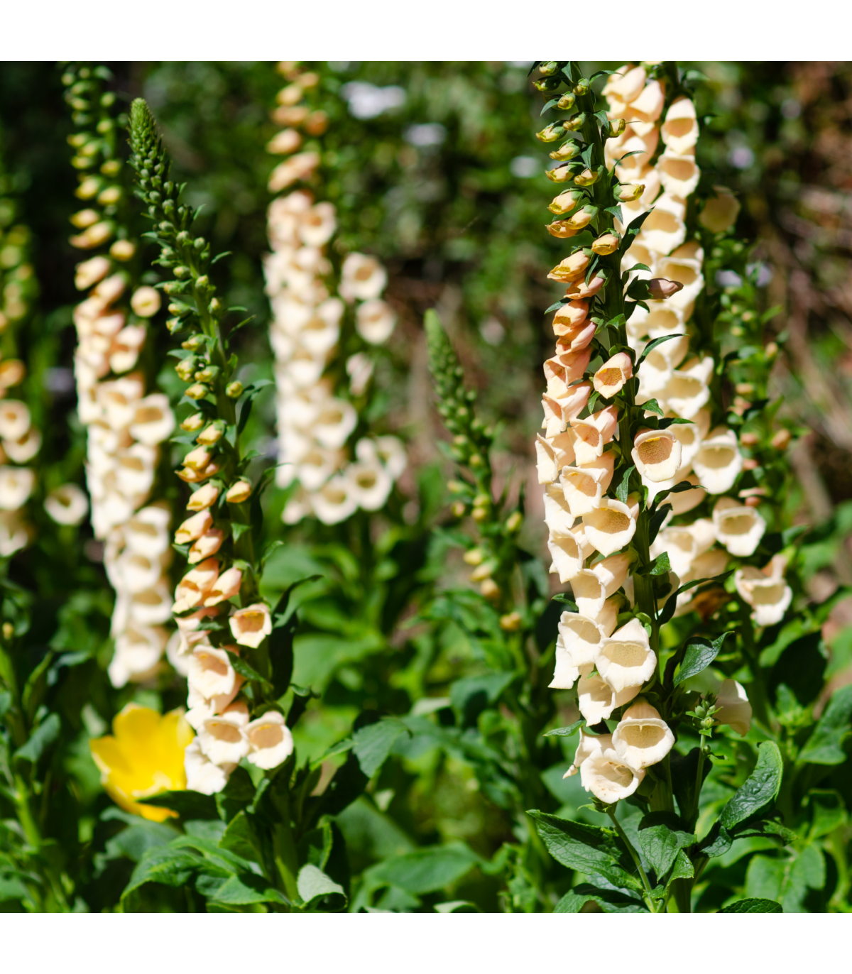 Digitalis purpurea 'Dalmatian Peach' is a captivating perennial that features elegant spikes of soft peach-coloured tubular flowers, each adorned with subtle maroon speckles inside. The blooms rise above a rosette of lush, green foliage, creating a striking contrast and adding height and texture to the garden. Flowering in late spring to early summer, 'Dalmatian Peach' thrives in partial to full sun and well-drained soil, making it perfect for borders, cottage gardens, or woodland edges. This variety attracts pollinators such as bees and hummingbirds, bringing both beauty and wildlife interest to your garden. With its unique colour and graceful form, Digitalis 'Dalmatian Peach' is a perfect addition for creating a refined, vertical element in your landscape.