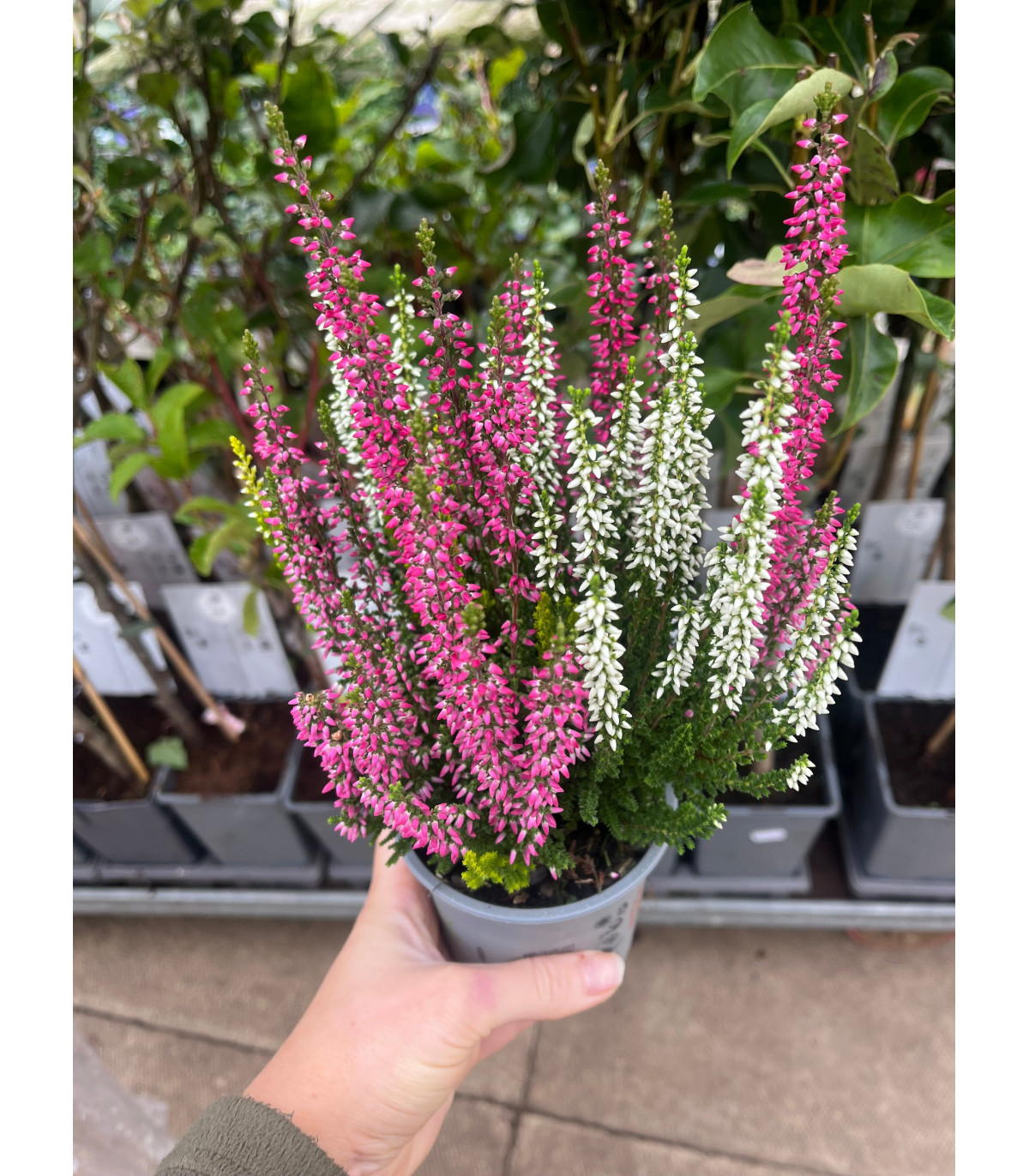 Low growing, acid loving perennials which become clothed with pink and white flowers in the late summer through to Autumn or Winter. These mound forming plants are relatively low maintenance. 3 different coloured heathers planted in the same pot.