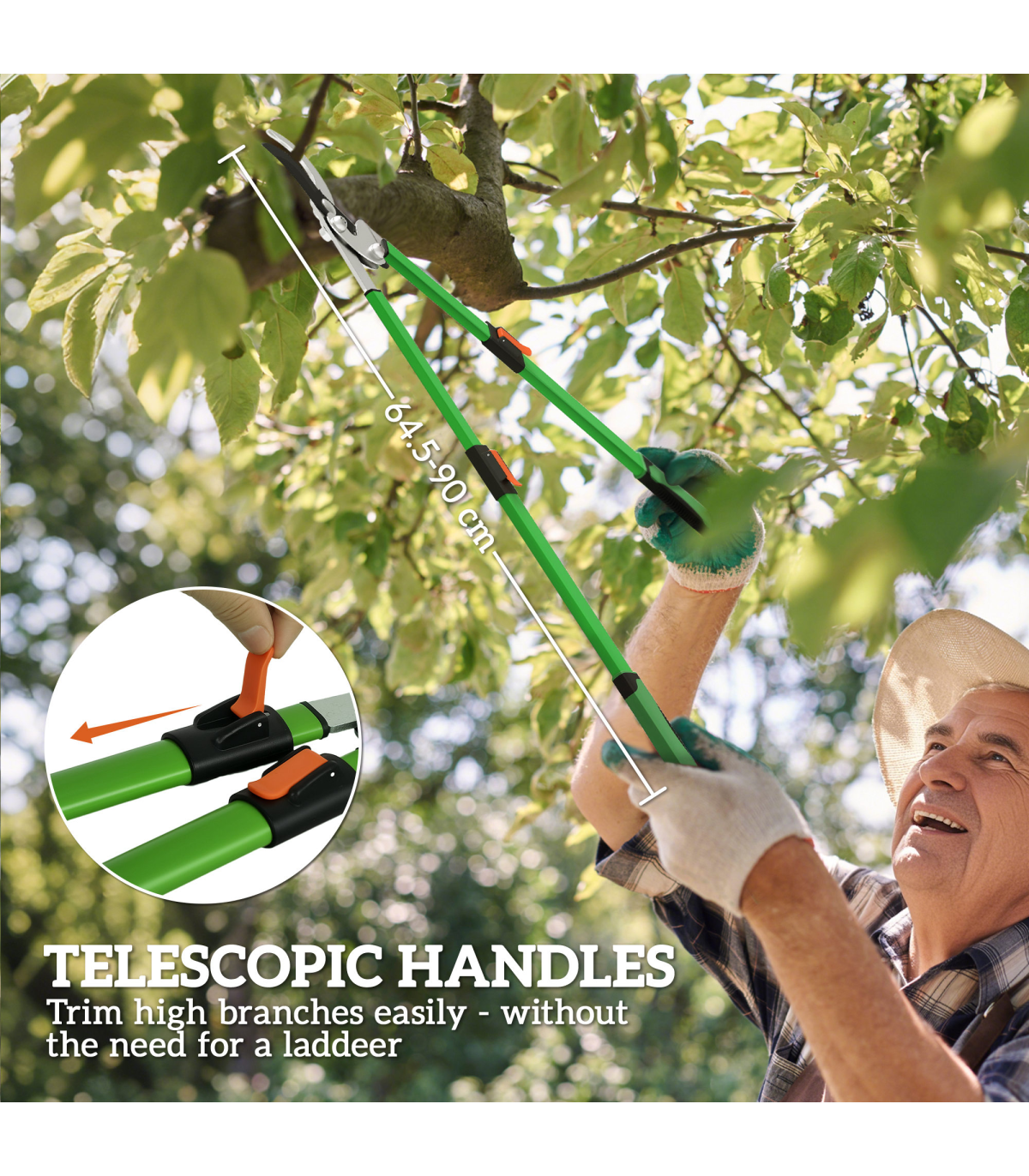 - Extendable handle from 64.5 to 90 cm reaches high branches