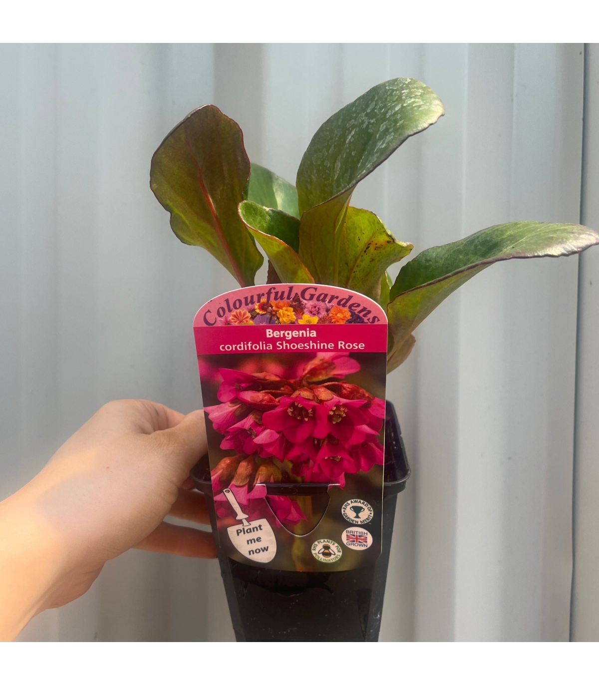 Bergenia cordifolia 'Shoeshine Rose' is a captivating perennial, prized for its stunning glossy, evergreen foliage and vibrant rose-pink flowers. This perennial beauty boasts large, heart-shaped leaves that form dense, low-growing mounds, providing year-round interest in the garden. In early to mid-spring, 'Shoeshine Rose' produces clusters of bell-shaped flowers on sturdy stems, adding a pop of colour to the landscape. With its tolerance to various growing conditions and its ability to thrive in both sun and shade, this Bergenia variety is an excellent choice for borders, rock gardens, and mass plantings.