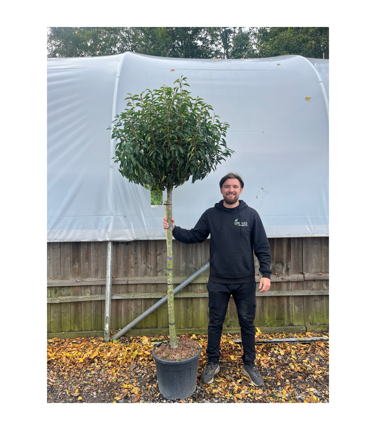 Our ½ Standard Portuguese Laurel Tree is a stylish way to add height, greenery, and year-round interest to your garden. Standing at around 2m tall, it has a 1.3m clear stem topped with a 0.7m head of dense, glossy foliage – giving you height without taking up too much space at the base.