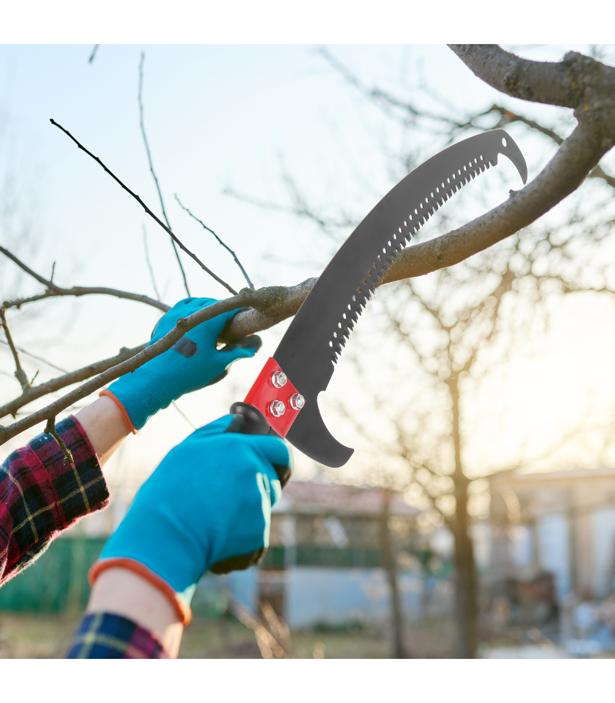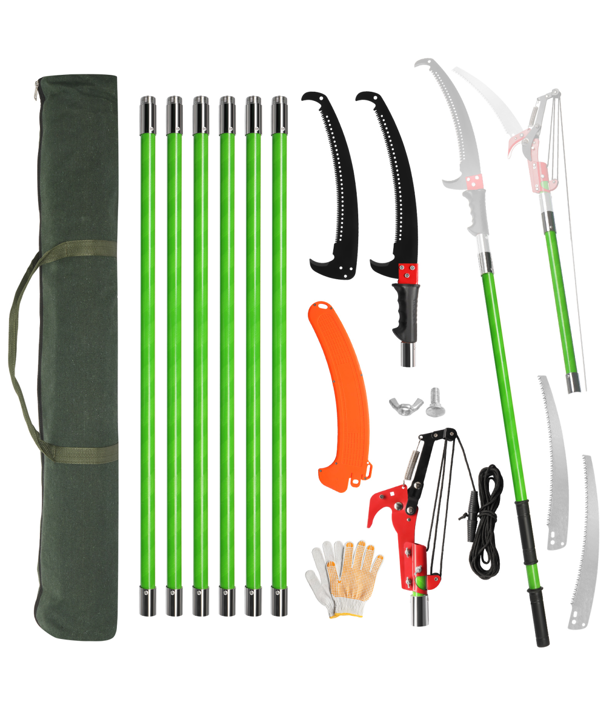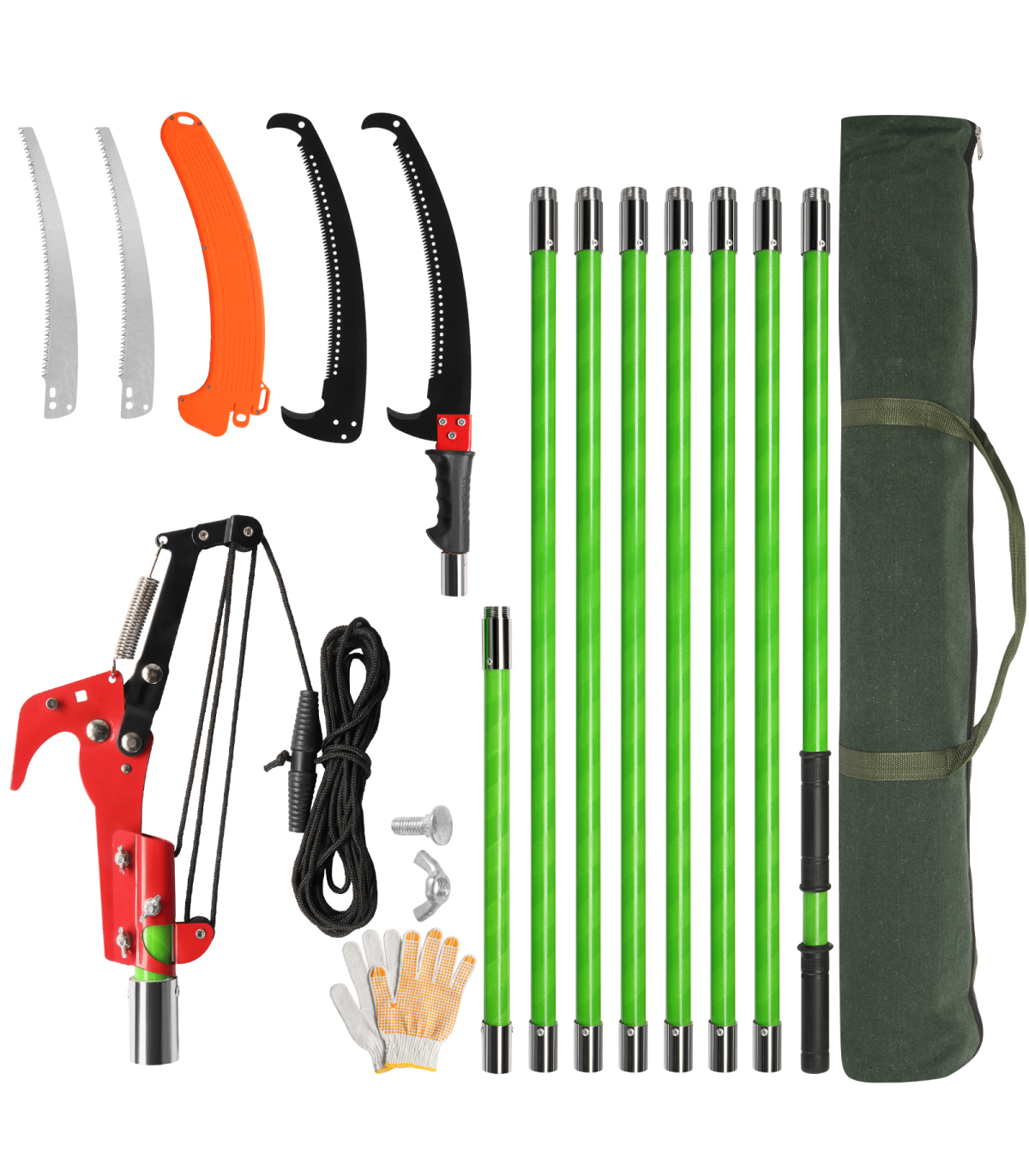 4. All-in-one Pruning Kit: This set includes everything you need for a full pruning solution: two sharp saw blades (one spare), a protective saw sleeve, 8 fiberglass poles, scissors with a pull string, protective gloves, and a durable canvas storage bag, ensuring you're well-equipped for any pruning jobs.