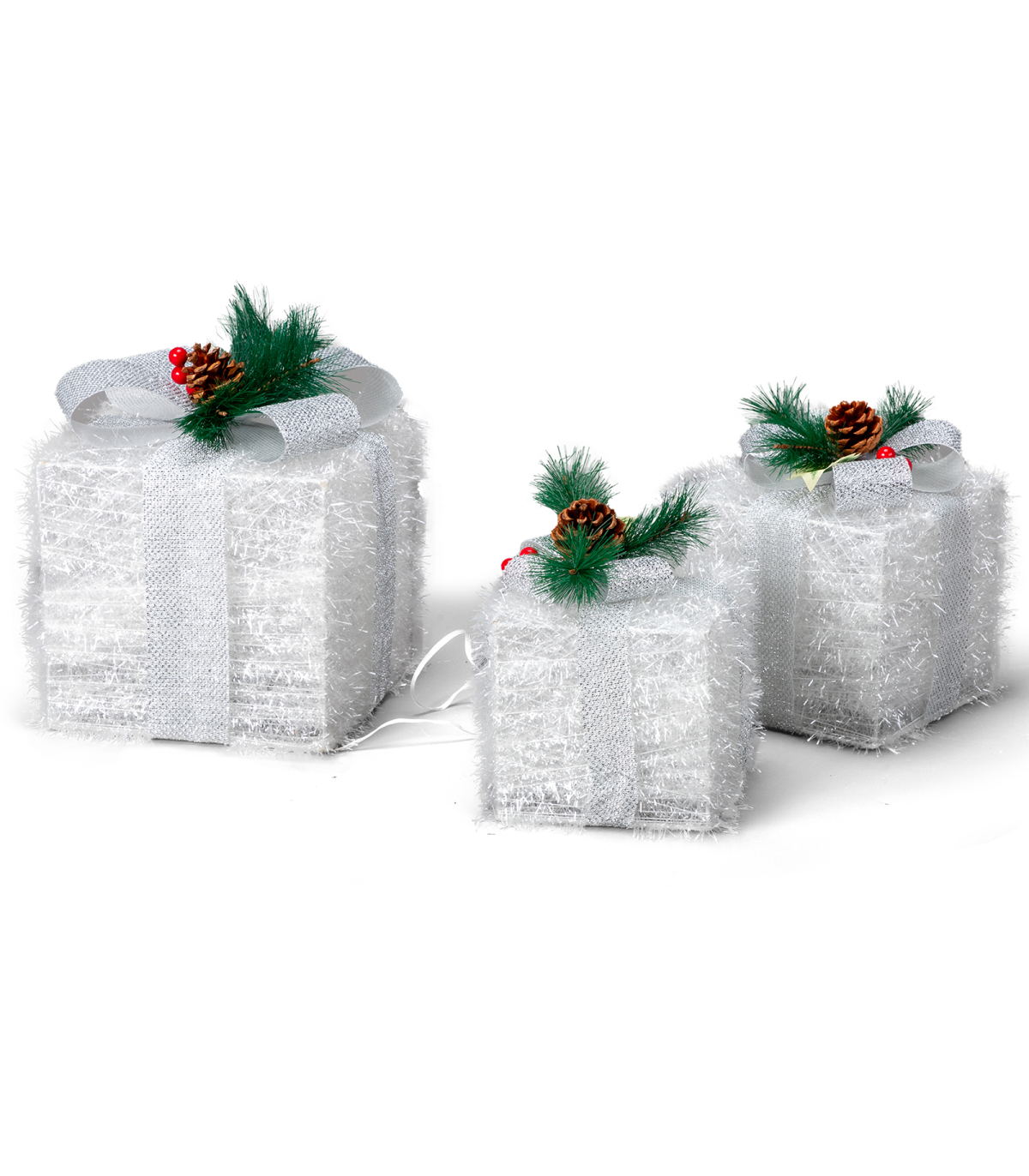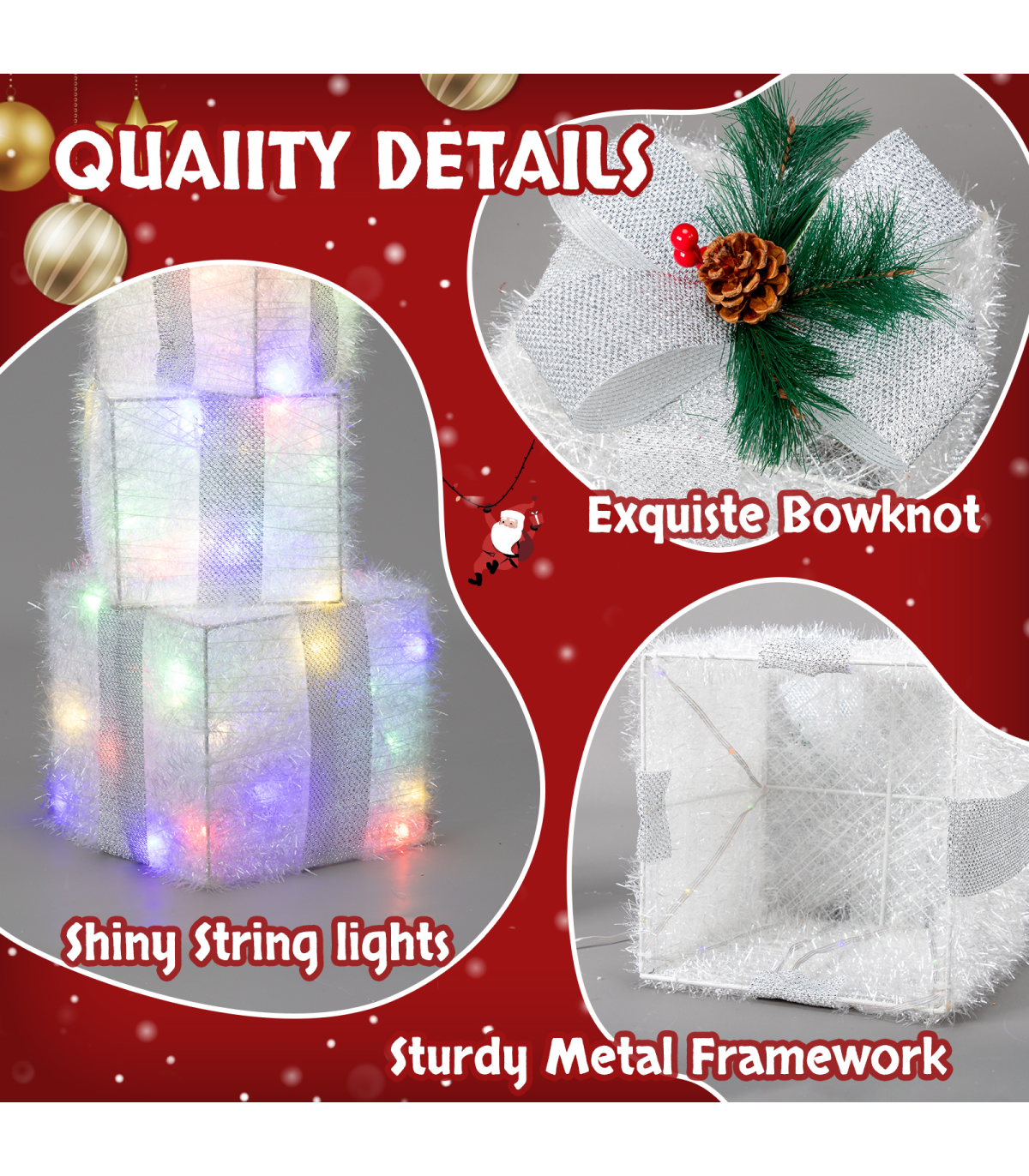 1. Set of 3 Gift Boxes: This festive set includes three different-sized gift boxes (7.3in, 5.5in, and 4.7in) that create a warm holiday ambiance. The see-through design allows the LED lights to shine beautifully through the frames, casting a radiant glow across any indoor or outdoor space.