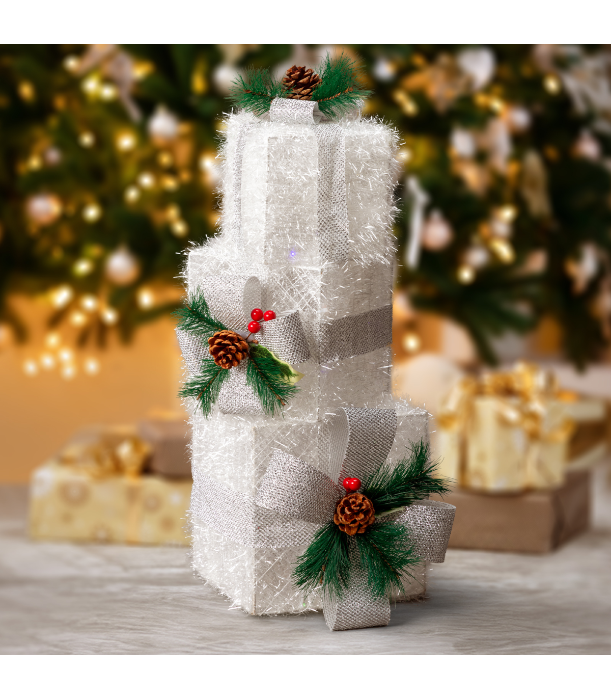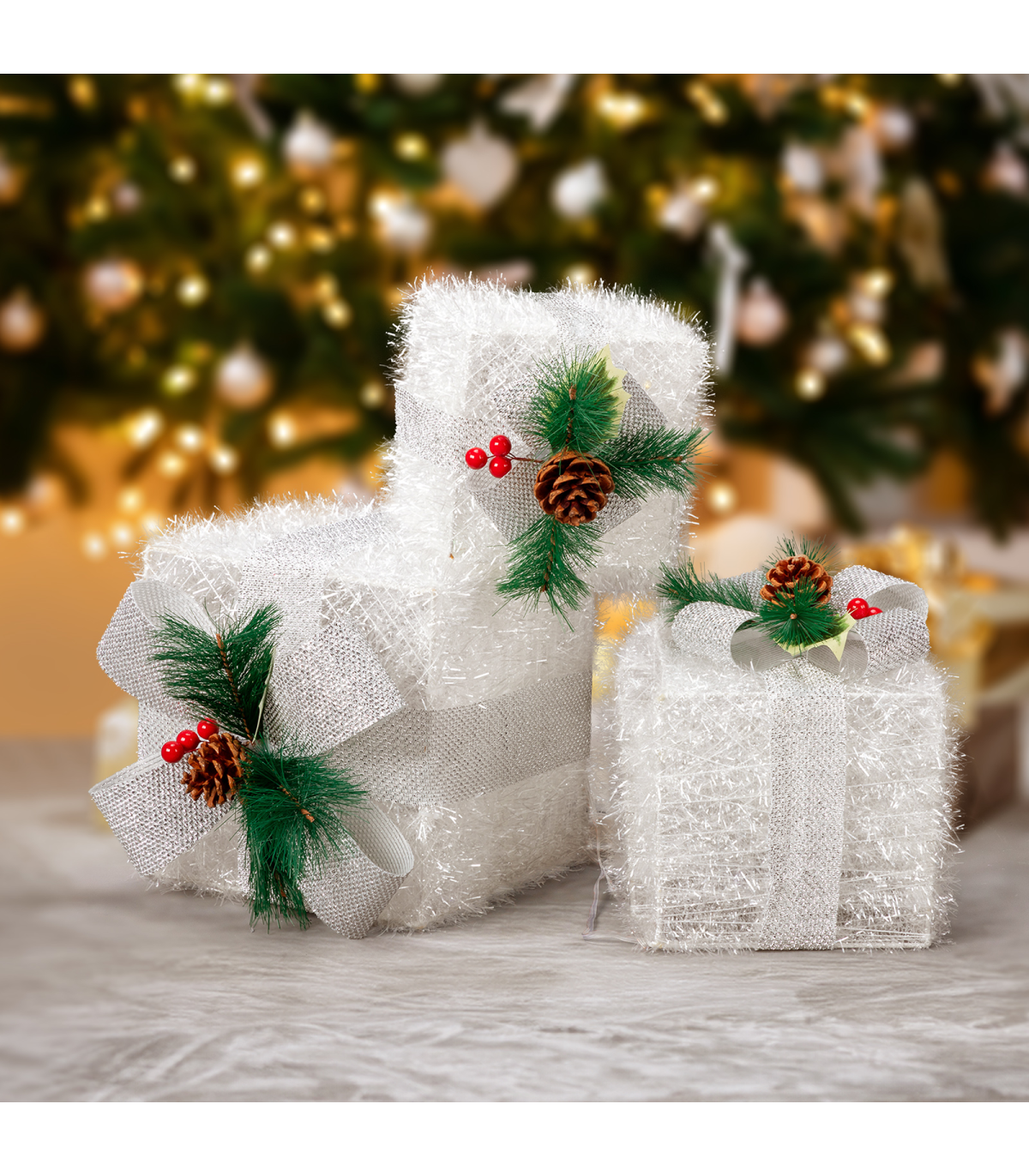 Create a warm and festive atmosphere this holiday season with our beautiful lighted gift boxes. Perfect for both indoor and outdoor decorations, these illuminated presents add a magical touch to any space, making them an ideal addition to your Christmas décor. Whether placed under the tree, on your porch, or in the yard, the glowing gift boxes bring holiday cheer and a cozy ambiance to your home. Easy to set up and store, they're the perfect way to brighten up your winter wonderland and make your celebrations even more special.