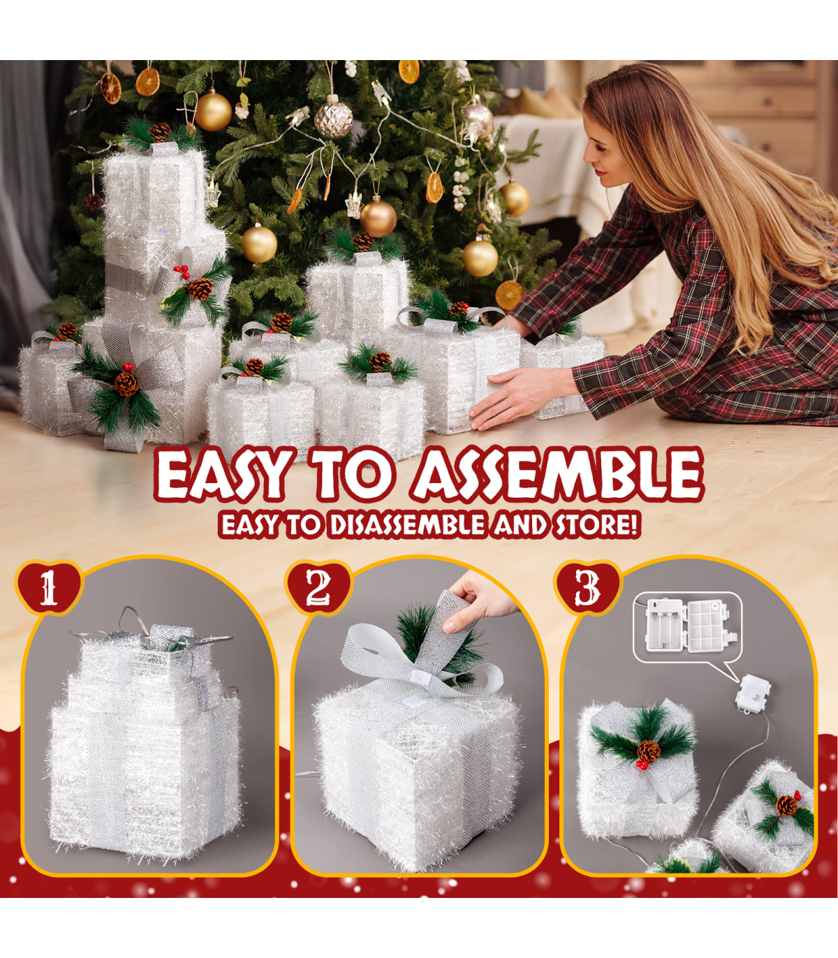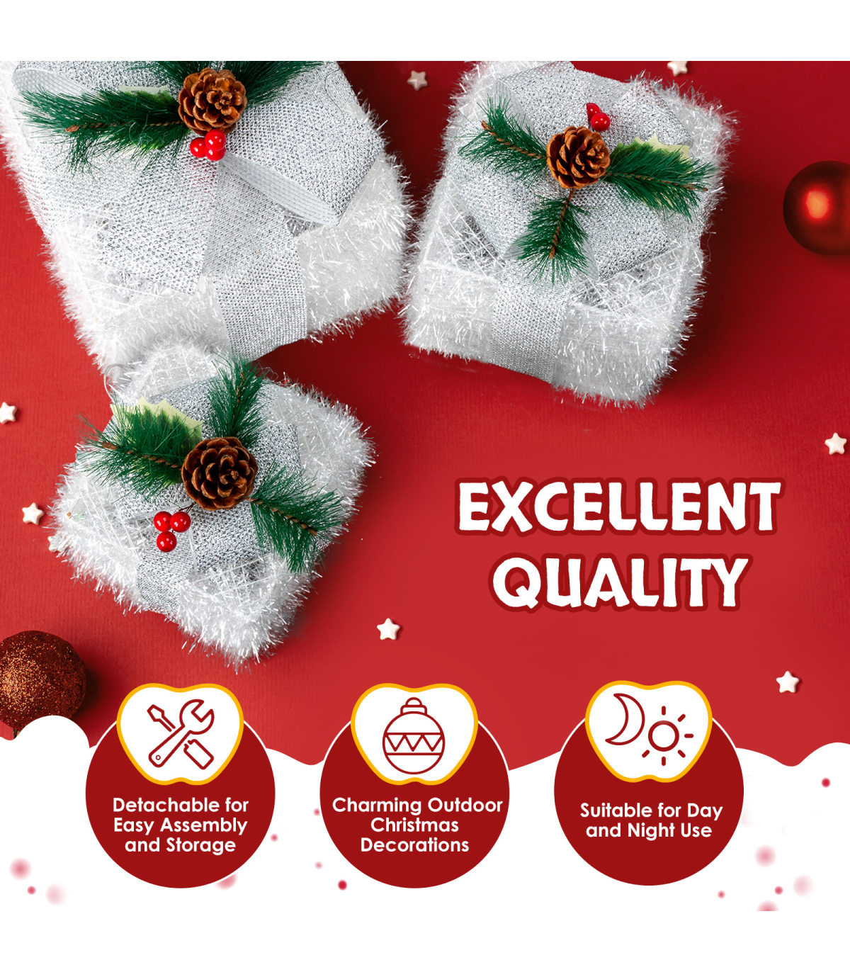3. Easy Assembly and Storage: Just attach the decorative ribbons, install batteries, and watch them come to life. You can arrange the three boxes in the way you like. Once the holiday season is over, they can be nested inside each other for compact storage.