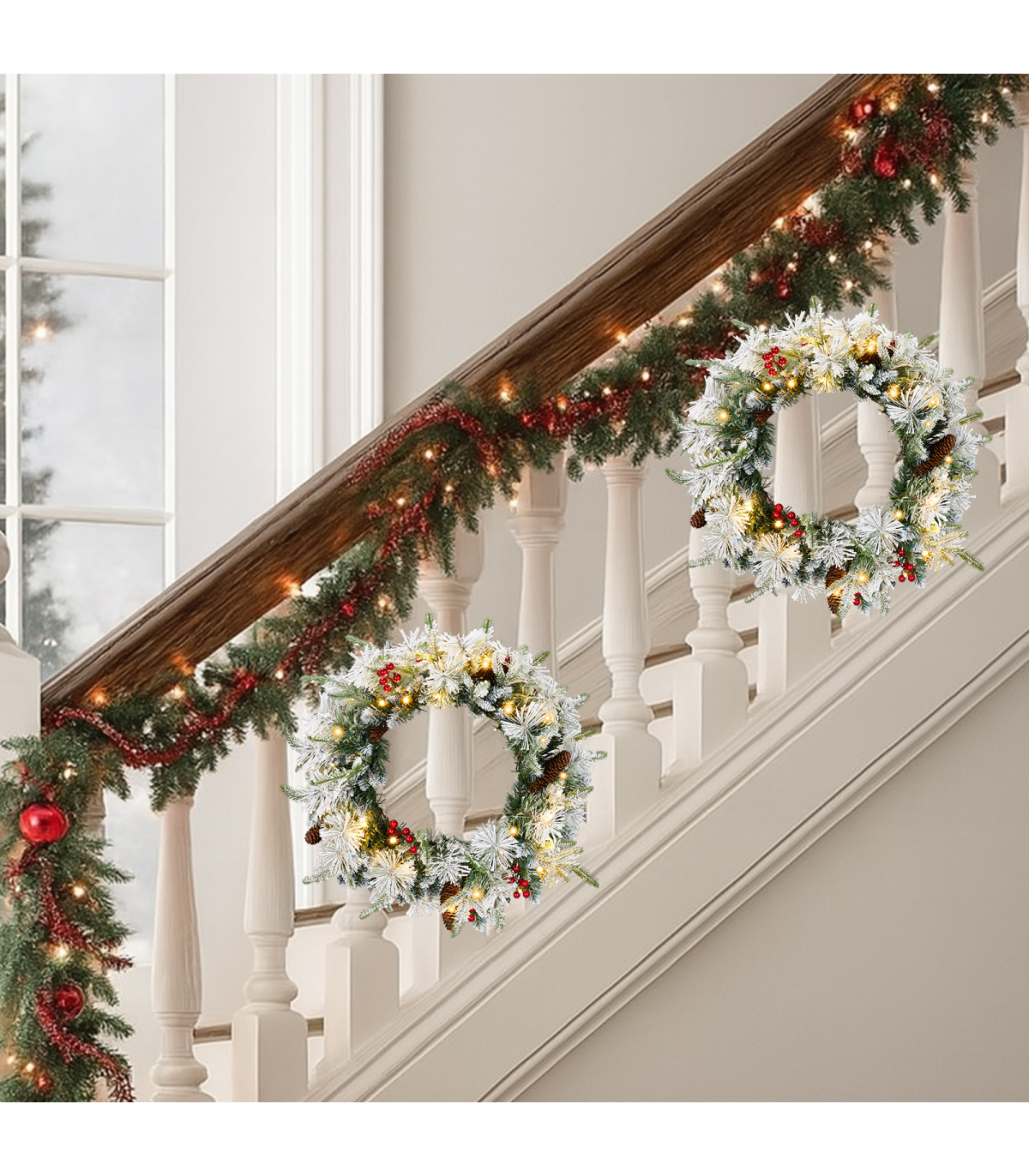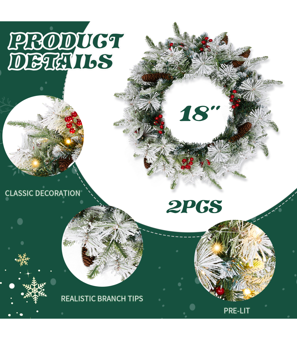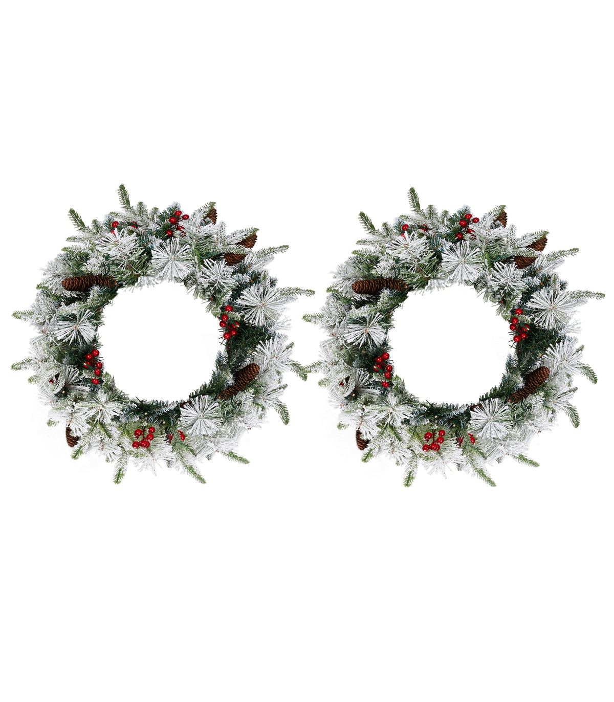 2 Pack 18in Pre-lit Snow Flocked Christmas Wreath, Lighted Artificial Xmas Wreath with 60 Warm Lights and 140 Tips and Red Berries Pine Cones, for Front Door Gate Wall Xmas Party Decorations