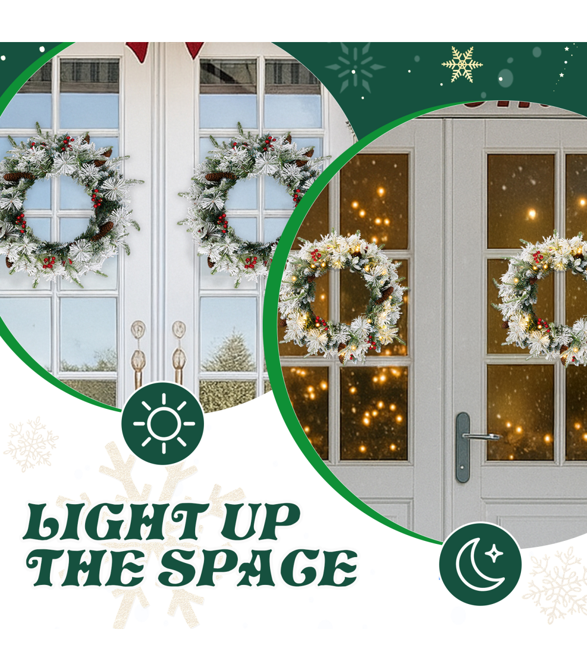 4. Pre-decorated: Our wreath comes adorned with pine cones and red berries that add to its festive appeal. The thoughtfully selected decorations enhance its aesthetic, making it a beautiful, ready-to-display piece.