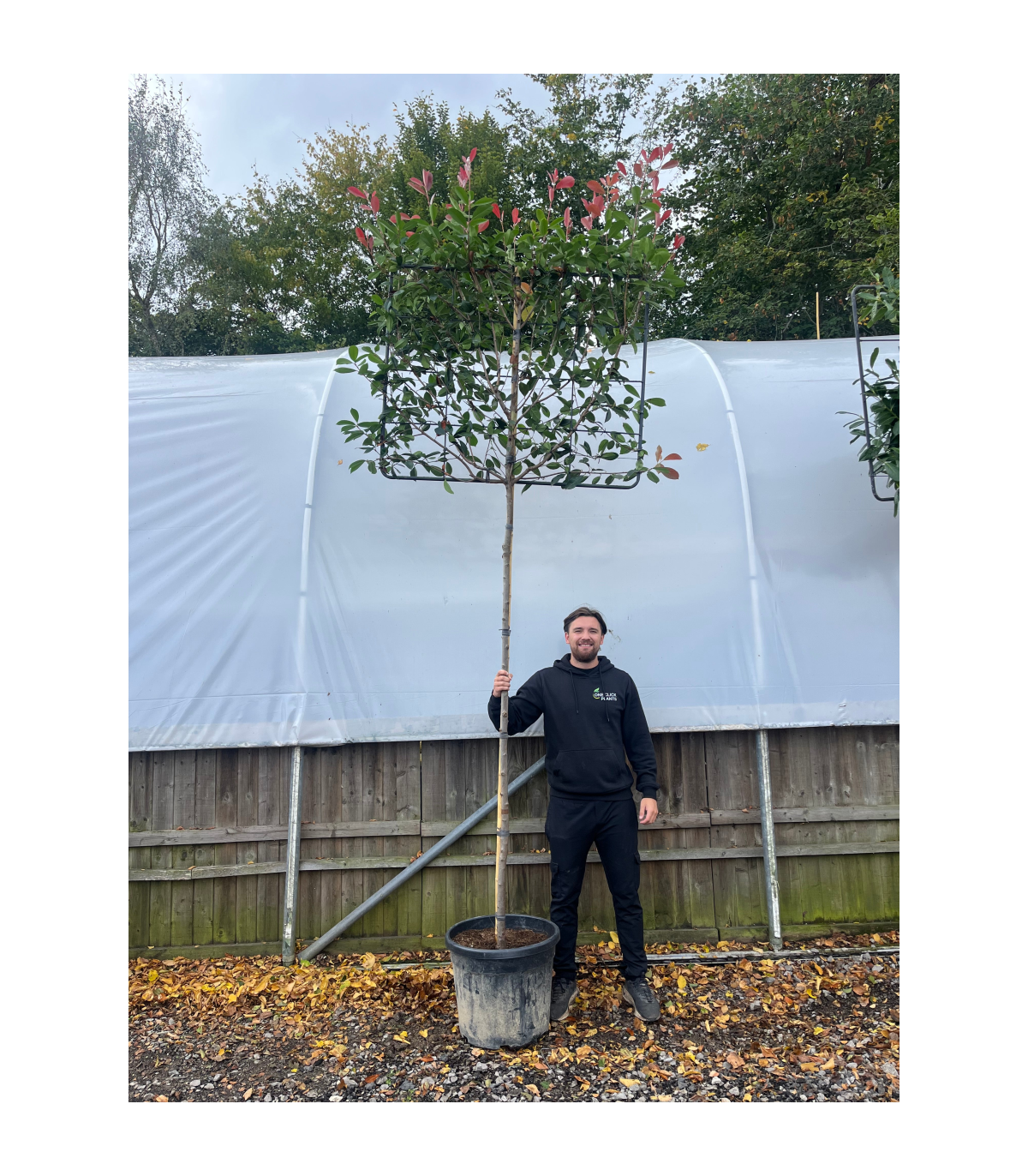Photinia ‘Red Robin’ Pleached Trees are a striking and practical way to create above-fence privacy. Trained on a clear stem with a neat head of foliage, they form a living screen that adds both seclusion and vibrant colour to the garden.