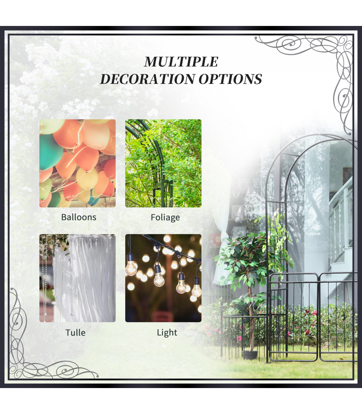 ● The arch can be decorated with vibrant flowers, tulle balloons, lights and more