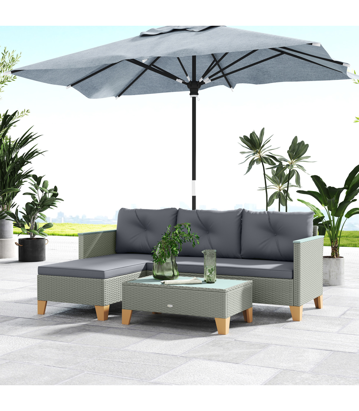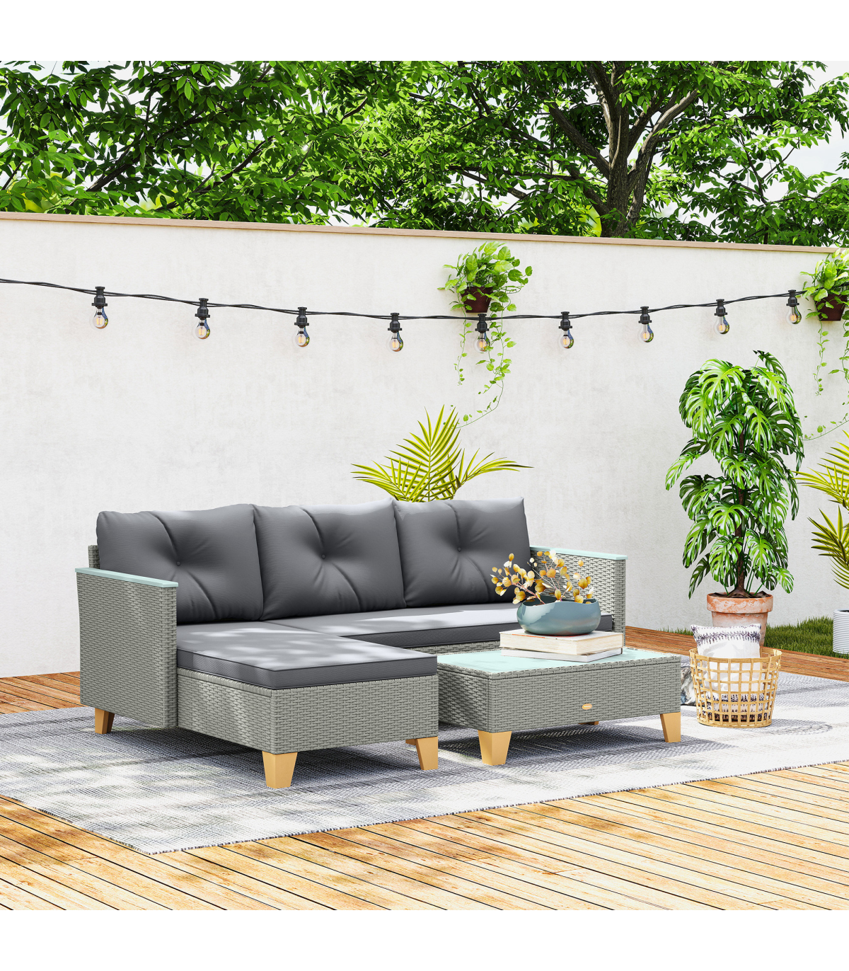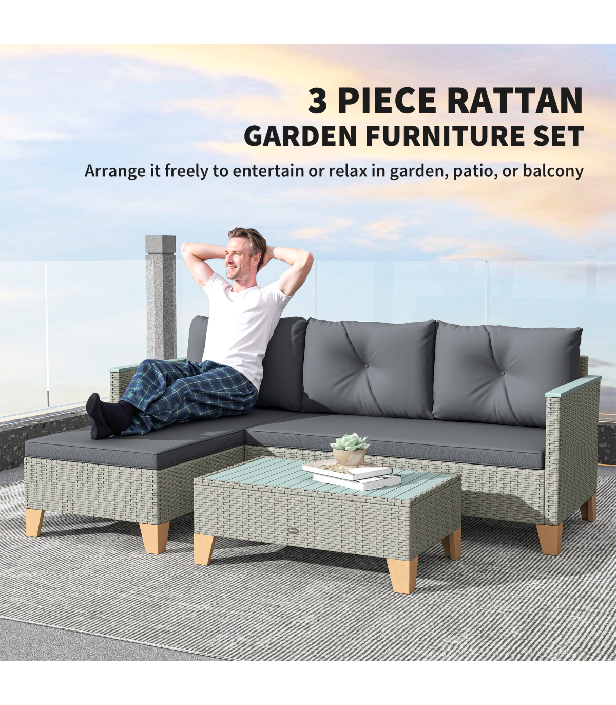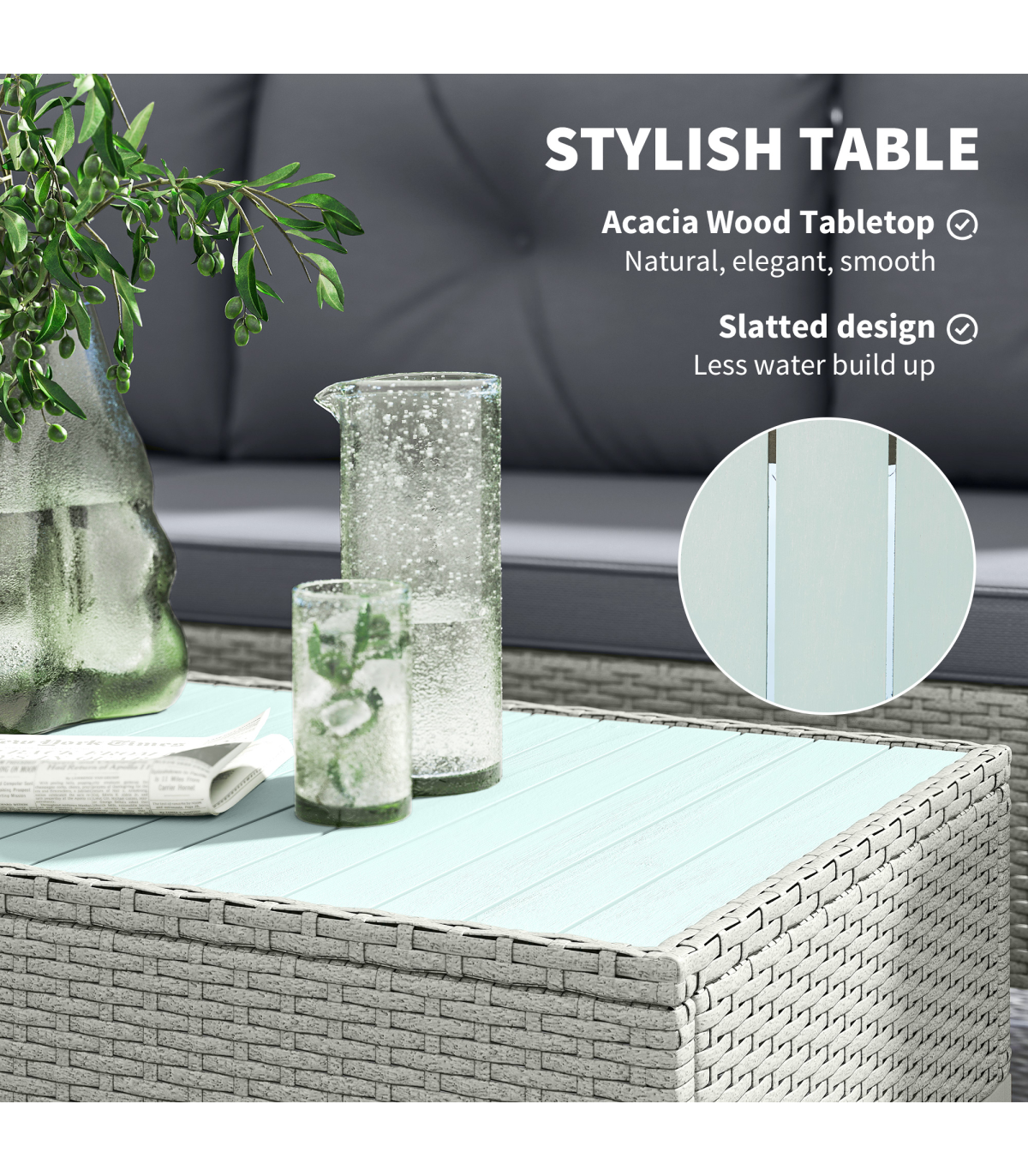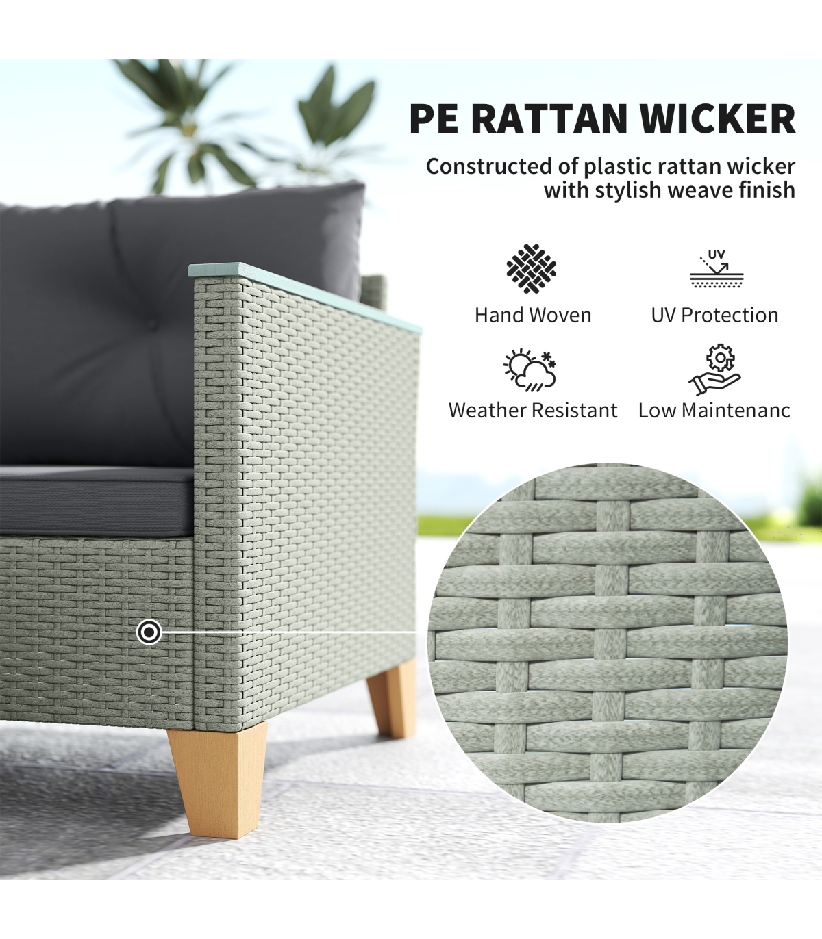 ● Materials: Steel, PE Rattan, Polyester, Acacia Wood, Sponge