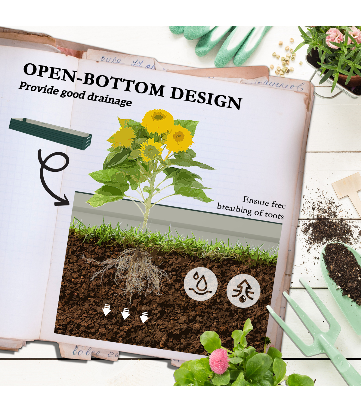the open bottom design means there's direct contact with soil for maximum growth. The 60 x 240 cm size means there's plenty of growing room.