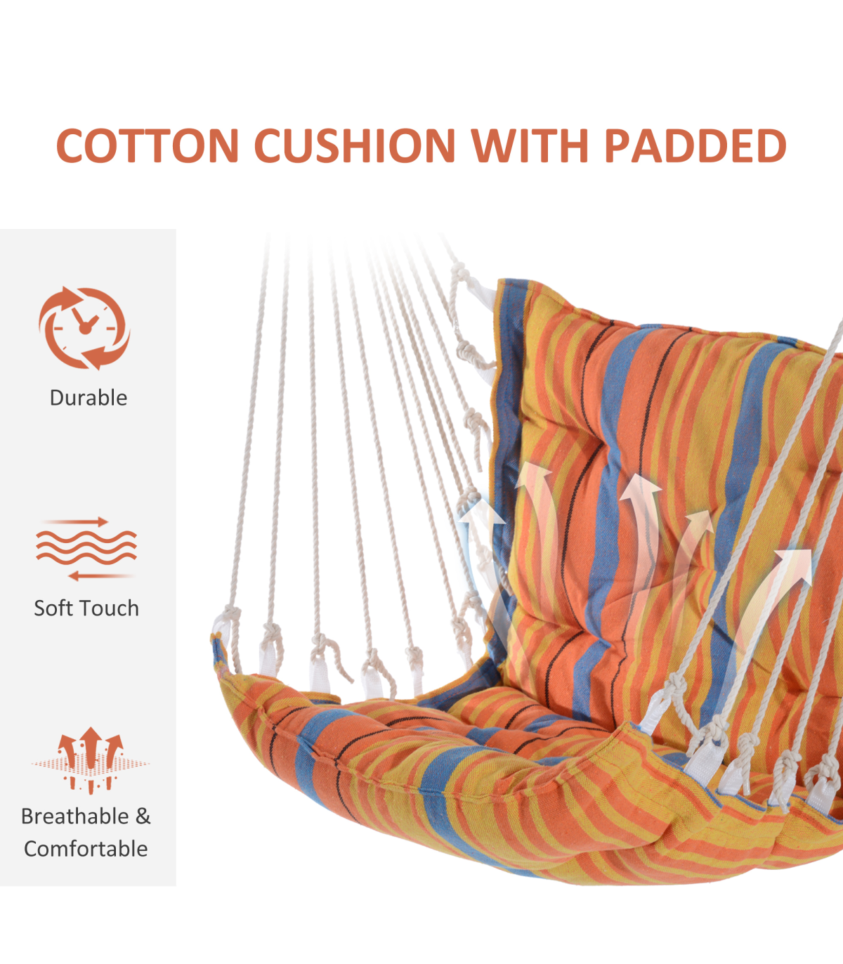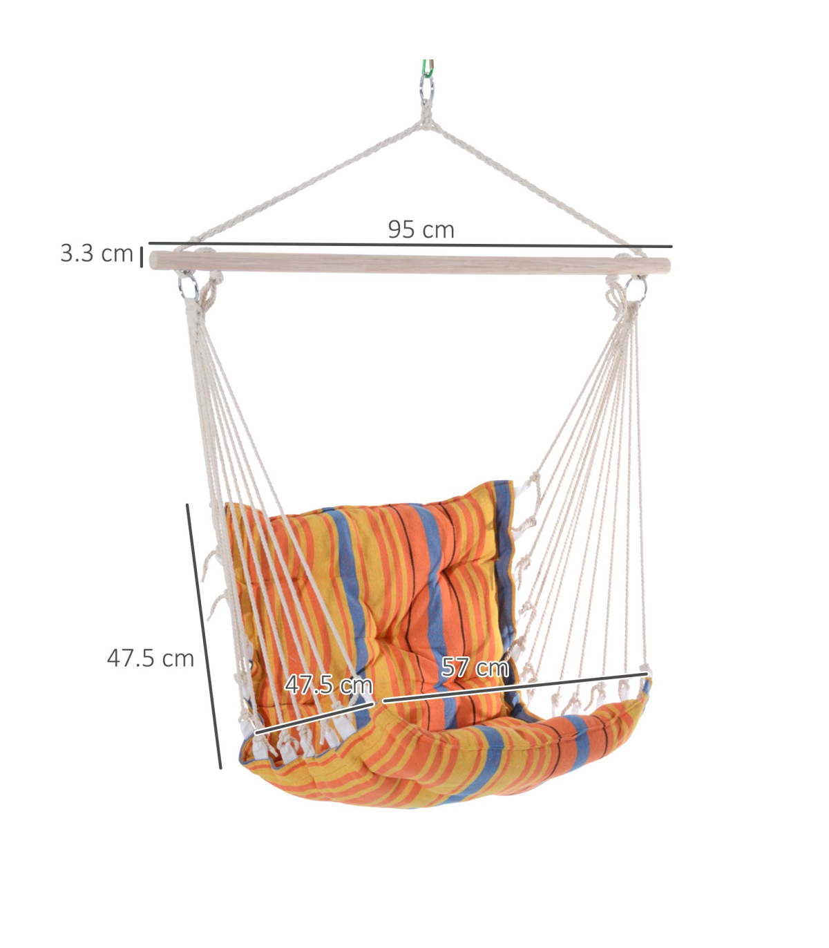 Hanging Swing Chair" Description: - Spend your lazy day with Outsunny's swing chair! - This comfortable hanging chair in vibrant color offers great relaxation. - Makes an ideal addition to any outdoor vacation, such as camping, beach, or mountain trips. - Comes with firm cotton rope and solid hardwood to hold up to 105kg. - Thick padded seat and back support for extra comfort. - Stylish and functional. - Will be your companion in your leisure time. Features: - Real wood with natural cotton cloth and cotton ropes. - Adds a unique seating element to your indoor or outdoor space. - Large weight capacity, can support 1 person up to 105kg. - Thick padded seat and backrest for extra comfort. - Assembly required.