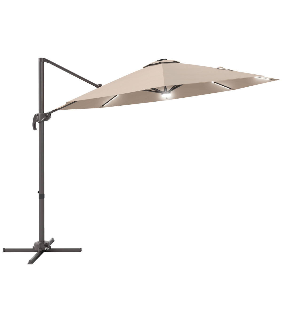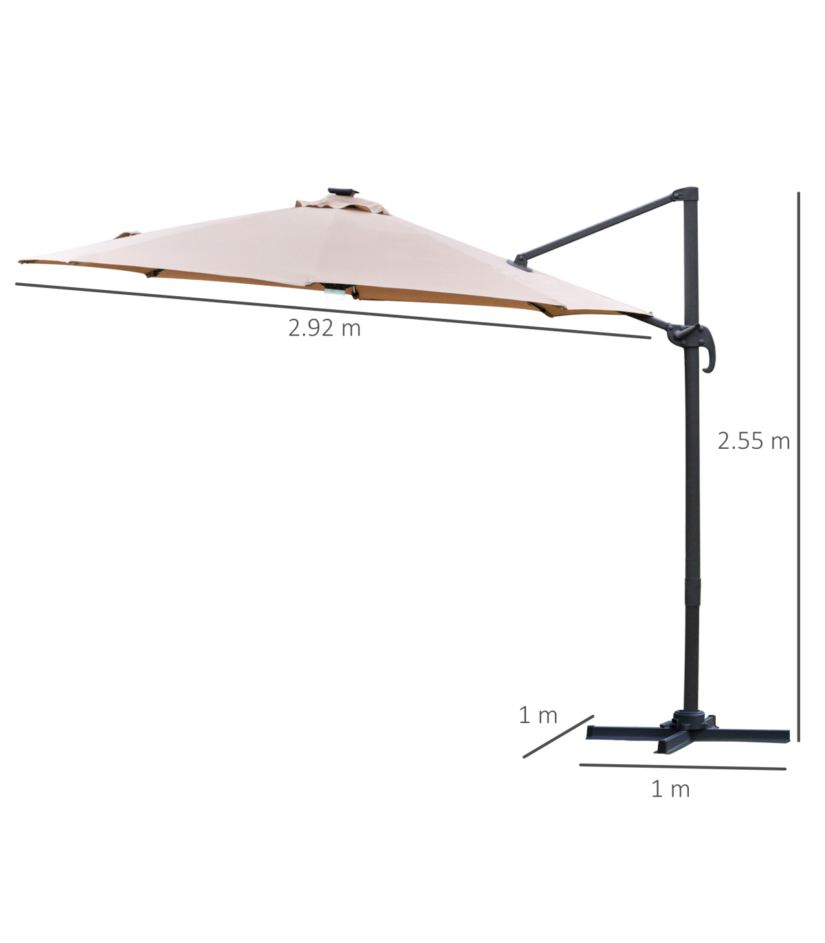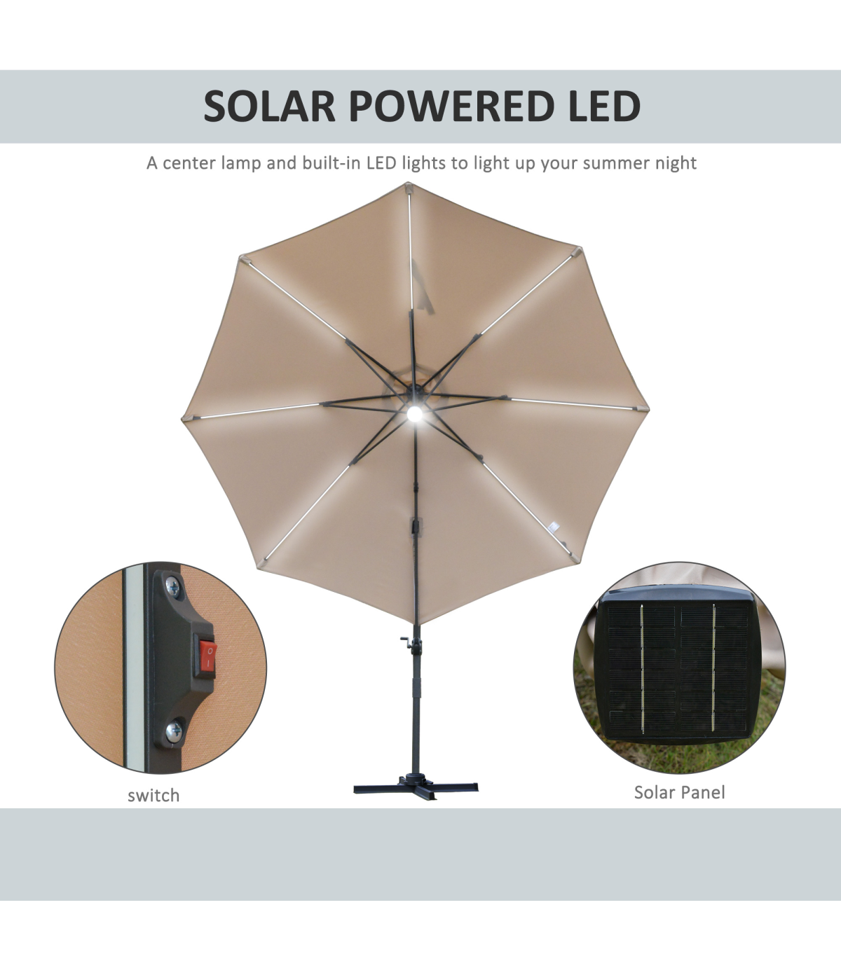 - "Sun safety in the day and beautiful illumination at night. Welcome this cantilever parasol from Outsunny into your home to transform your garden memories. There are LED lights scattered on the support ribs, controlled by a switch: you can radiate your outdoors at night. The large polyester canopy can be adjusted to four different angles and swivels 360° so you can keep protected from the sun at practically any angle. The aluminium structure is sturdy and durable and it's fitted with a crank handle to open and close the canopy easily. Comes with a cross base - weights are required."