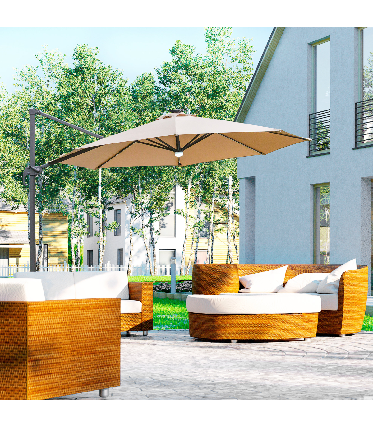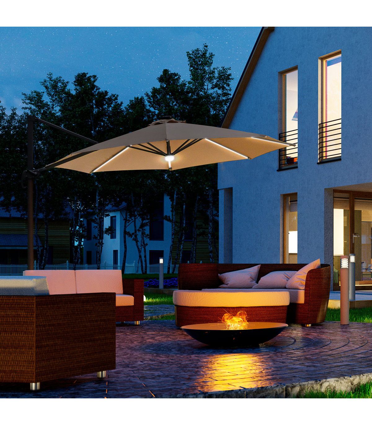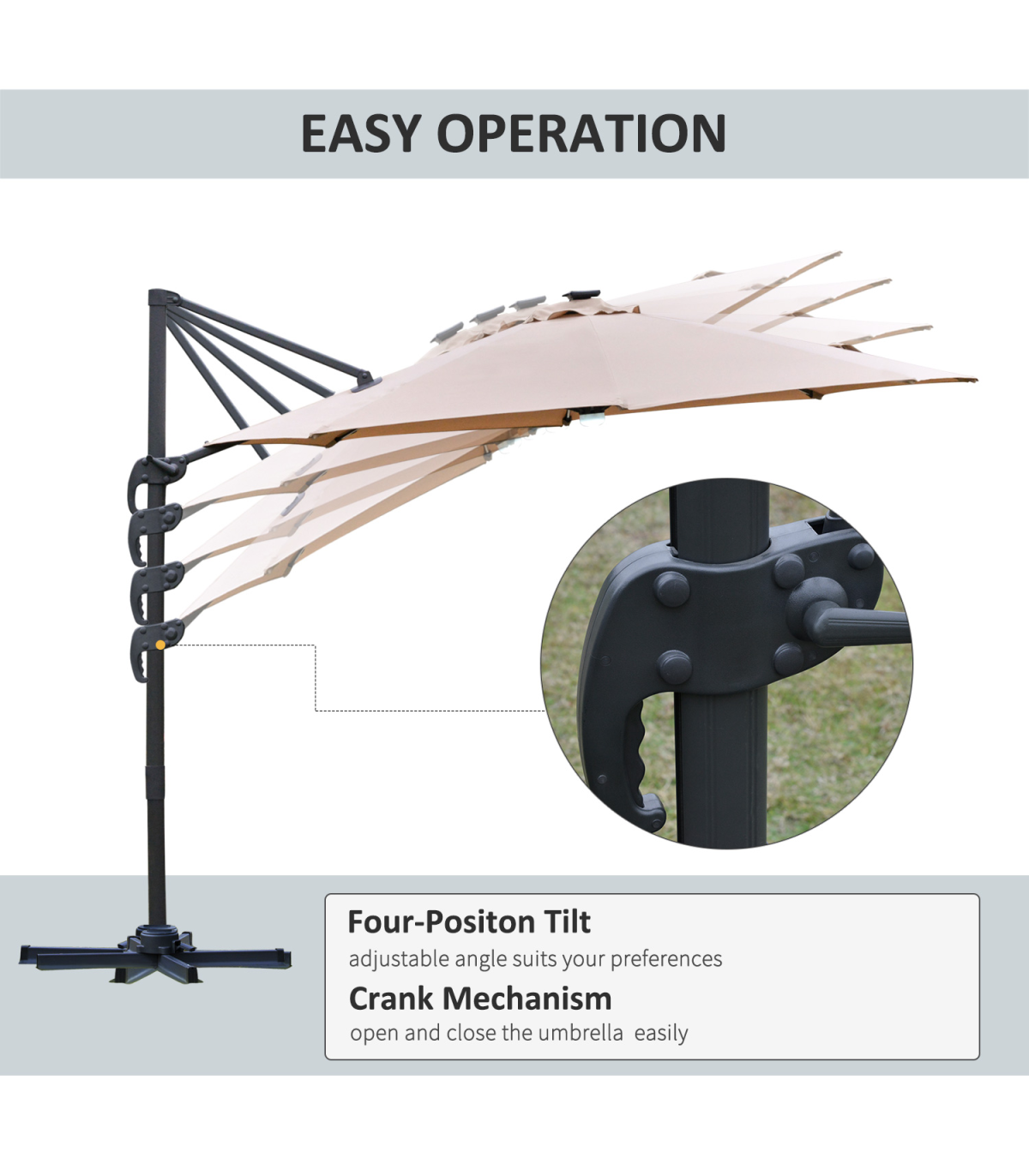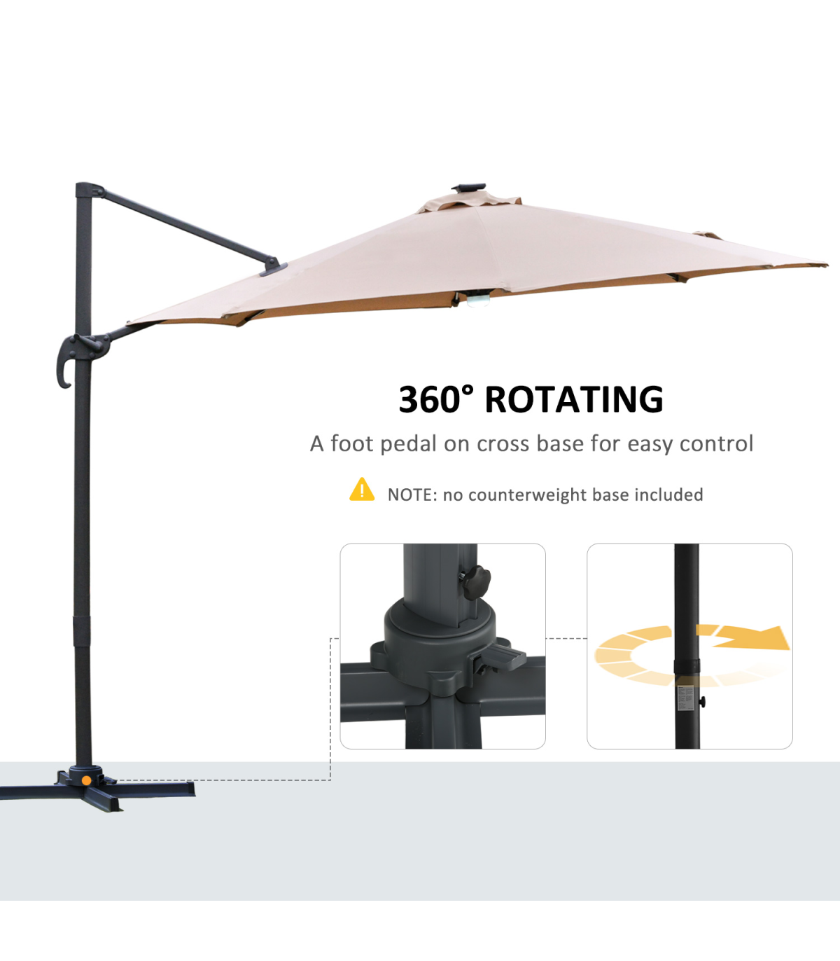 - "Sun safety in the day and beautiful illumination at night. Welcome this cantilever parasol from Outsunny into your home to transform your garden memories. There are LED lights scattered on the support ribs, controlled by a switch: you can radiate your outdoors at night. The large polyester canopy can be adjusted to four different angles and swivels 360° so you can keep protected from the sun at practically any angle. The aluminium structure is sturdy and durable and it's fitted with a crank handle to open and close the canopy easily. Comes with a cross base - weights are required."
