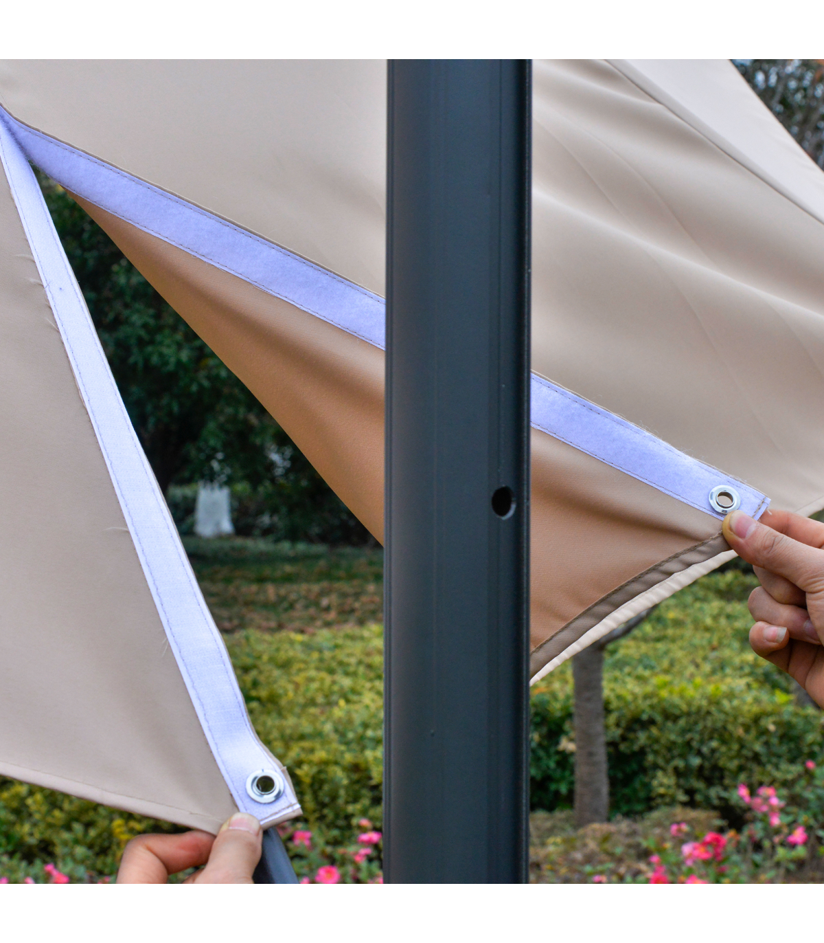 - Eight ribs connect the canopy to the main aluminium pole for extra stability