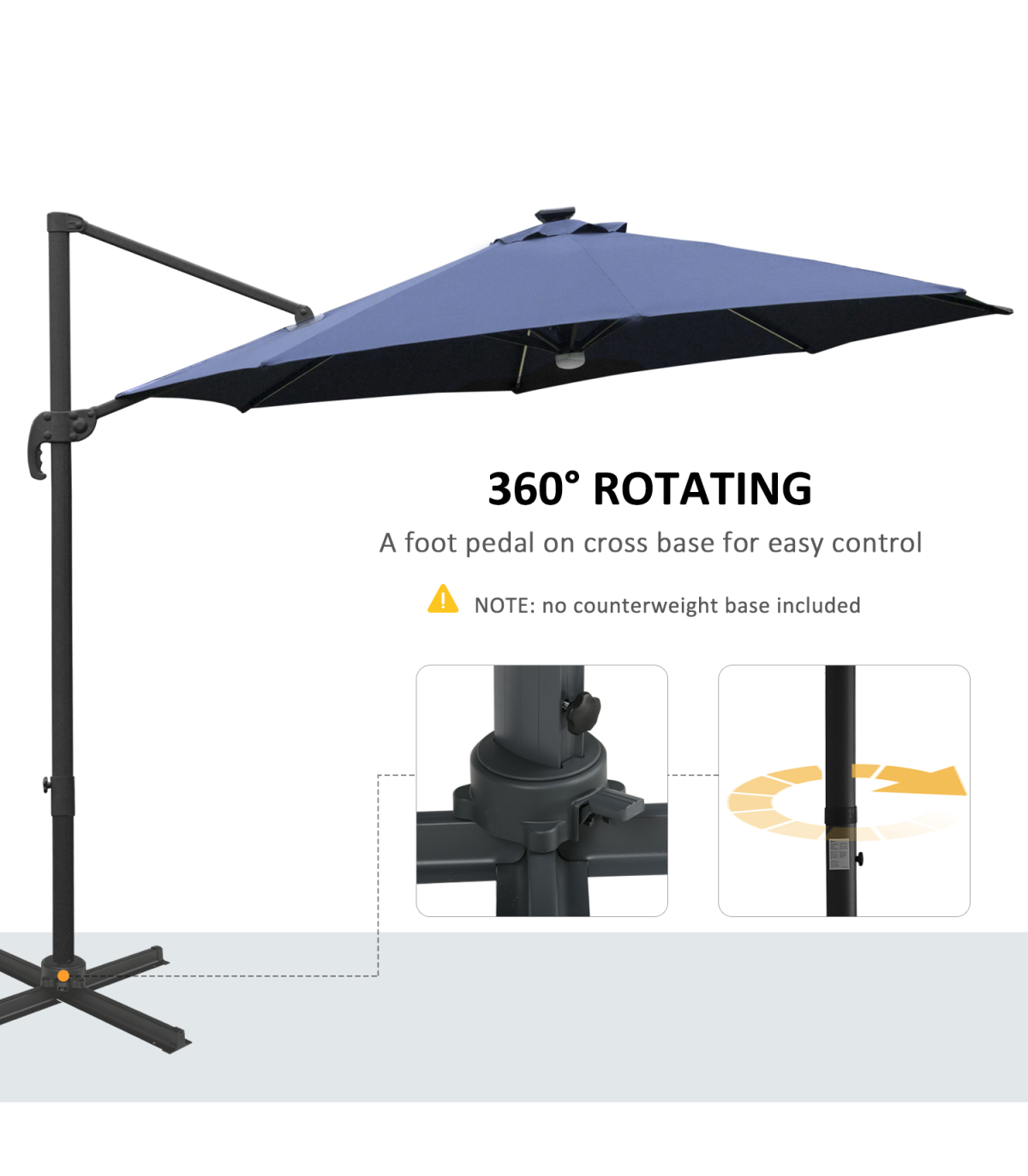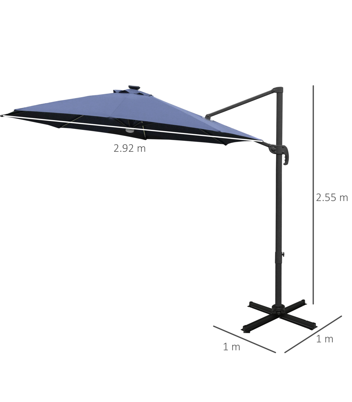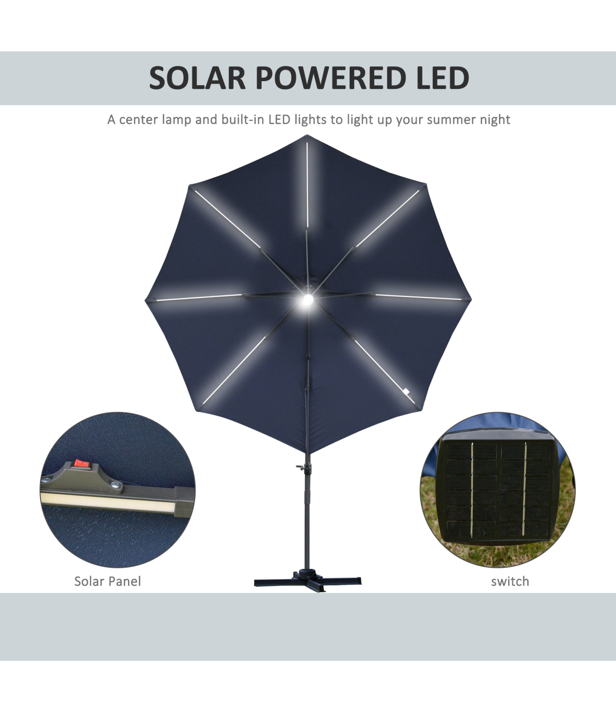 - "Sun safety in the day and beautiful illumination at night. Welcome this cantilever parasol from Outsunny into your home to transform your garden memories. There are LED lights scattered on the support ribs, controlled by a switch: you can radiate your outdoors at night. The large polyester canopy can be adjusted to four different angles and swivels 360° so you can keep protected from the sun at practically any angle. The aluminium structure is sturdy and durable and it's fitted with a crank handle to open and close the canopy easily. Comes with a cross base - weights are required."