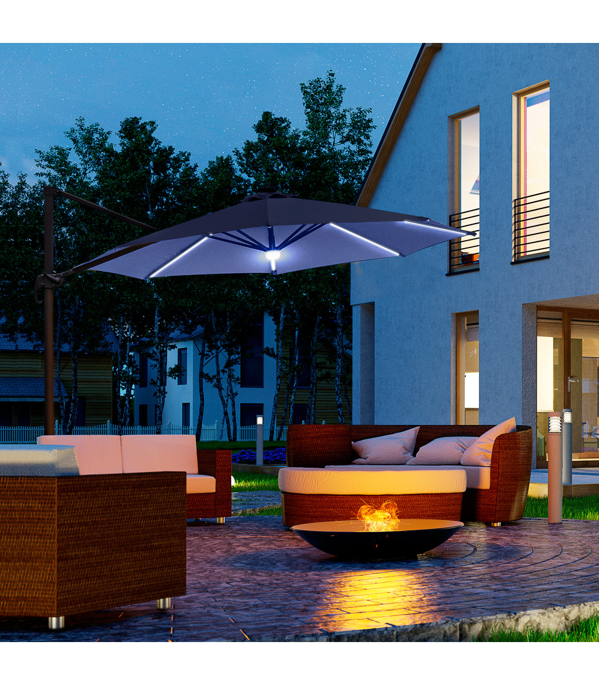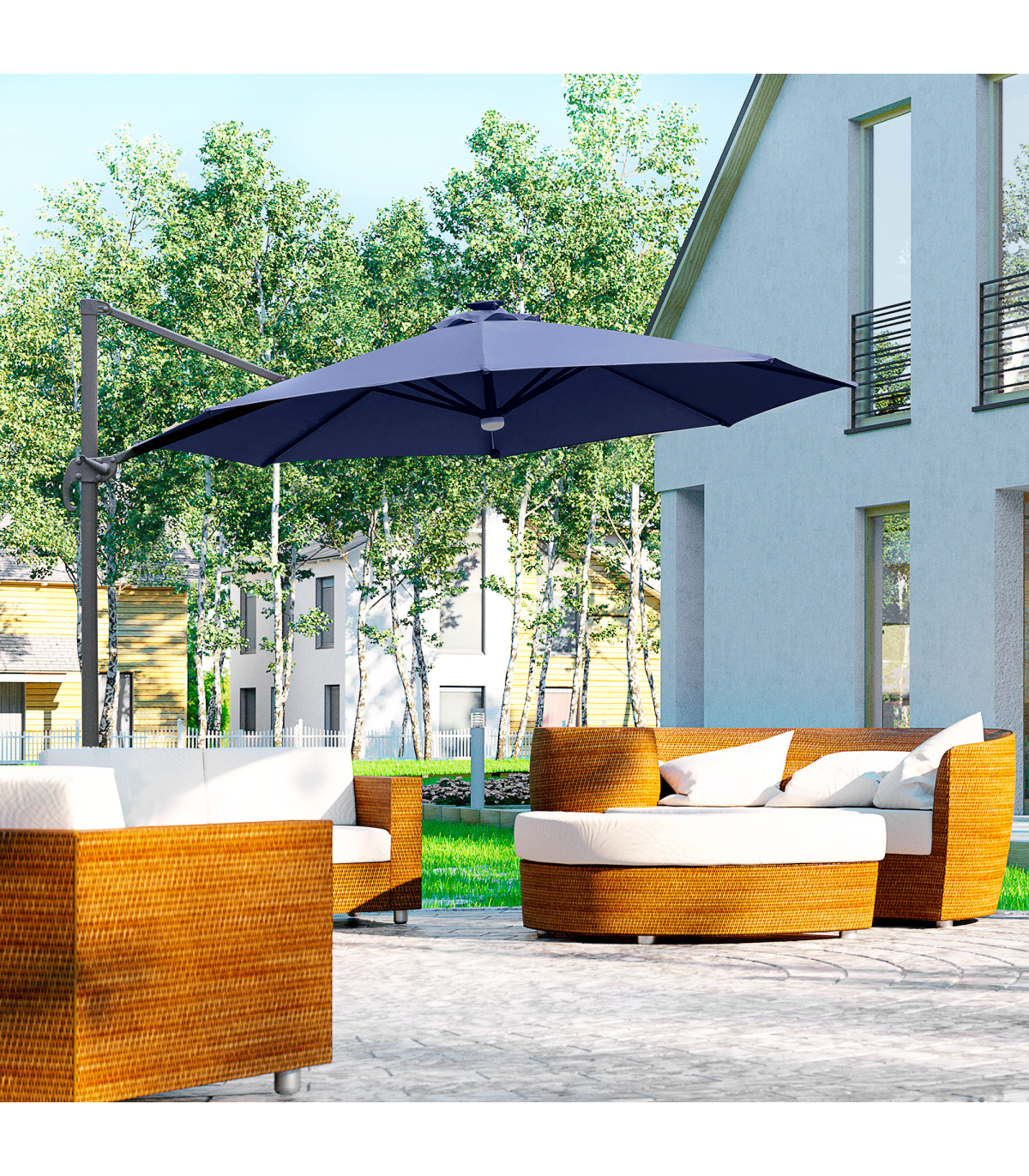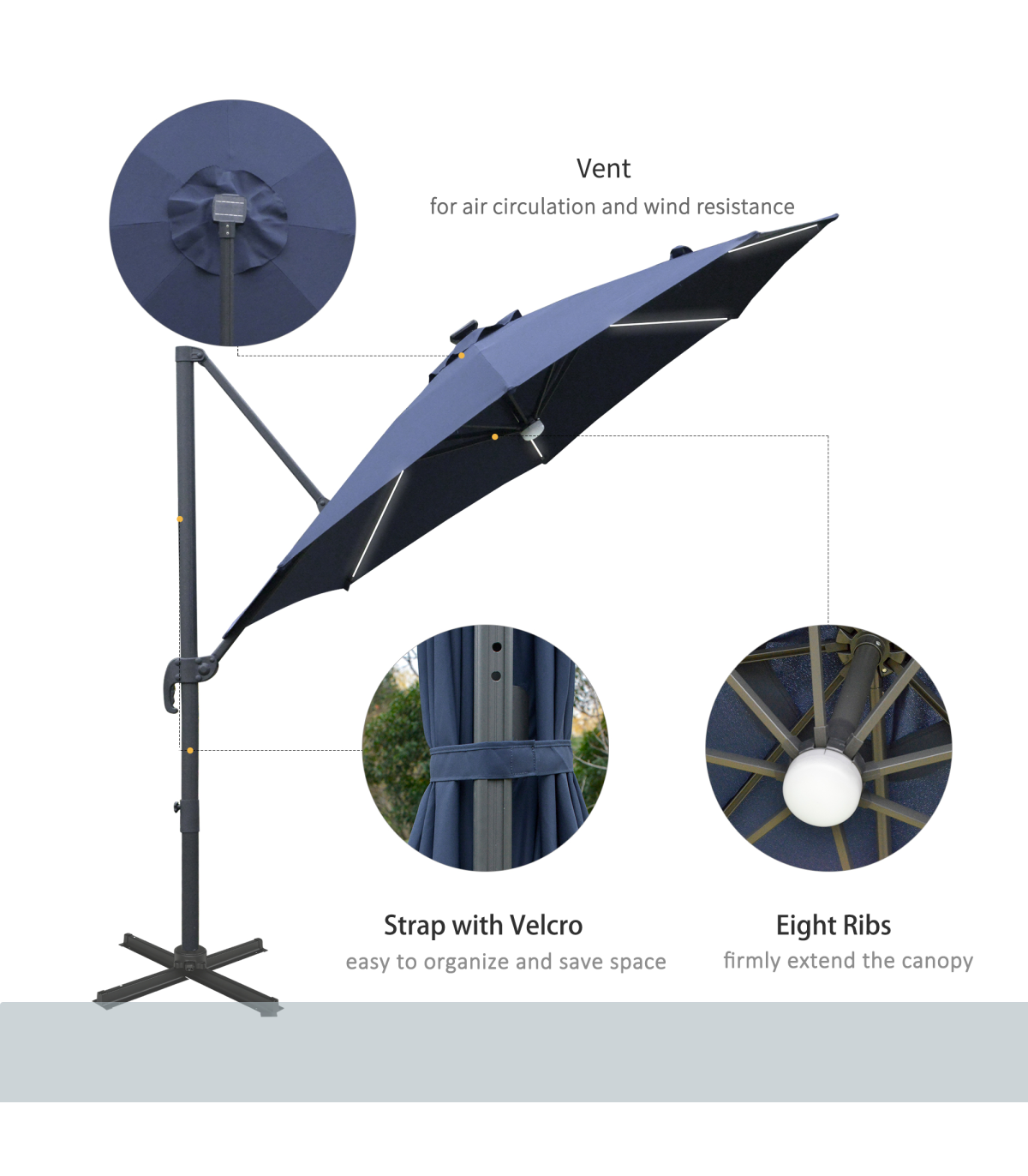 - "Sun safety in the day and beautiful illumination at night. Welcome this cantilever parasol from Outsunny into your home to transform your garden memories. There are LED lights scattered on the support ribs, controlled by a switch: you can radiate your outdoors at night. The large polyester canopy can be adjusted to four different angles and swivels 360° so you can keep protected from the sun at practically any angle. The aluminium structure is sturdy and durable and it's fitted with a crank handle to open and close the canopy easily. Comes with a cross base - weights are required."