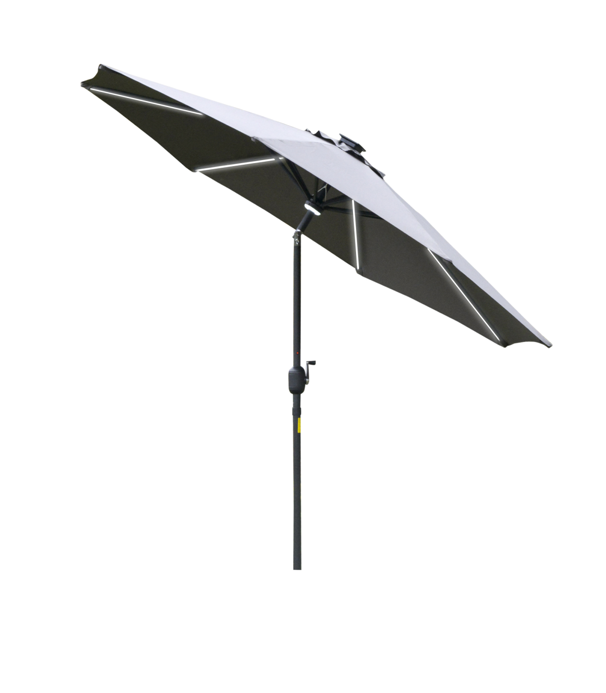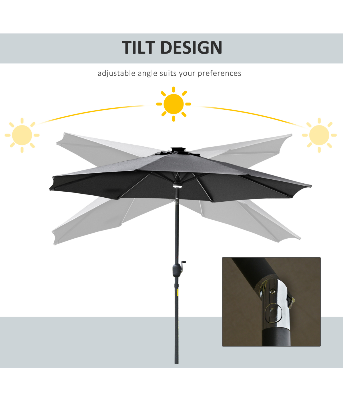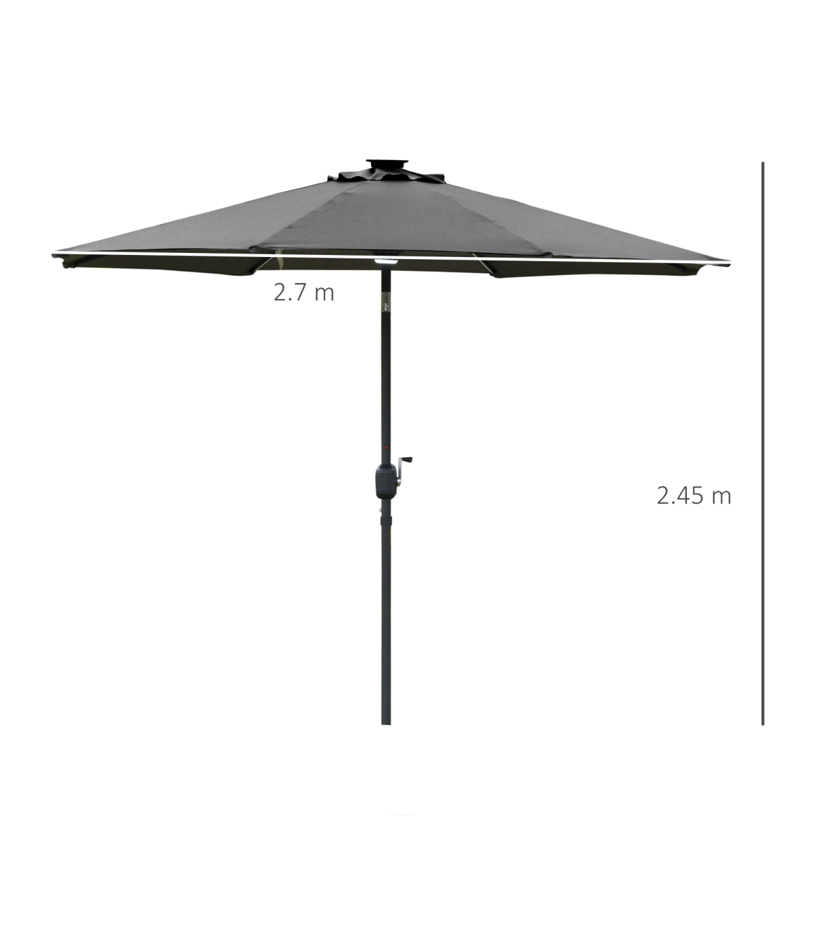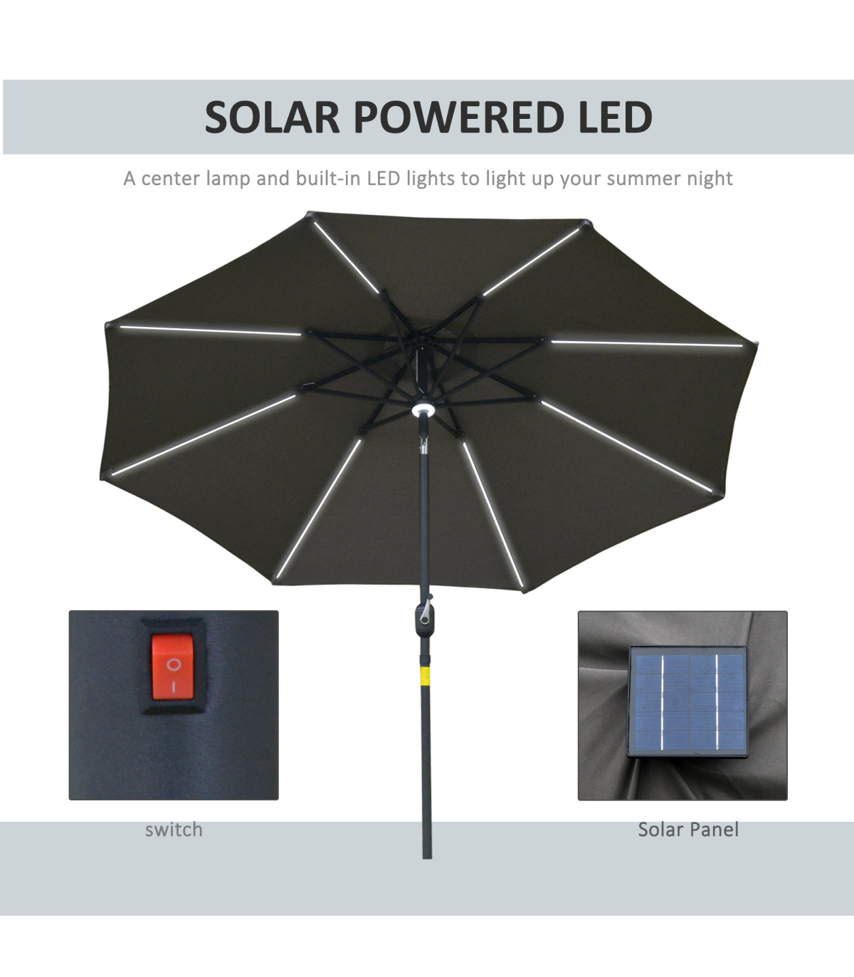 Keep yourself protected whilst enjoying the sun all day long with this sun umbrella from Outsunny. The polyester canopy provides protection from direct sunlight and heat. Using a crank mechanism for effortless opening and closing, the umbrella pole can be easily tilted to maximize your shade. Powered by panel solar, the LED lights on the ribs can provide you more lights at night. The perfect blend of beauty and function.