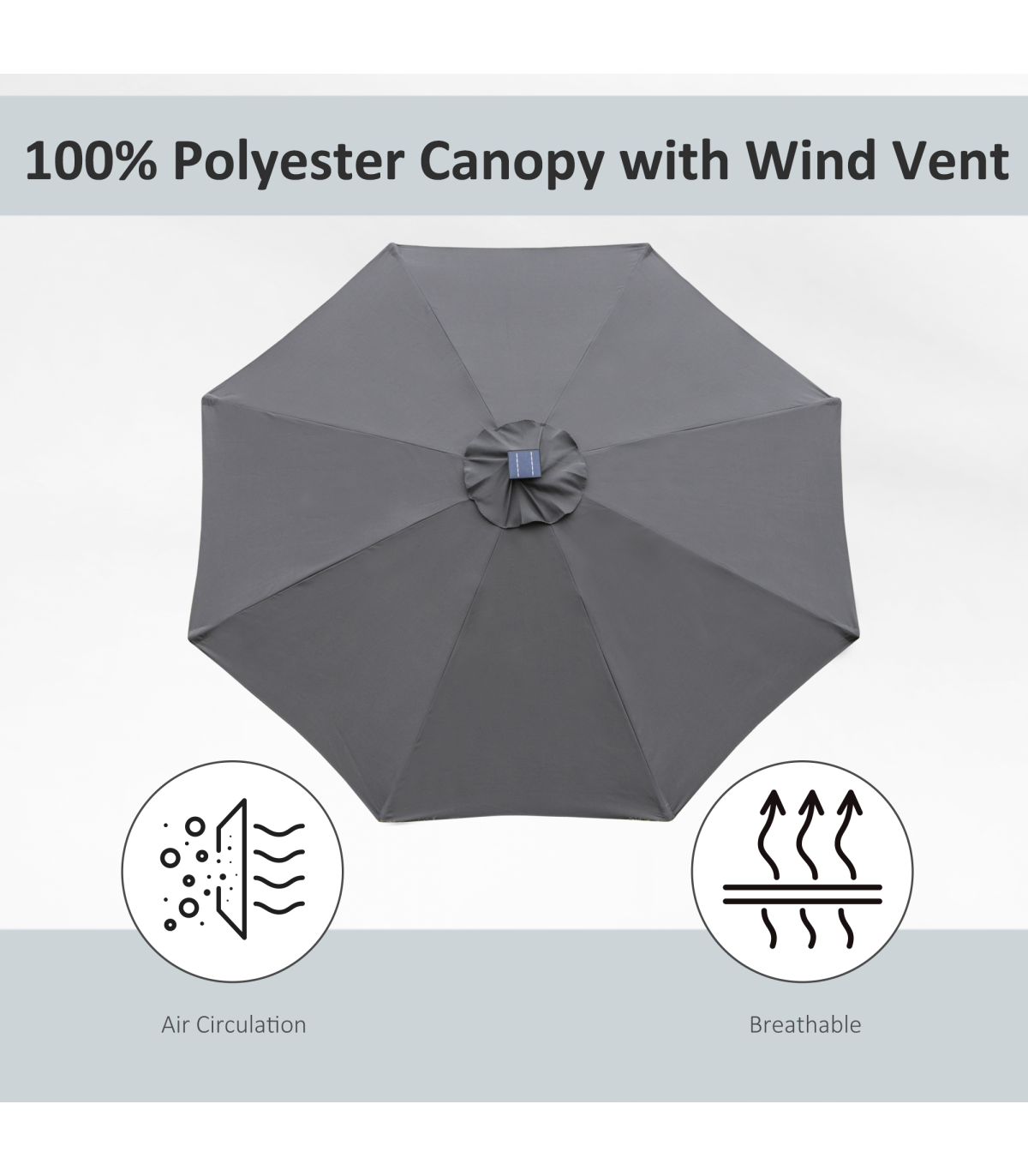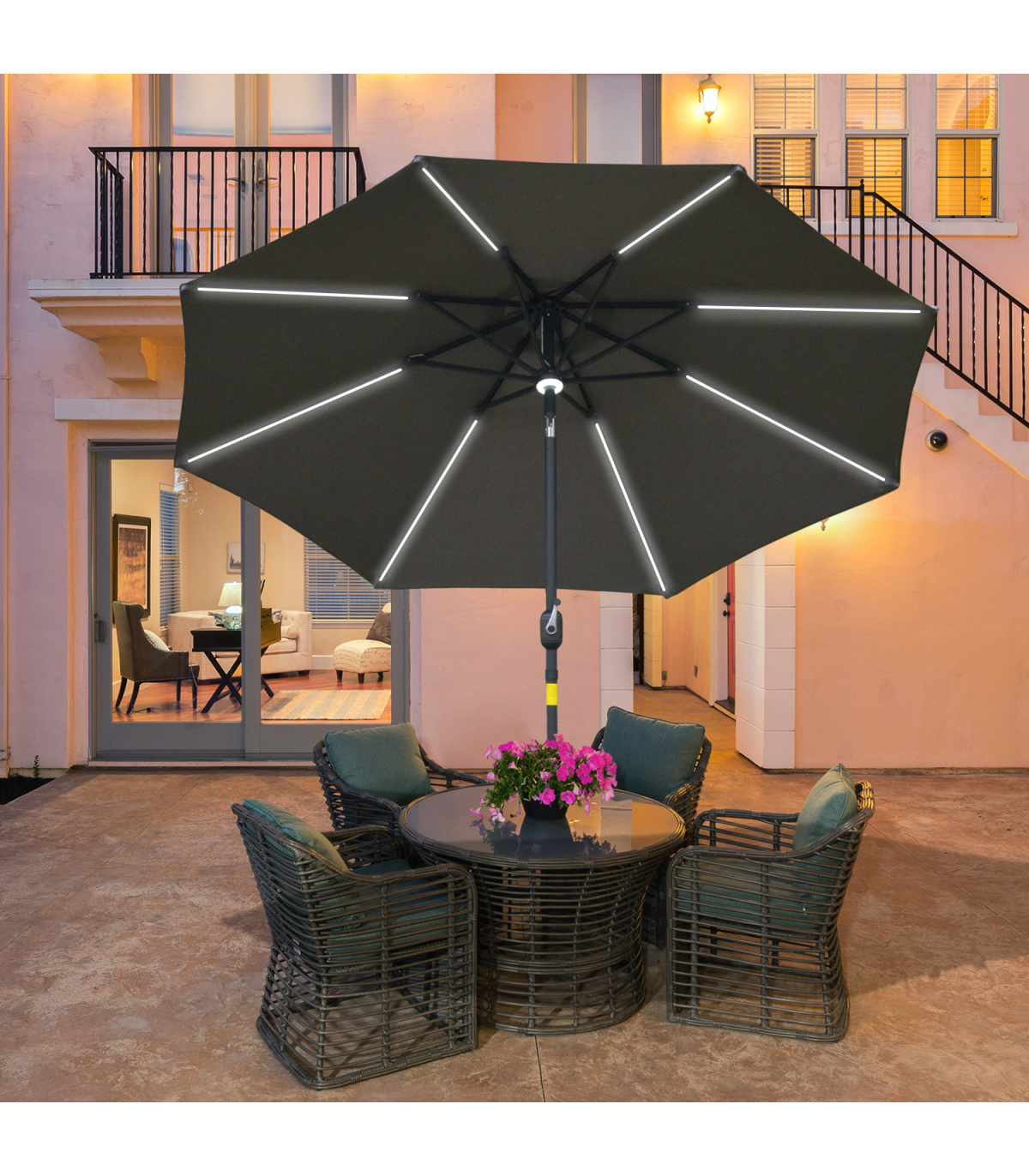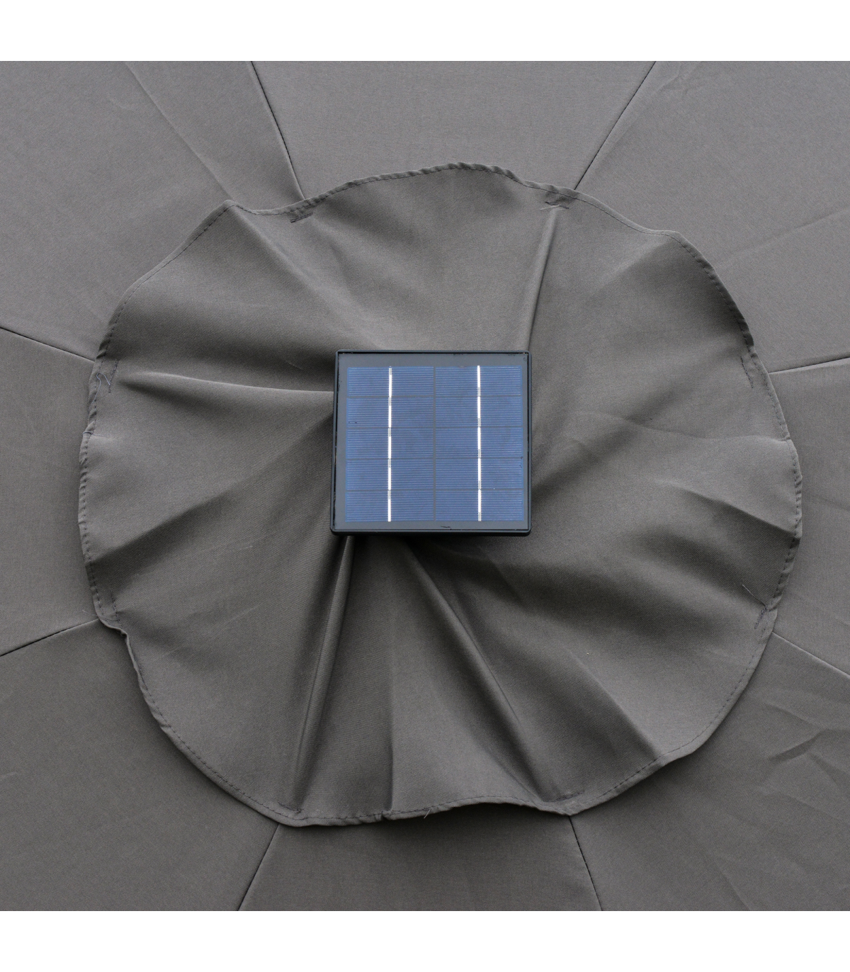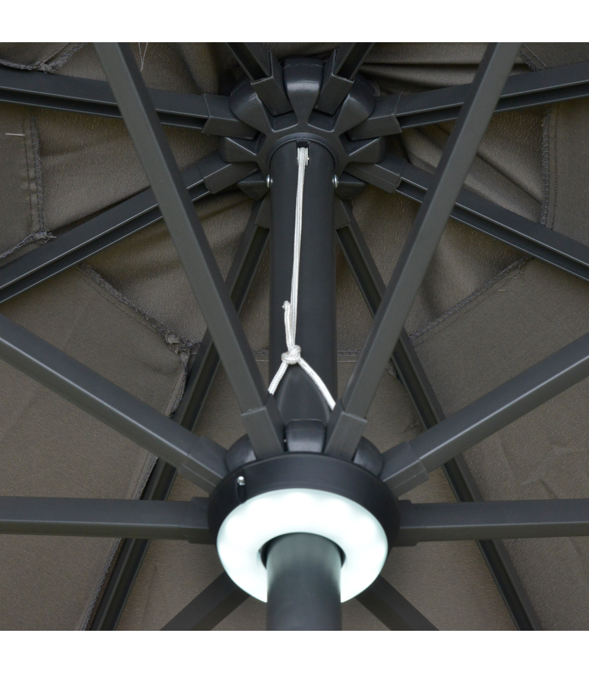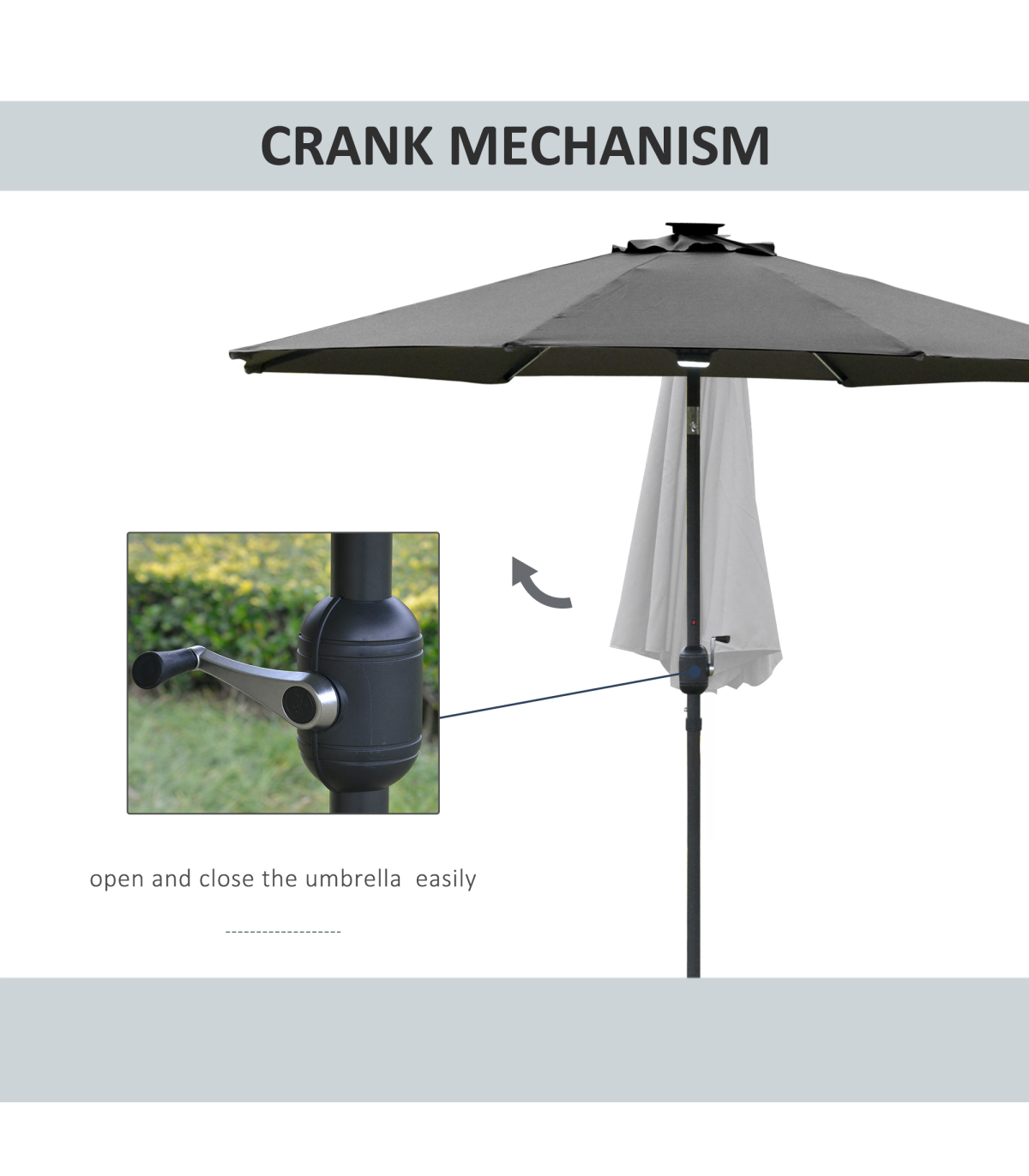 Keep yourself protected whilst enjoying the sun all day long with this sun umbrella from Outsunny. The polyester canopy provides protection from direct sunlight and heat. Using a crank mechanism for effortless opening and closing, the umbrella pole can be easily tilted to maximize your shade. Powered by panel solar, the LED lights on the ribs can provide you more lights at night. The perfect blend of beauty and function.