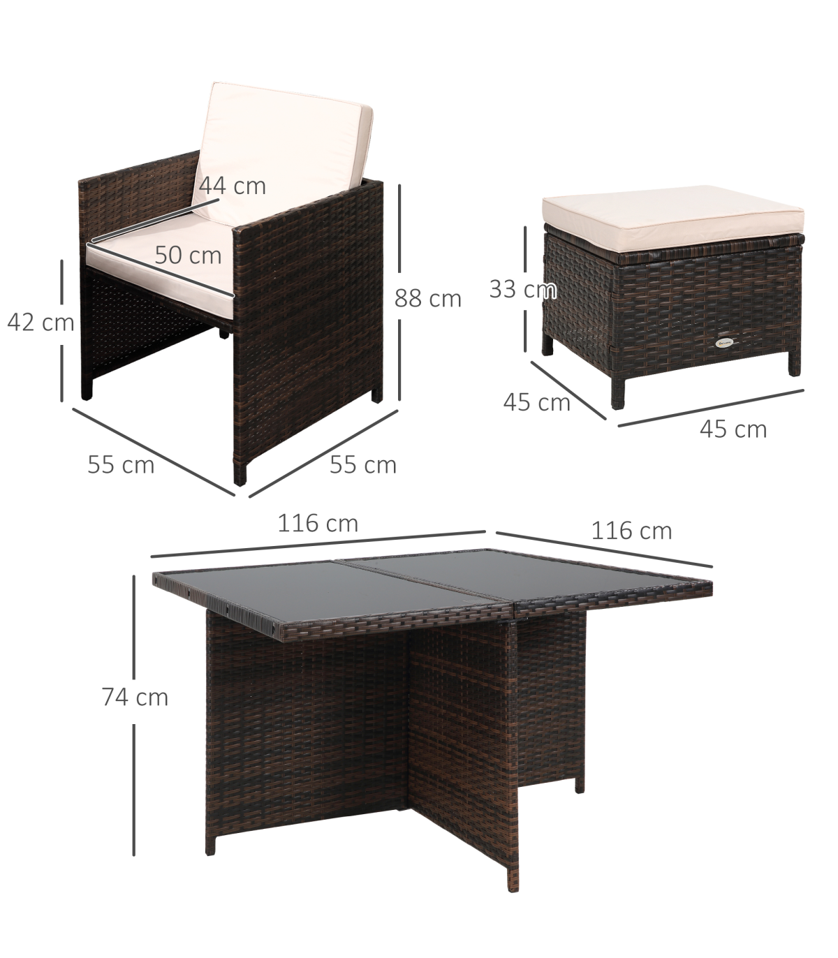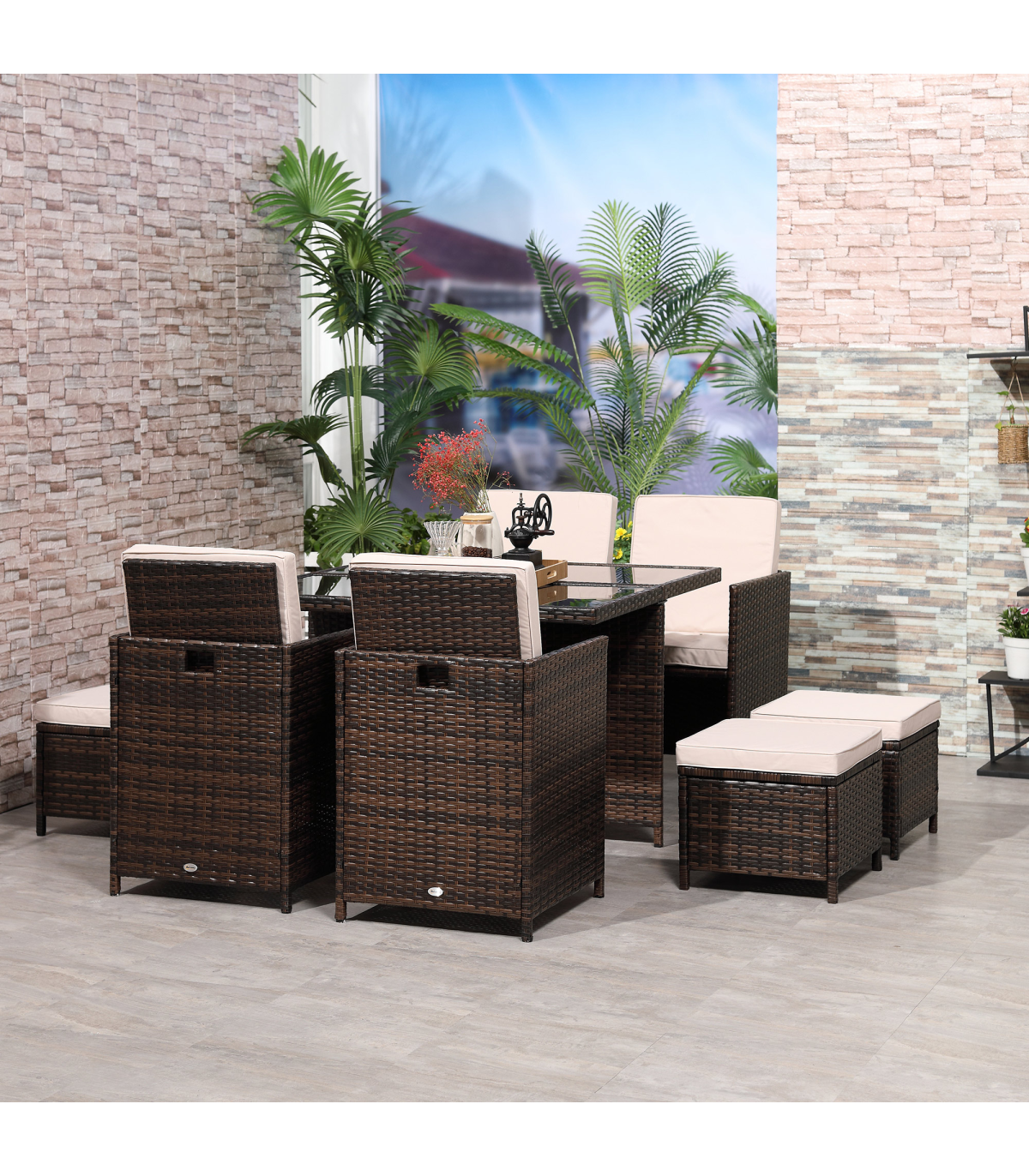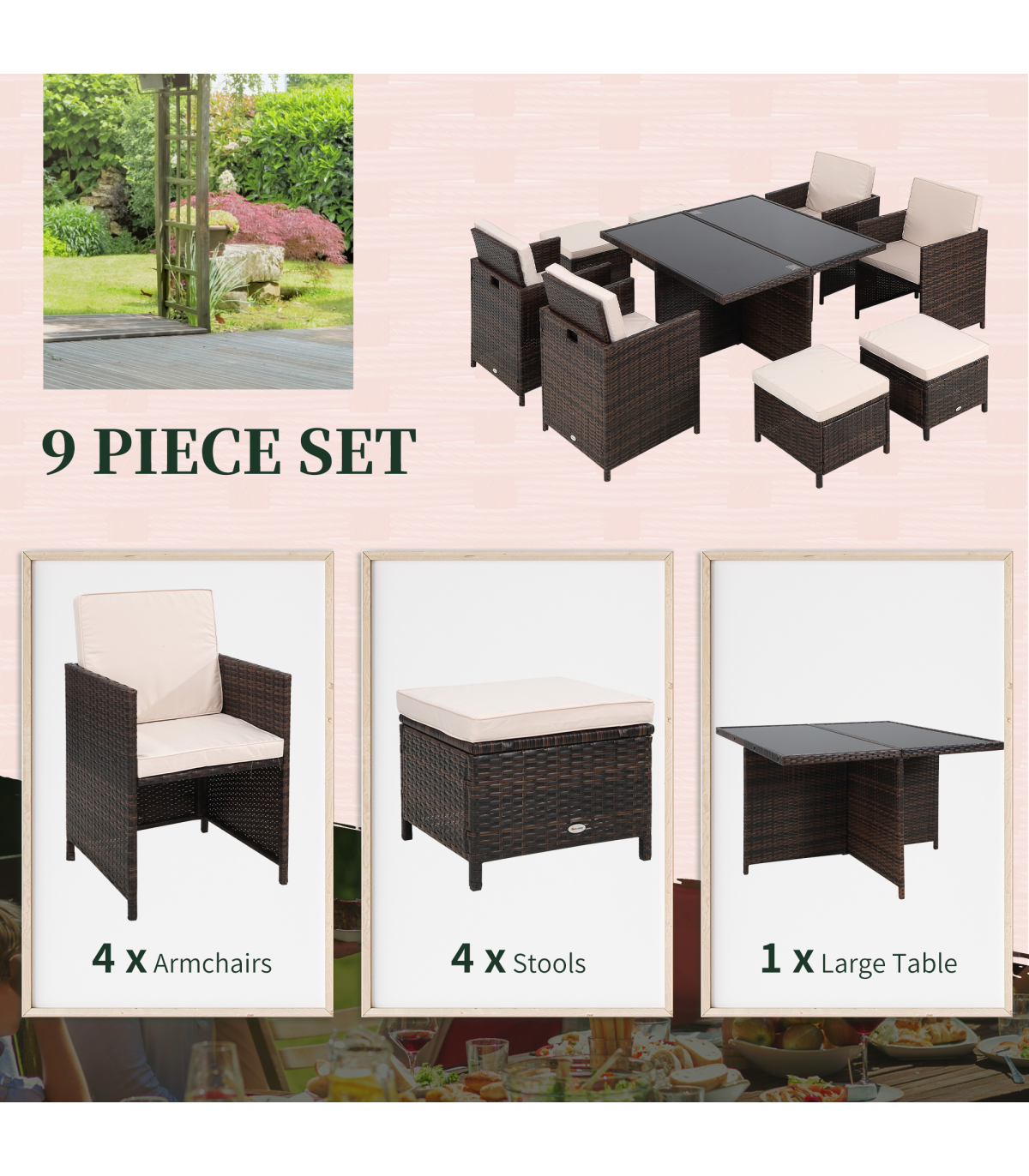 9PC Rattan Garden Furniture Set 8 Wicker Dining Chairs Footrest Table" Description: The Outsunny 9-piece outdoor wicker dining set with cushions is suitable for any occasion. The elegant rattan dining set includes: - 1 table - 4 armchairs - 4 footrests Made of aluminium frame and PE rattan, the wicker and tempered glass table combination looks fashionable and creates a modern style for your living area. Features: - 9 pieces rattan dining set includes 1 table, 4 chairs and 4 footrests - Made of high quality aluminium frame and PE rattan in sturdy build for long lasting use - Deep armchairs with soft padded cushion to provide cozy seating experience - 5 mm tempered glass table top makes this wicker dining set fashionable - Detachable zippered cushion cover made of 180g/? polyester are machine washable - Chairs can be concealed under the table for space saving when not in use - Suitable for both indoor and outdoor use all year round