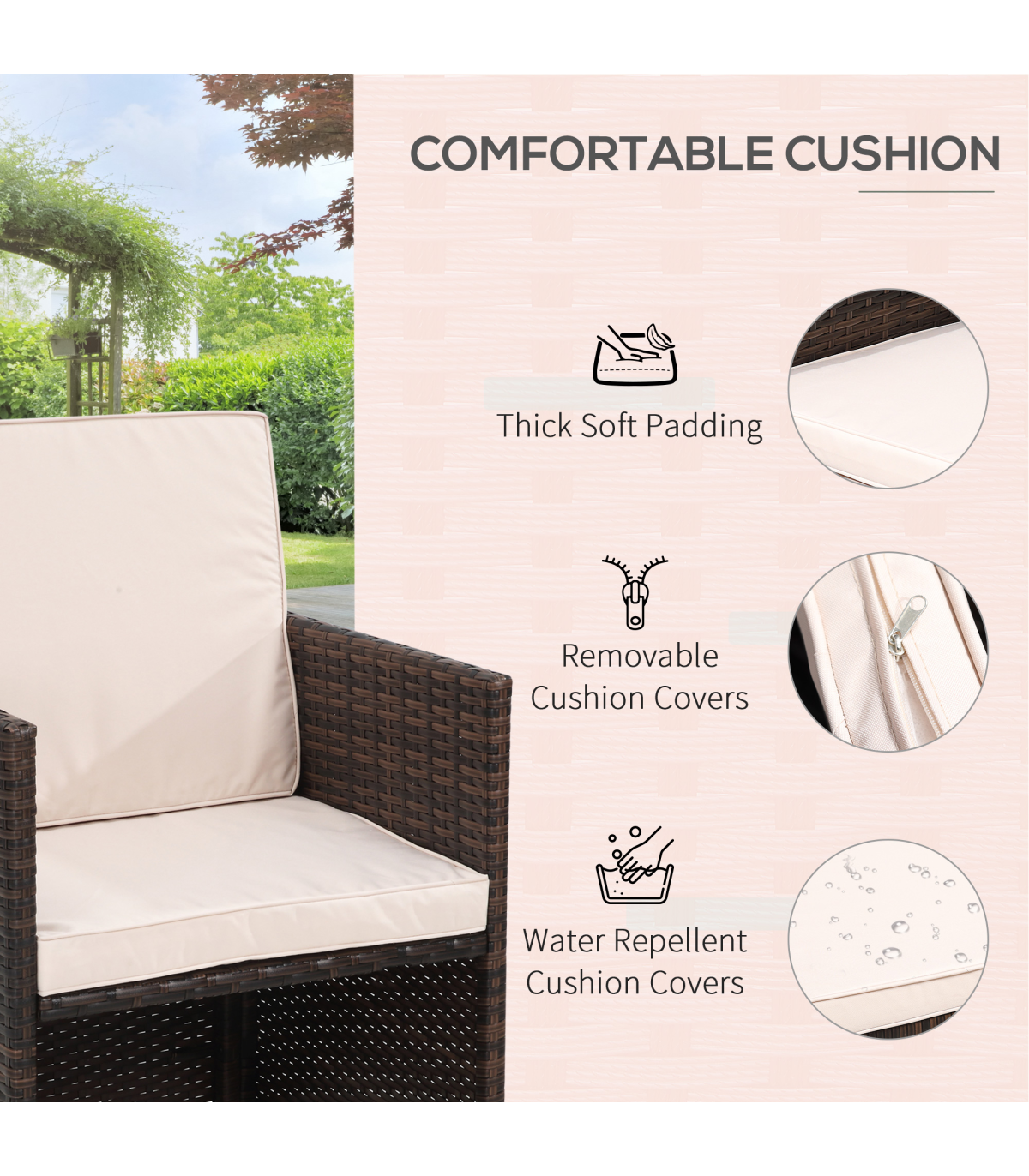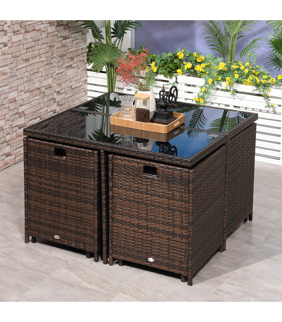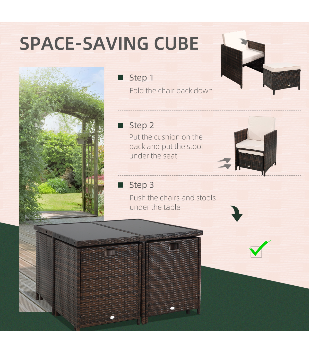 9PC Rattan Garden Furniture Set 8 Wicker Dining Chairs Footrest Table" Description: The Outsunny 9-piece outdoor wicker dining set with cushions is suitable for any occasion. The elegant rattan dining set includes: - 1 table - 4 armchairs - 4 footrests Made of aluminium frame and PE rattan, the wicker and tempered glass table combination looks fashionable and creates a modern style for your living area. Features: - 9 pieces rattan dining set includes 1 table, 4 chairs and 4 footrests - Made of high quality aluminium frame and PE rattan in sturdy build for long lasting use - Deep armchairs with soft padded cushion to provide cozy seating experience - 5 mm tempered glass table top makes this wicker dining set fashionable - Detachable zippered cushion cover made of 180g/? polyester are machine washable - Chairs can be concealed under the table for space saving when not in use - Suitable for both indoor and outdoor use all year round