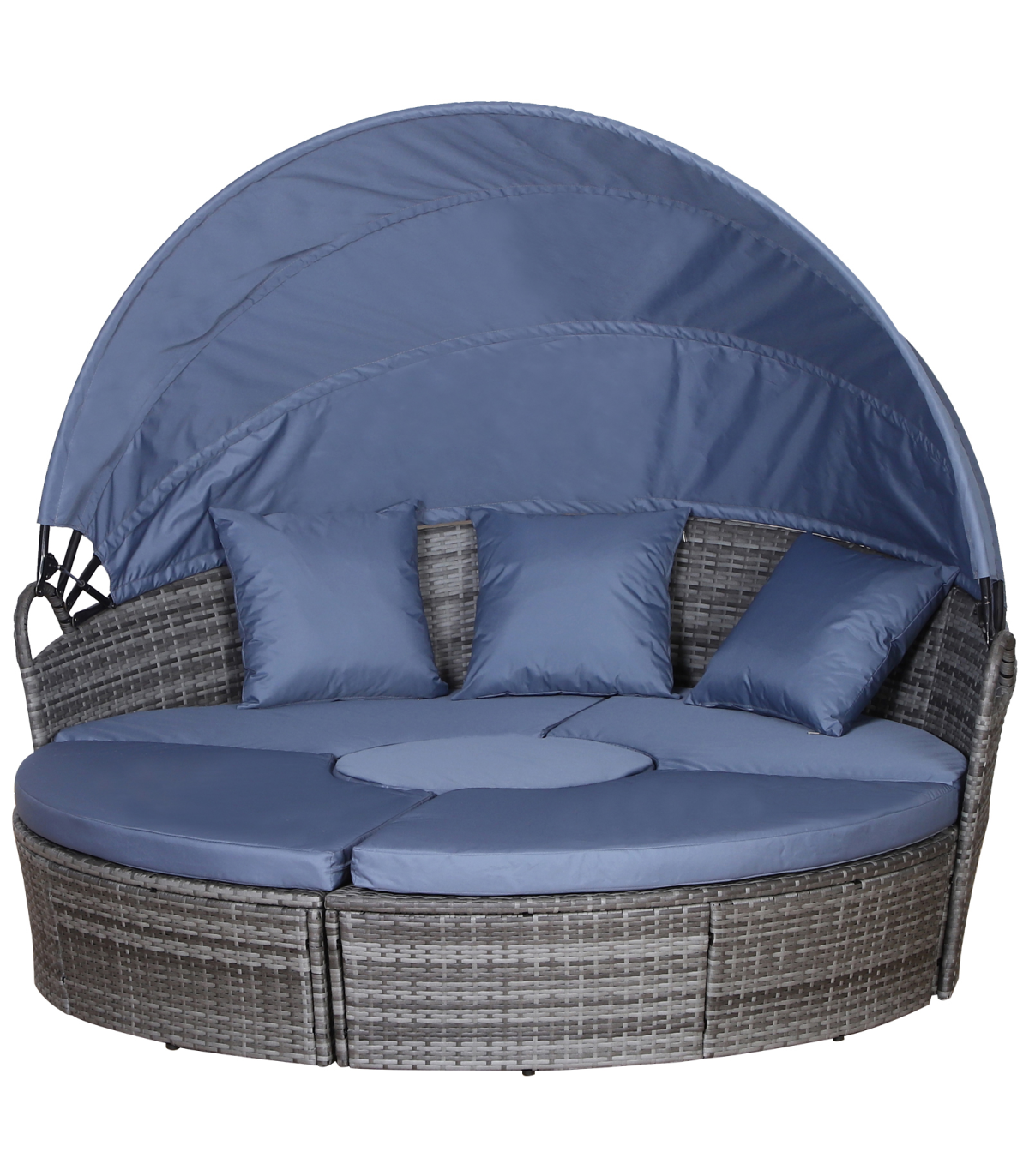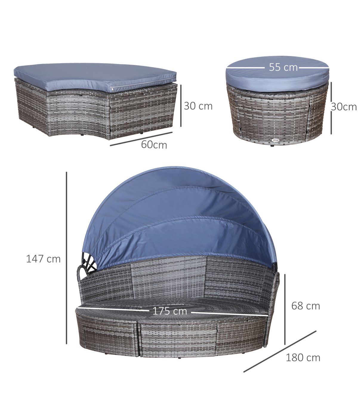 A traditional outdoor item with a unique touch. Introducing this sun bed from Outsunny: a hybrid of rattan loungers in the form of a giant bed. It consists of five different pieces - two quarter round chairs, two quarter round chairs with backs, and a small round chair. The large size design provides plenty of room to relax with friends or enjoy a sunny afternoon alone.