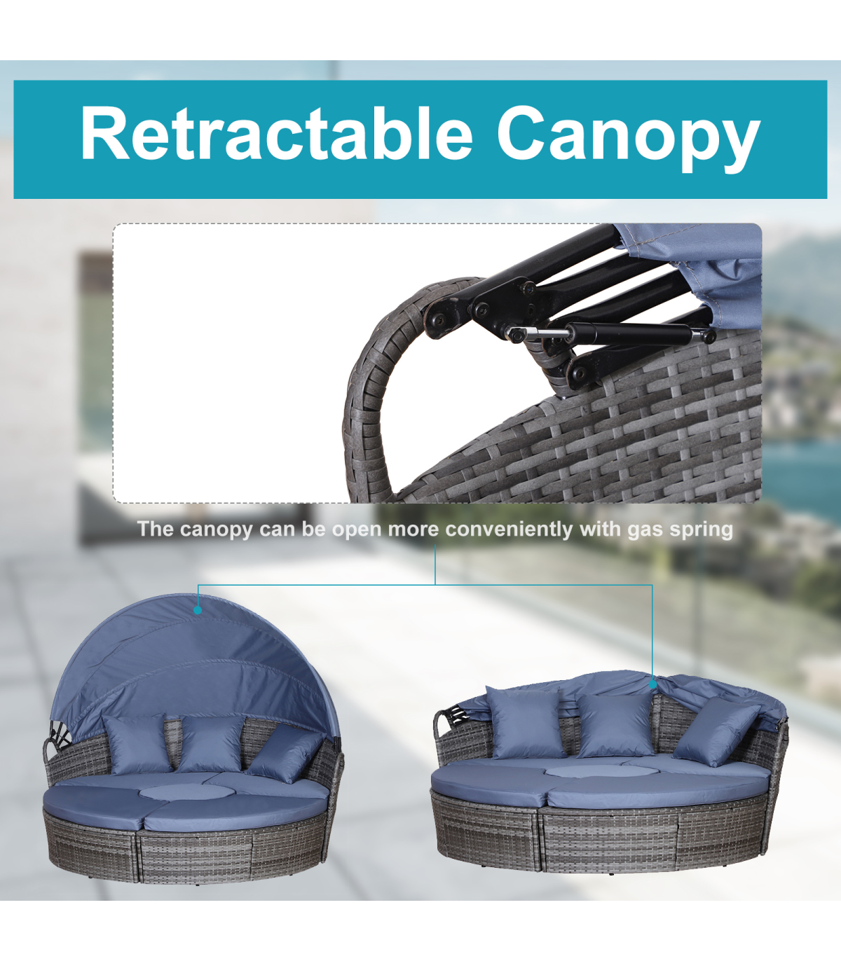 The base frame is made of metal, providing a strong and sturdy structure. Each piece is wrapped with PE rattan, offering extra protection against light weather and creating a smooth surface that is easy to clean and maintain. Thick and plush cushions are placed on each seat for added comfort, and the removable and washable covers allow for easy cleaning. The bed is finished with a large overhead canopy, providing protection from sun glare and wind. Overall, this innovative design will make it hard for you to get out of.