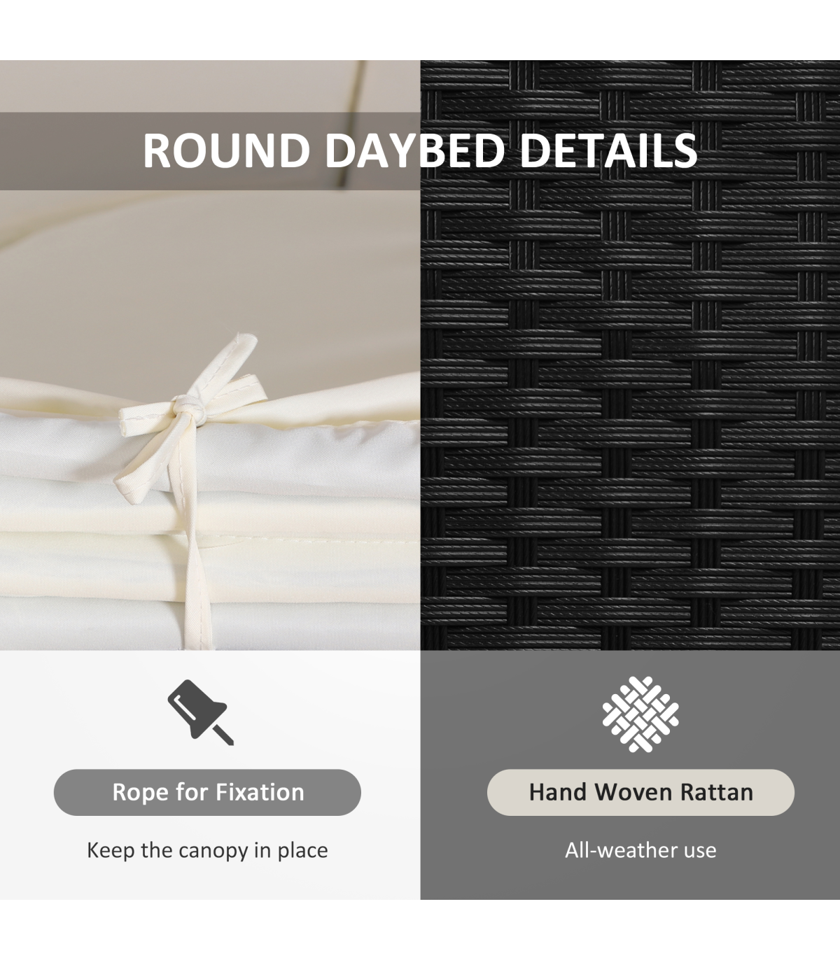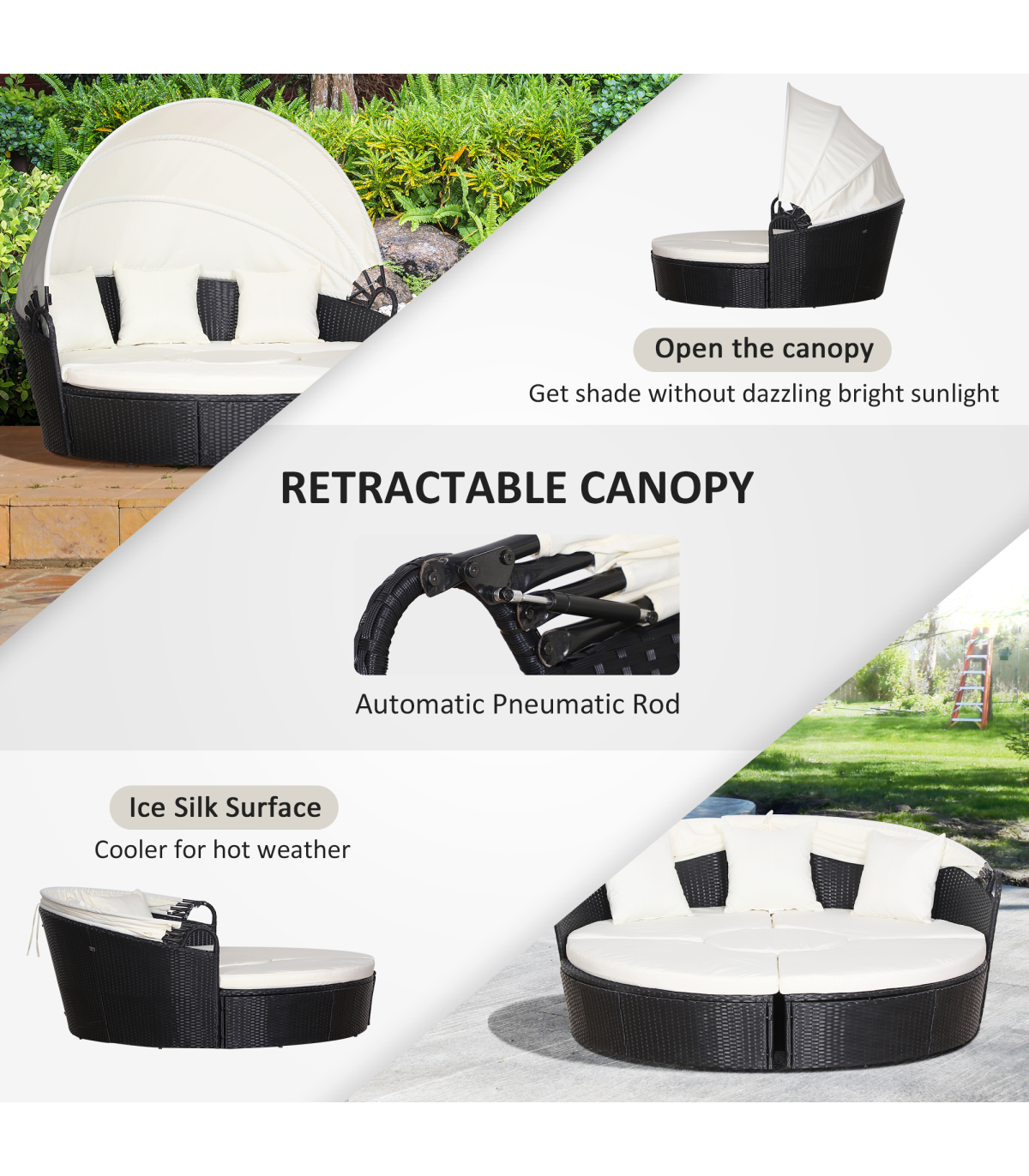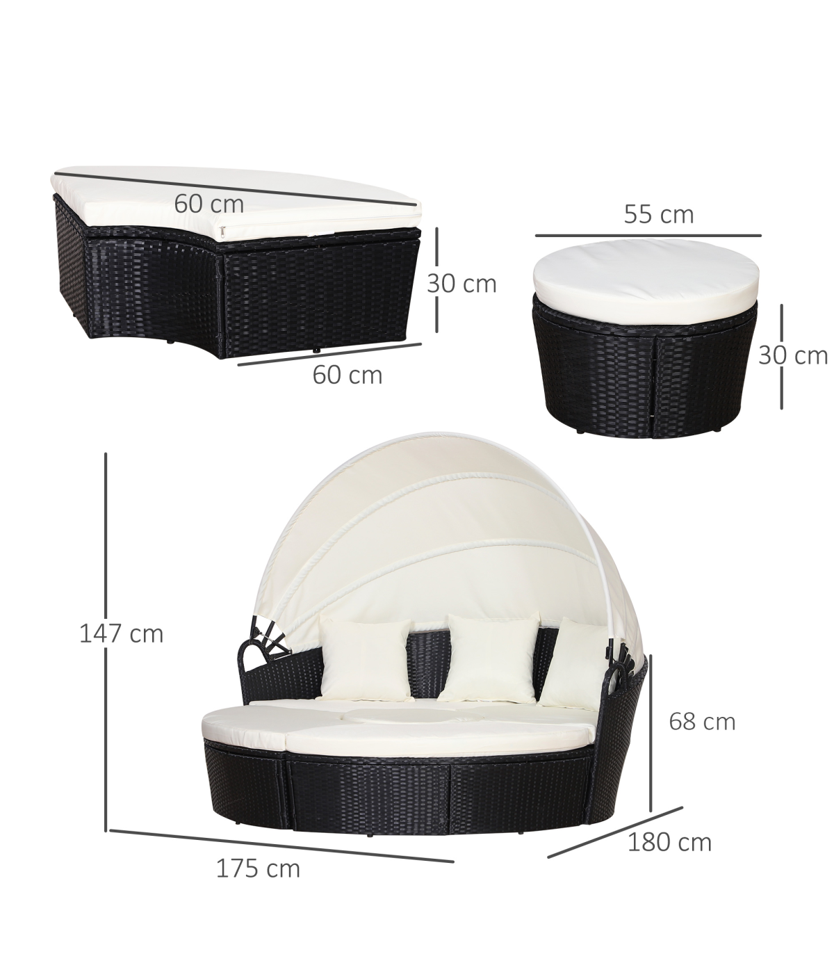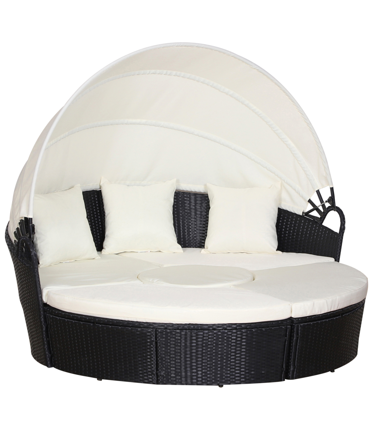 5-Piece Outdoor Plastic Rattan Wicker Round Sofa Bed Coffee Table Sectional Set" Description: A traditional outdoor item with a unique touch. Introducing this sun bed from Outsunny: a hybrid of rattan loungers in the form of a giant bed. It consists of five different pieces - two quarter round chairs, two quarter round chairs with backs, and a small round chair. The large size design provides plenty of room to relax with friends or enjoy a sunny afternoon alone. The base frame is made of metal, providing a strong and sturdy structure. Each piece is wrapped with PE rattan, offering extra protection against light weather and creating a smooth surface that is easy to clean and maintain. Thick and plush cushions are placed on each seat for added comfort, and the removable and washable covers allow for easy cleaning. The bed is finished with a large overhead canopy, providing protection from sun glare and wind. Overall, this innovative design will make it hard for you to get out of. Features: - Large outdoor bed formed of two quarter chairs, two quarter chairs with backs, and a round stool chair - Metal under-frame for a sturdy structure, with PE rattan wrapped around for double the strength and resilience against weathering and damage - Retractable overhead canopy to block out sun and rain for peaceful rest - Thick cushions on the seats for comfort, with removable covers that can be washed for hygiene - Adjustable feet for continual balance and stability - Unique design for relaxing comfortably by yourself or with friends in your garden and outdoors - Maximum load: 160kg - Assembly required
