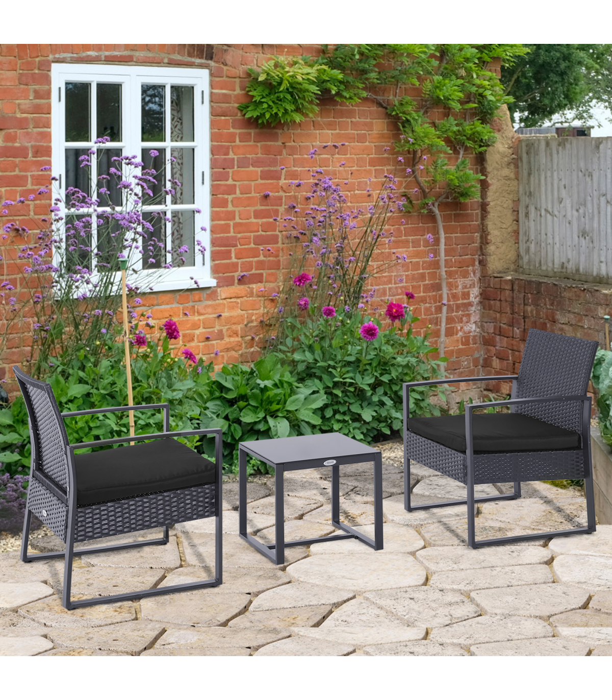 3 Pieces Rattan Dining Set Patio Bistro Table Chair Conversation Set Description: This three-piece outdoor dining set from Outsunny is the perfect blend of style meets functionality. Made from high quality, hand woven PE wicker rattan with a solid metal frame underneath, this chair and table set is weather-resistant and highly durable. With a padded cushion and high-rise back and arms, each chair is extremely comfortable to provide you hours of relaxation time. Featuring a thick glass top, the table is easy to clean and maintain and will not stain, keeping it looking fresh for years to come. It's ideal for catching up with a friend over coffee in the summer heat. Features: - Three-piece outdoor Rattan set including a table and two matching chairs - Metal framing underneath for strength and durability - Thick tempered glass on top of table - Padded cushions and high backrests on chairs - Easy to clean and maintain - Assembly required
