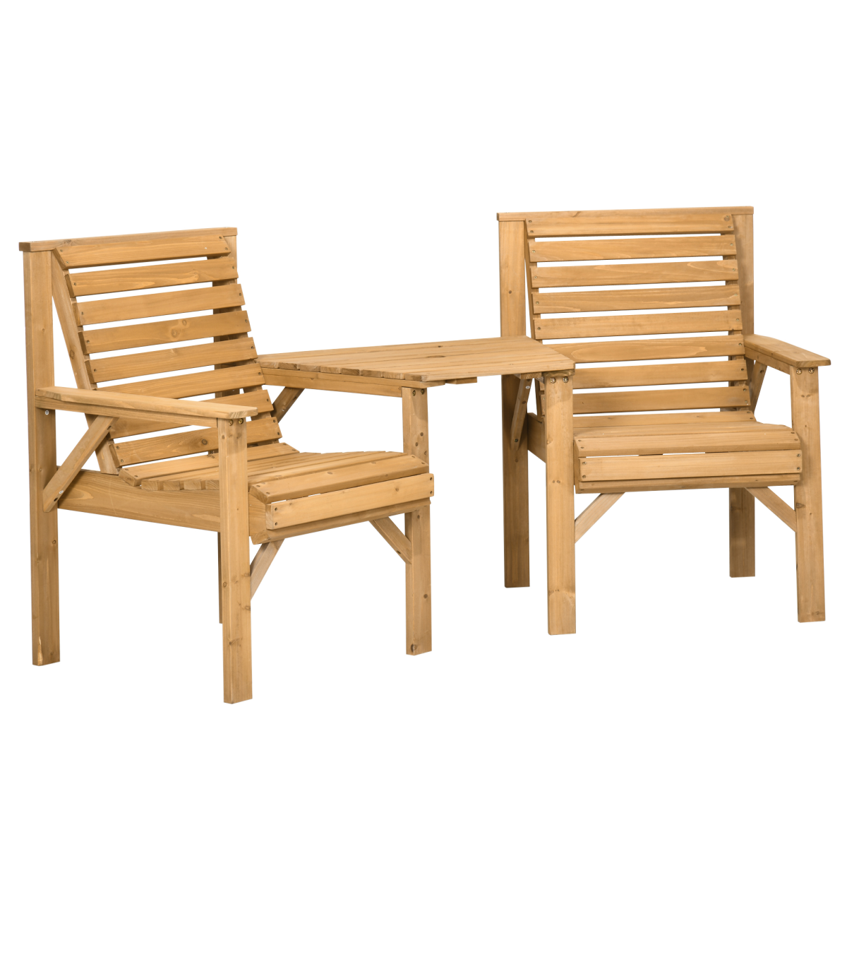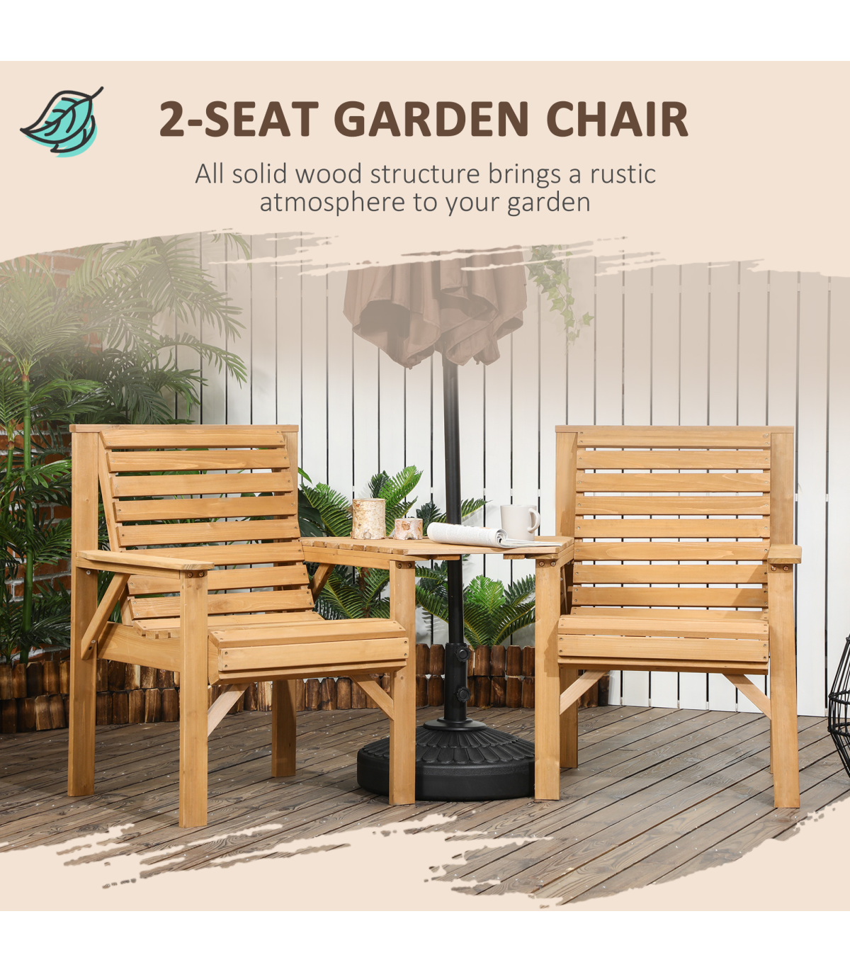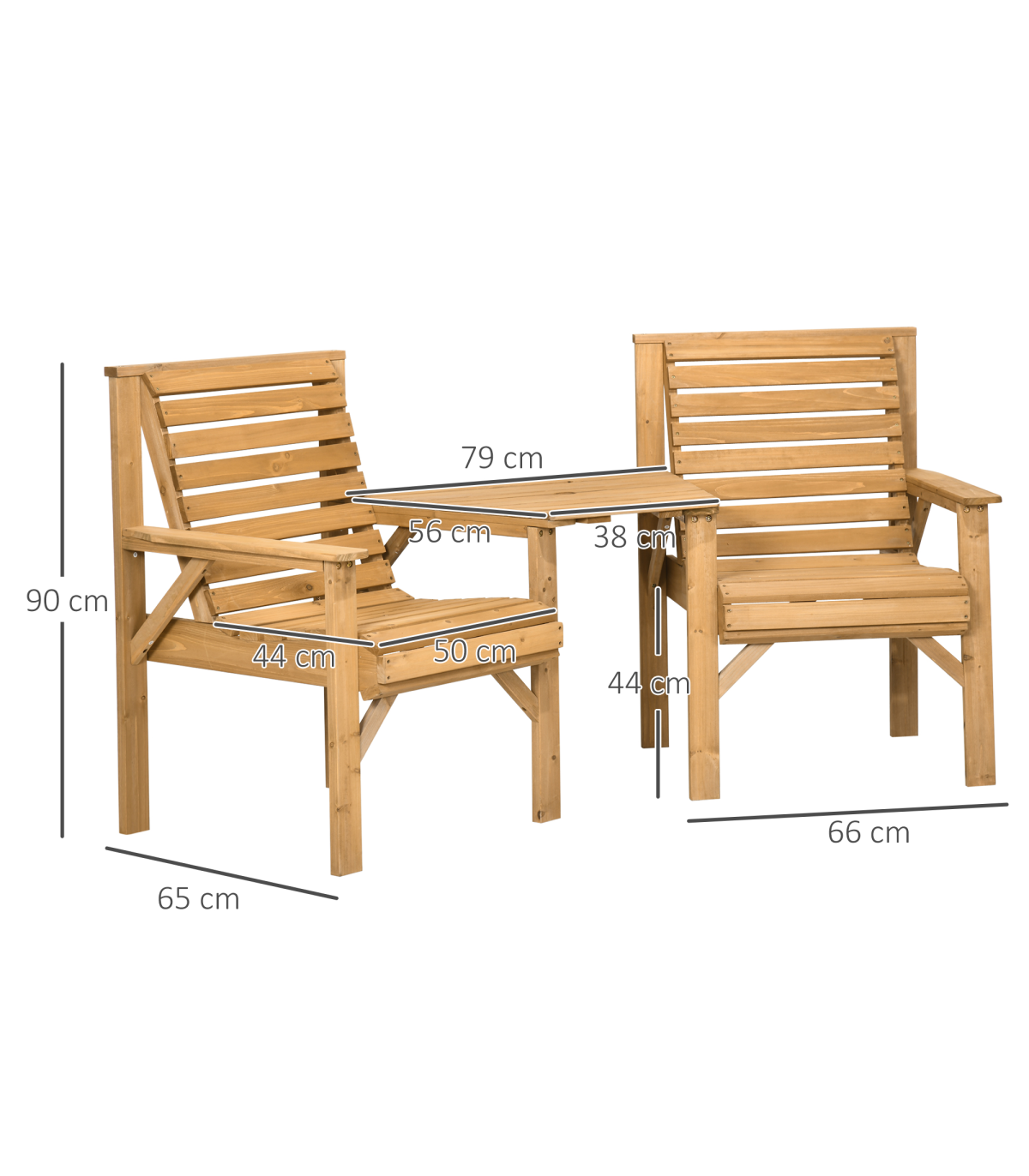 Two-seat: A combined design, this companion bench means you can relax with company right next to you.Table with parasol hole: Relax on this garden loveseat protected by shade. e6cm fits most Outsunny garden umbrellas. In addition, you can take off the table top, so you can use it as two separate chairs.Wooden garden seat: Made from fir wood, this is a sturdy piece which is suitable for outdoor use.Natural finish: Leave this wooden garden chair duo how it is, or customise to how you want. Versatile garden seating.Dimensions: 90H x 66W x 65Dcm. Table: 3H x 38/79W x 56Dcm. Seat: 44H x 50W x 44Dcm. Maximum load: Table: 50kg. Single seat: 130kg. Assembly required.