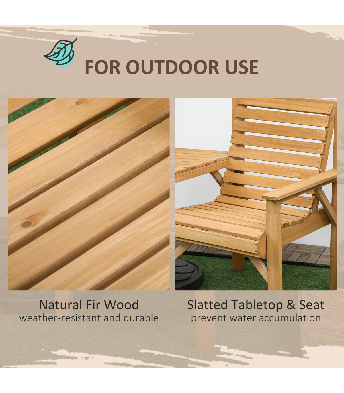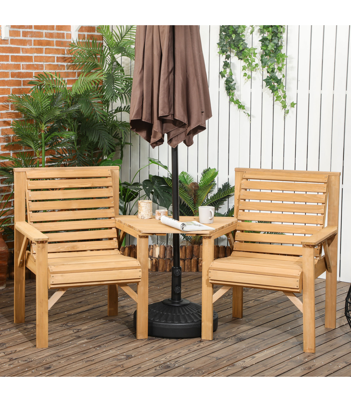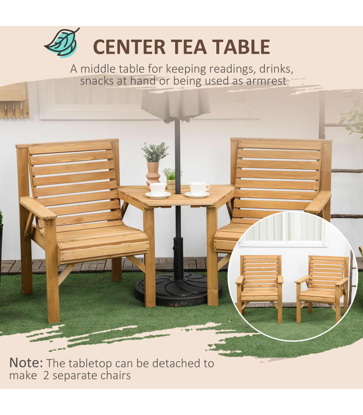 Two-seat: A combined design, this companion bench means you can relax with company right next to you.Table with parasol hole: Relax on this garden loveseat protected by shade. e6cm fits most Outsunny garden umbrellas. In addition, you can take off the table top, so you can use it as two separate chairs.Wooden garden seat: Made from fir wood, this is a sturdy piece which is suitable for outdoor use.Natural finish: Leave this wooden garden chair duo how it is, or customise to how you want. Versatile garden seating.Dimensions: 90H x 66W x 65Dcm. Table: 3H x 38/79W x 56Dcm. Seat: 44H x 50W x 44Dcm. Maximum load: Table: 50kg. Single seat: 130kg. Assembly required.