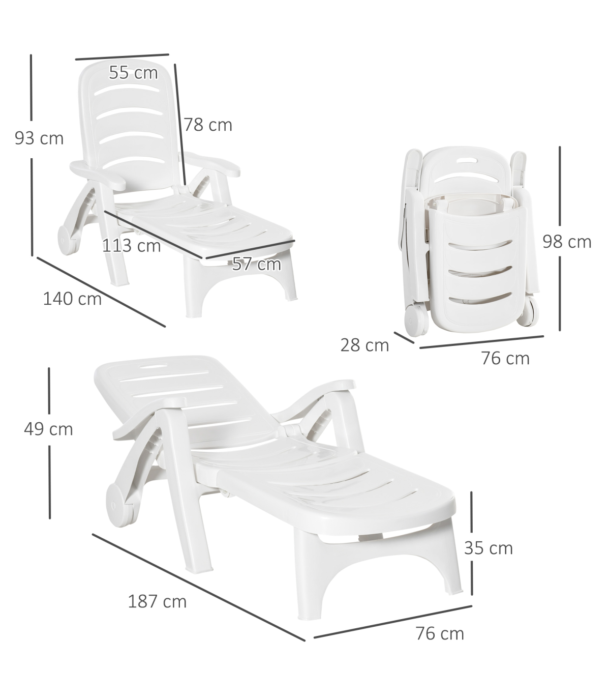 ● Overall Size: (fully reclined) 187L x 76W x 49H cm. (upright) 140L x 76W x 93H cm