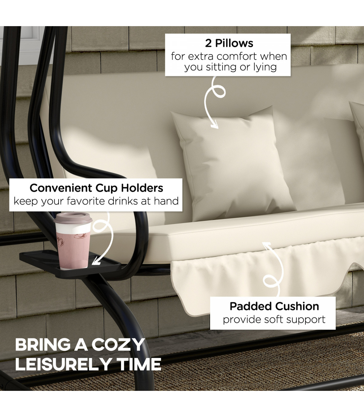 ● Seat cushion keeps you comfortable, with two pillows included
