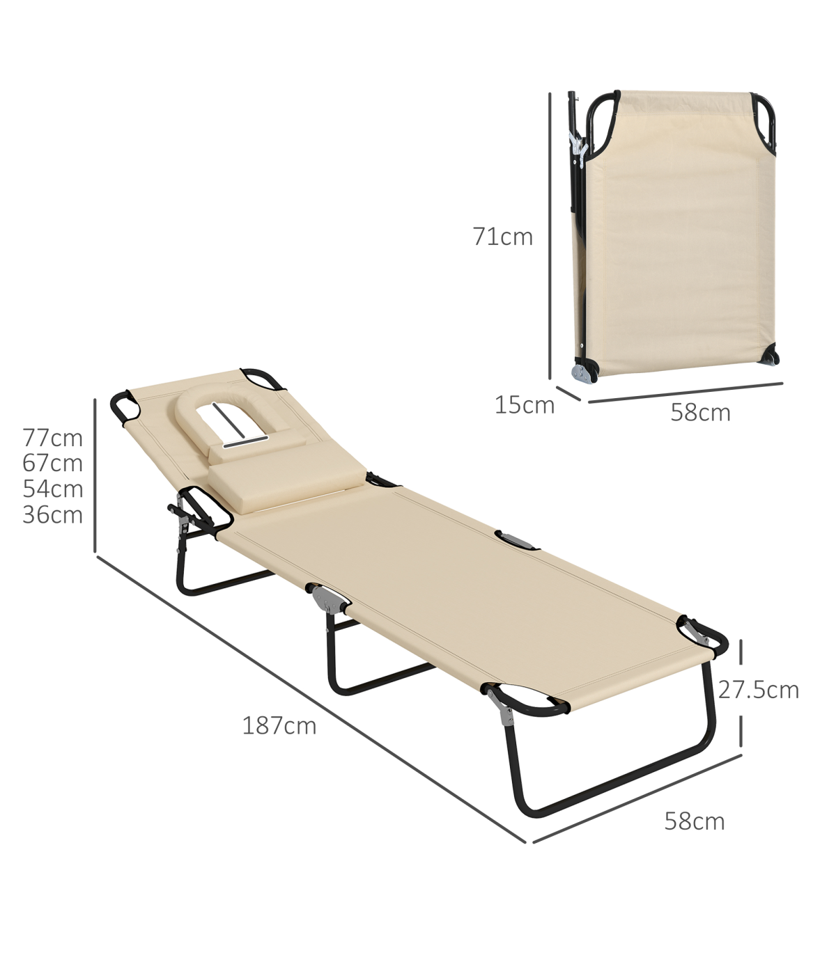 - Adjustable backrest can be locked to four different positions; - Steel frame is strong, also foldable to carry and store easily; - Padded face hole to relax on your front comfortably; - Smooth, breathable fabric seat; - Maximum load 120kg, assembly required; - Colour: Beige; - Material: Steel, Oxford Cloth; - Overall Dimensions: 187L x 58W x 36Hcm; - Foldable Size: 71L x 15W x 58Hcm; - Reading Hole Size: 20W x 15Dcm; - Weight Capacity: 120kg; - Item label: 84B-002V01BG;